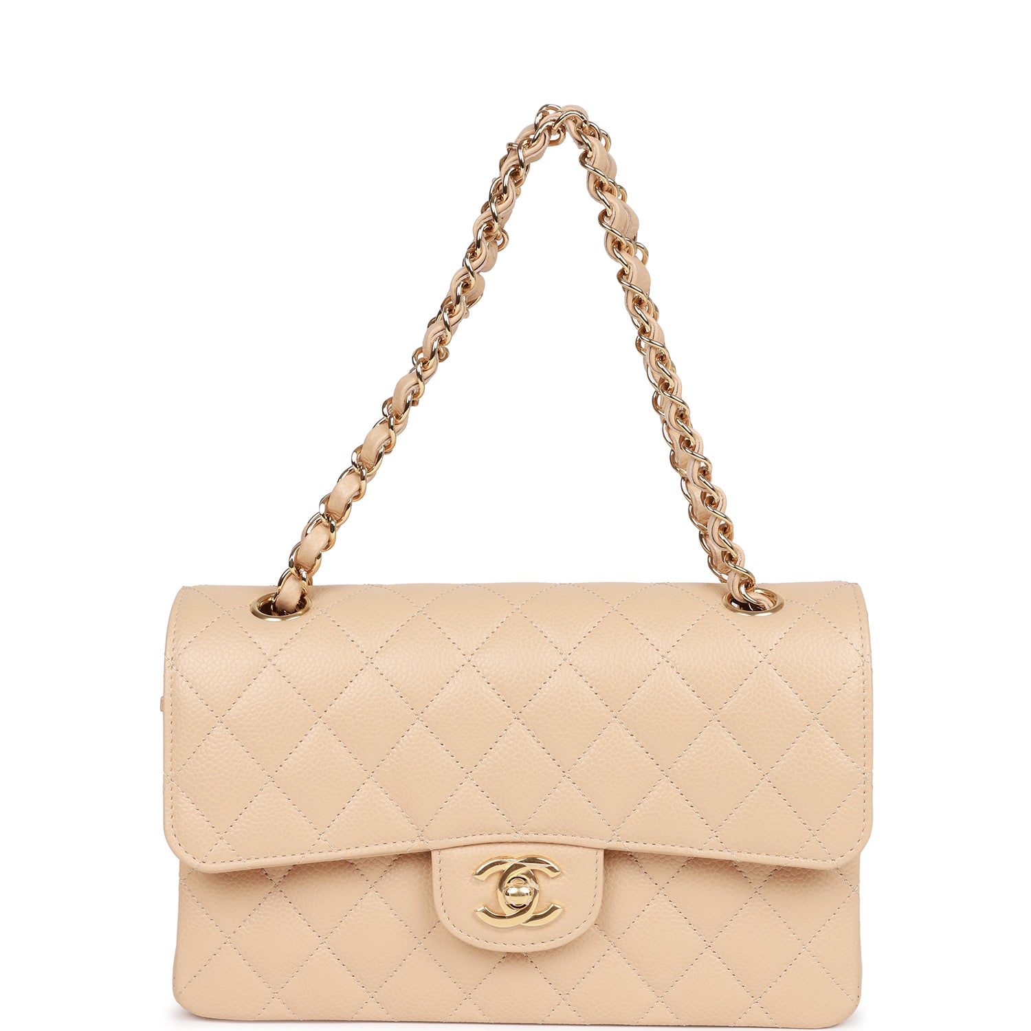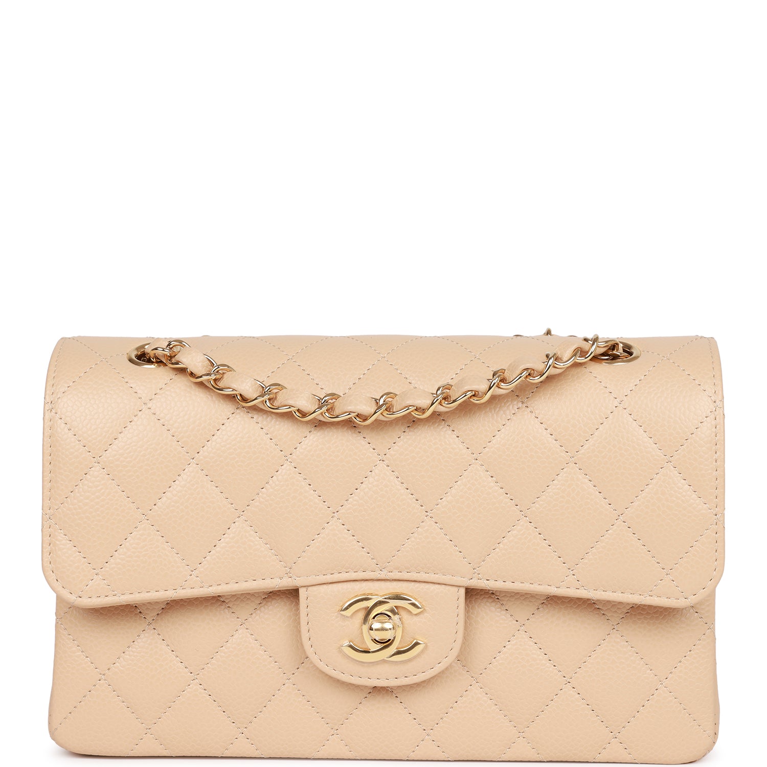 This Small Classic Double Flap bag is in beige caviar leather with light gold tone hardware and features a front flap with signature CC turnlock closure, half moon back pocket, and adjustable interwoven light gold tone chain link and dark beige leather shoulder strap.
