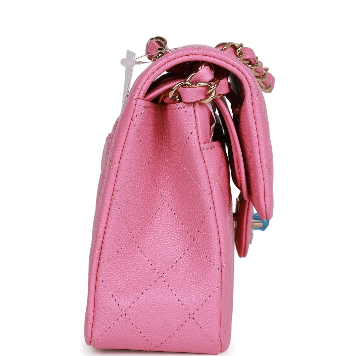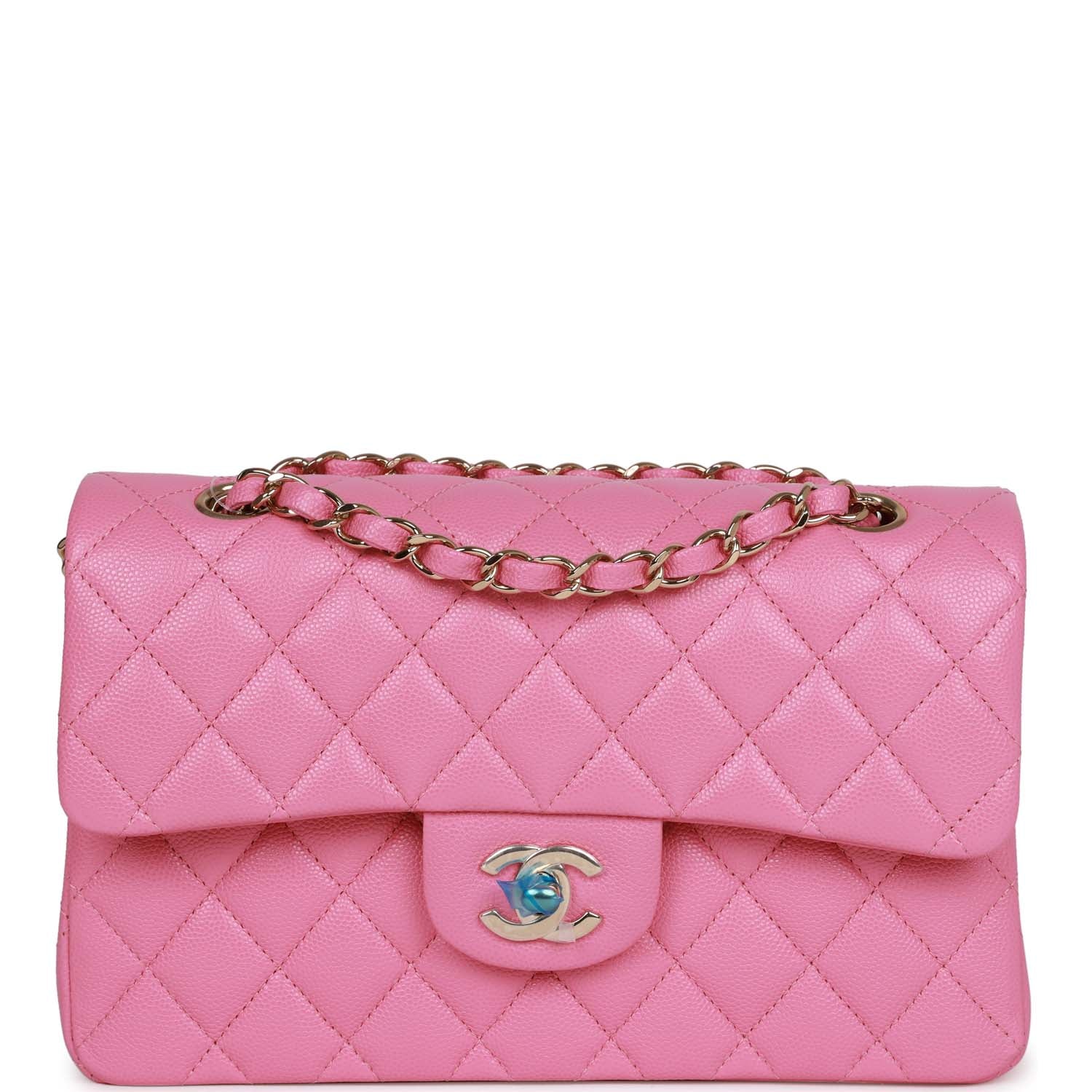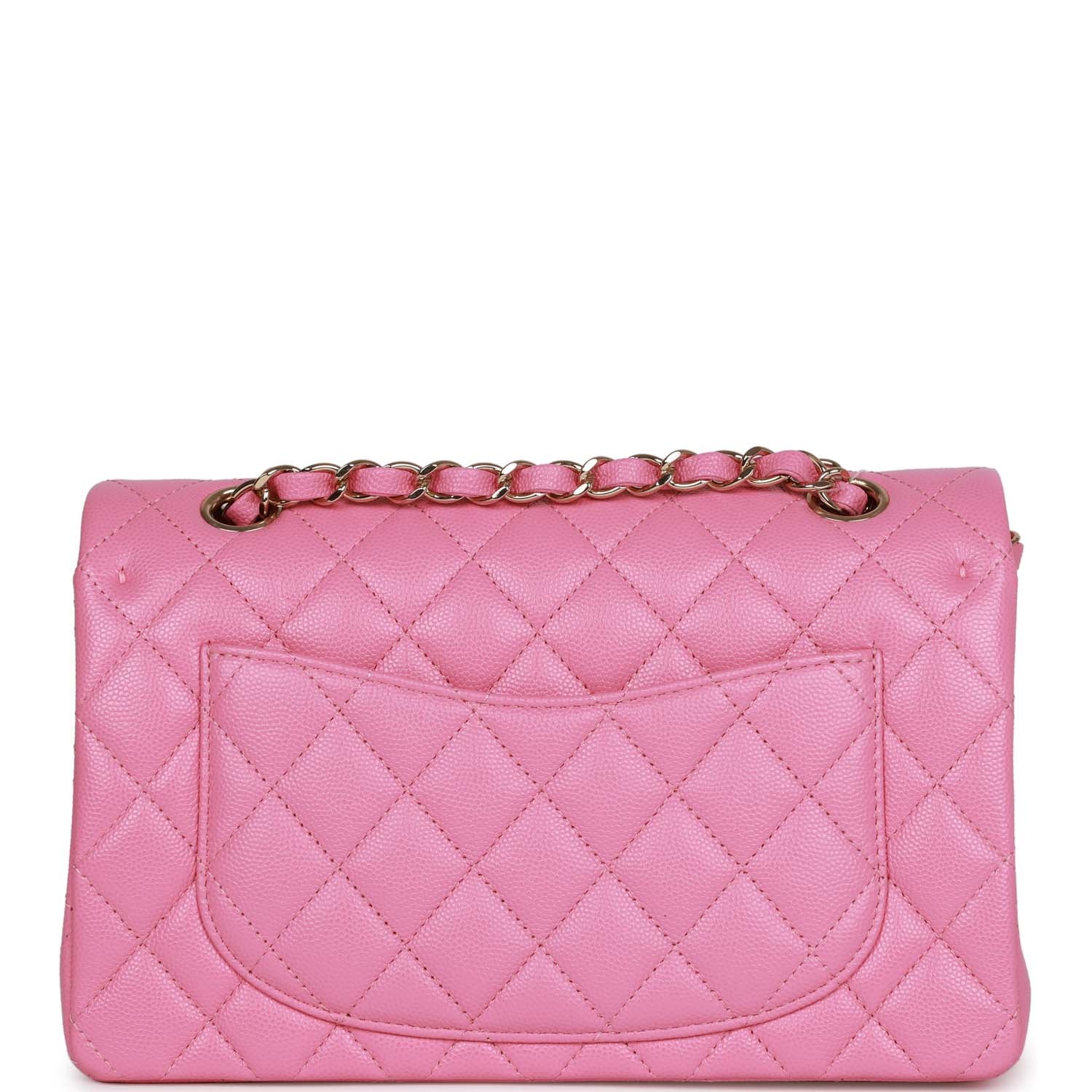 This Chanel Small Classic Flap Bag is in pink caviar leather with light gold hardware and features a front flap with CC turnlock closure, halfmoon back pocket and adjustable interwoven light gold tone chain link and pink leather shoulder/crossbody strap.