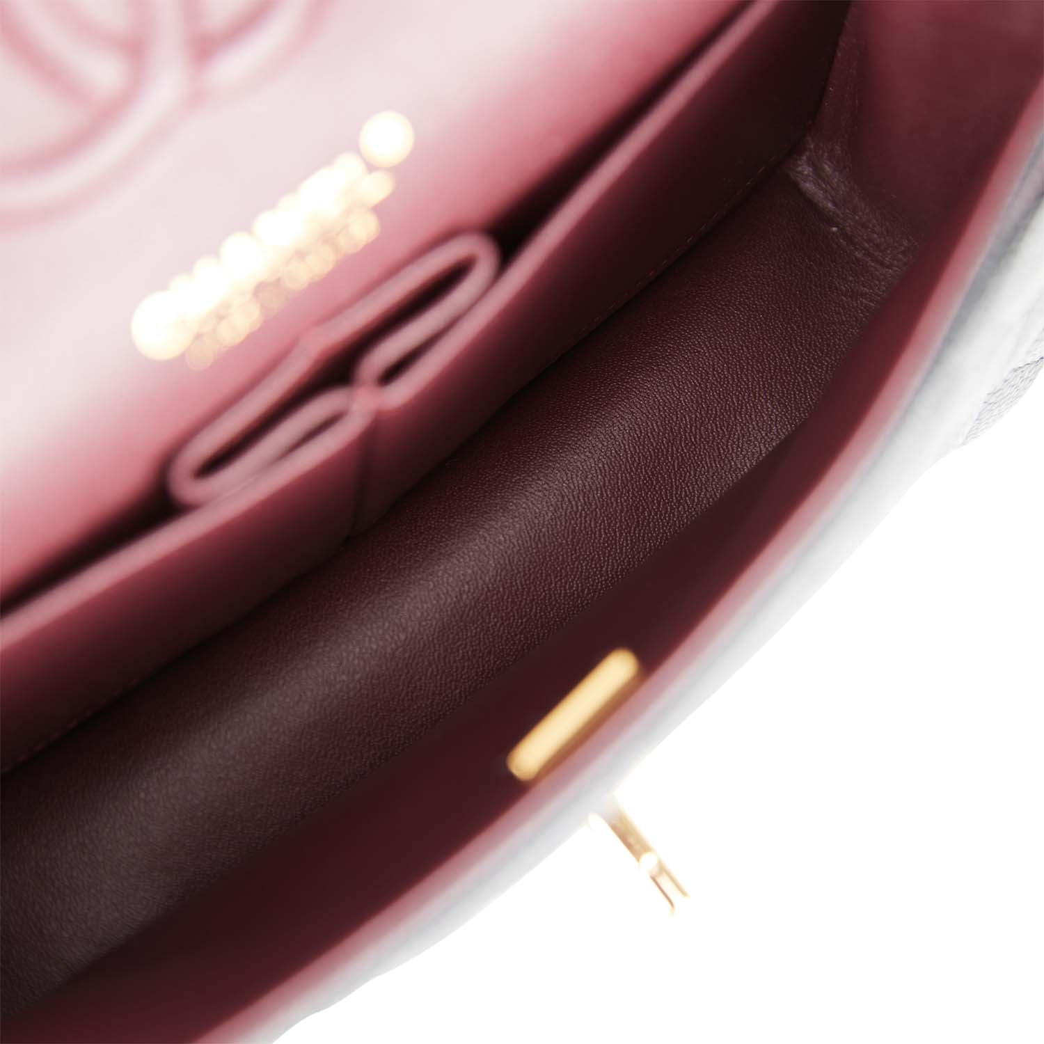 The interior is lined in burgundy leather with the "love letter" zipper compartment underneath the first flap, an "outer" slit pocket under the second flap, and an interior compartment with two open pockets separated by a "lipstick" compartment.
