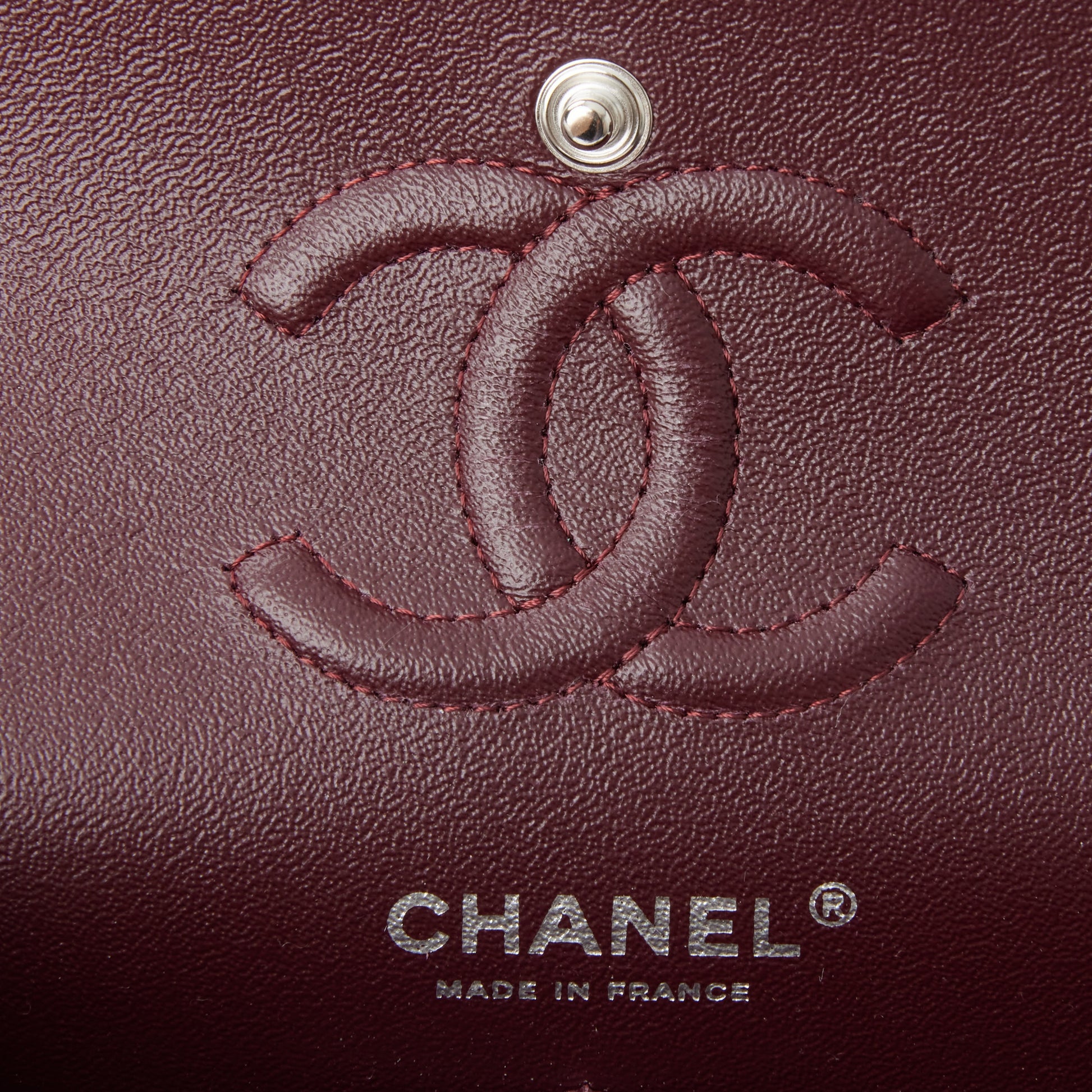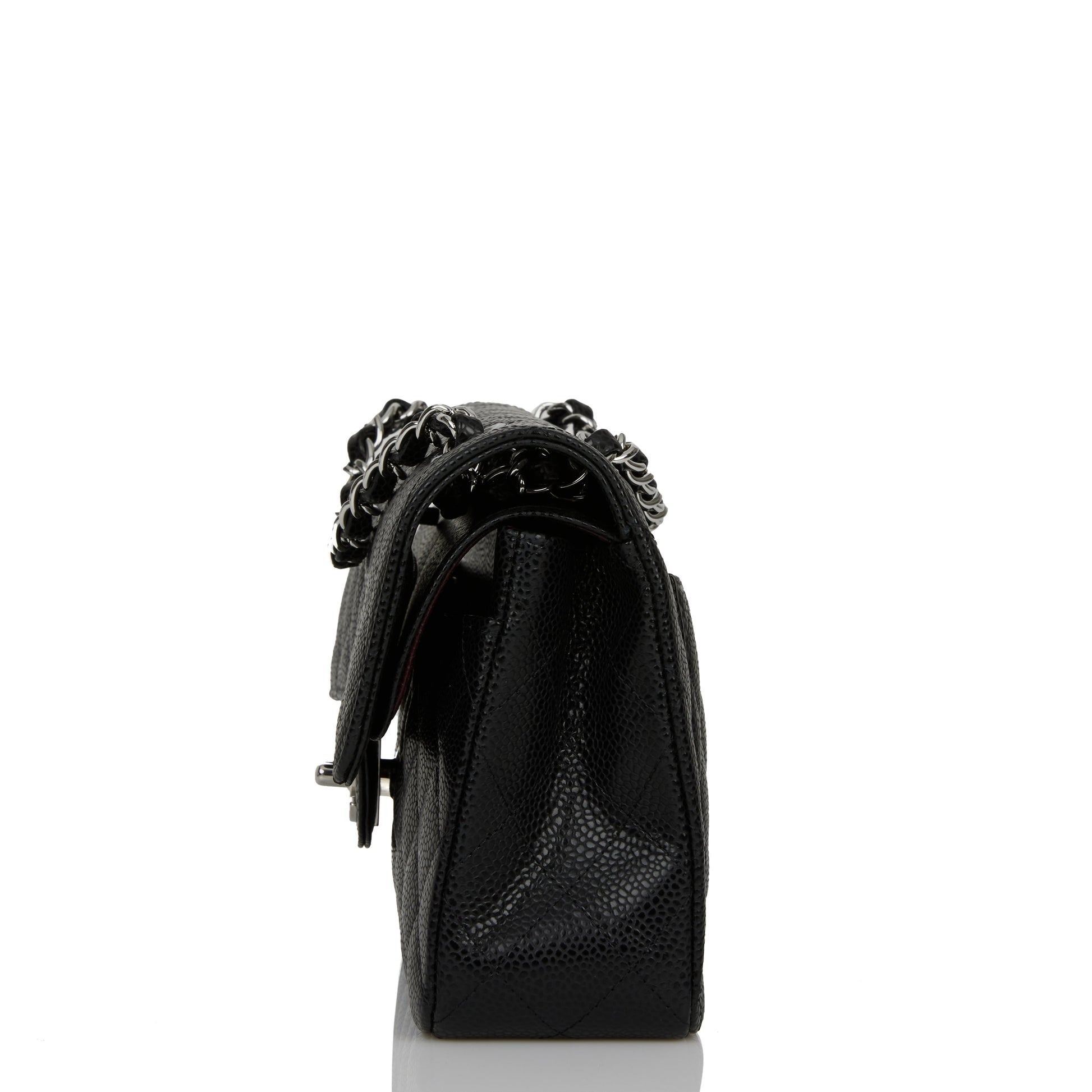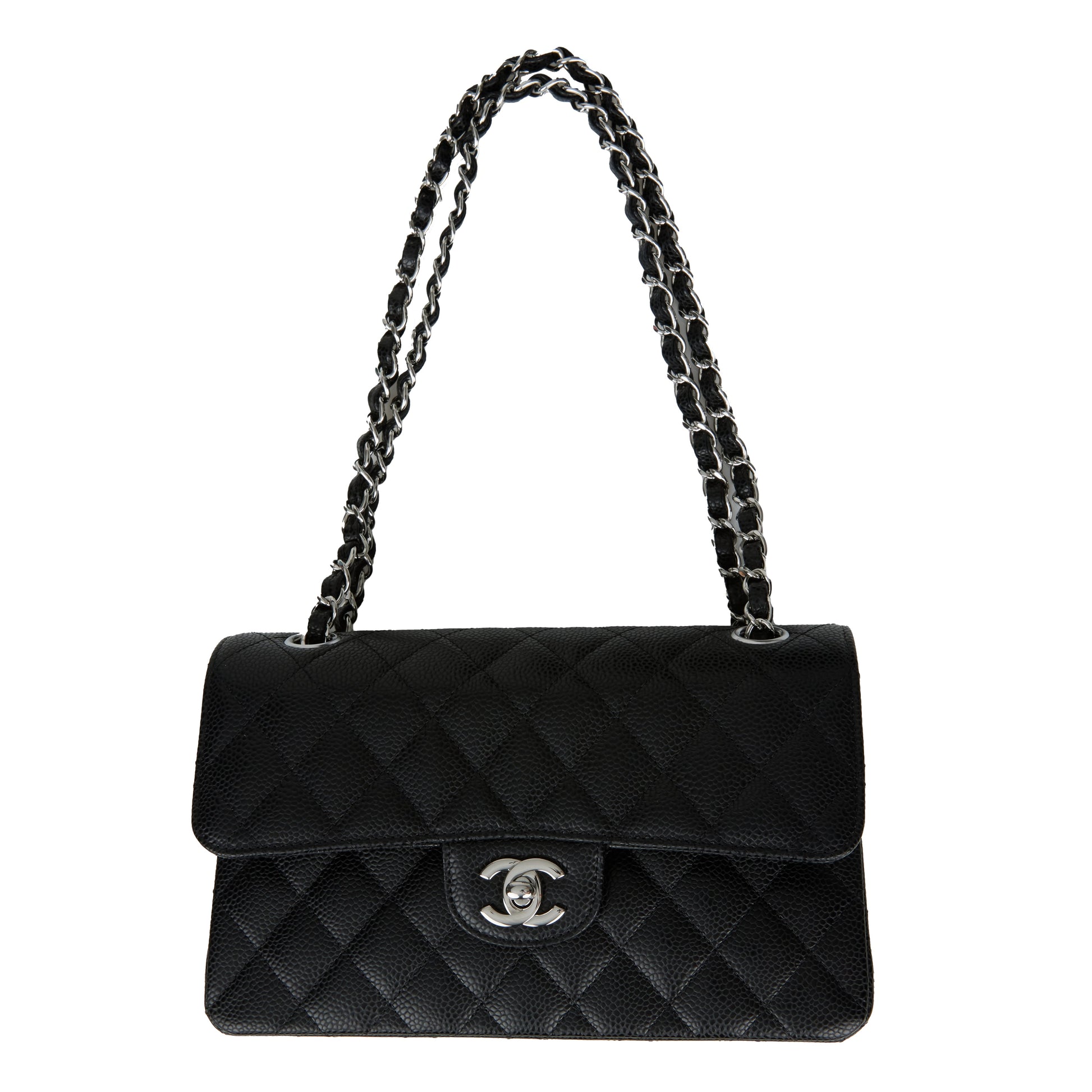 This Small Classic Double Flap bag is in black caviar leather with silver tone hardware and features a front flap with signature CC turnlock closure, half moon back pocket, and adjustable interwoven silver tone chain link and black leather shoulder strap.