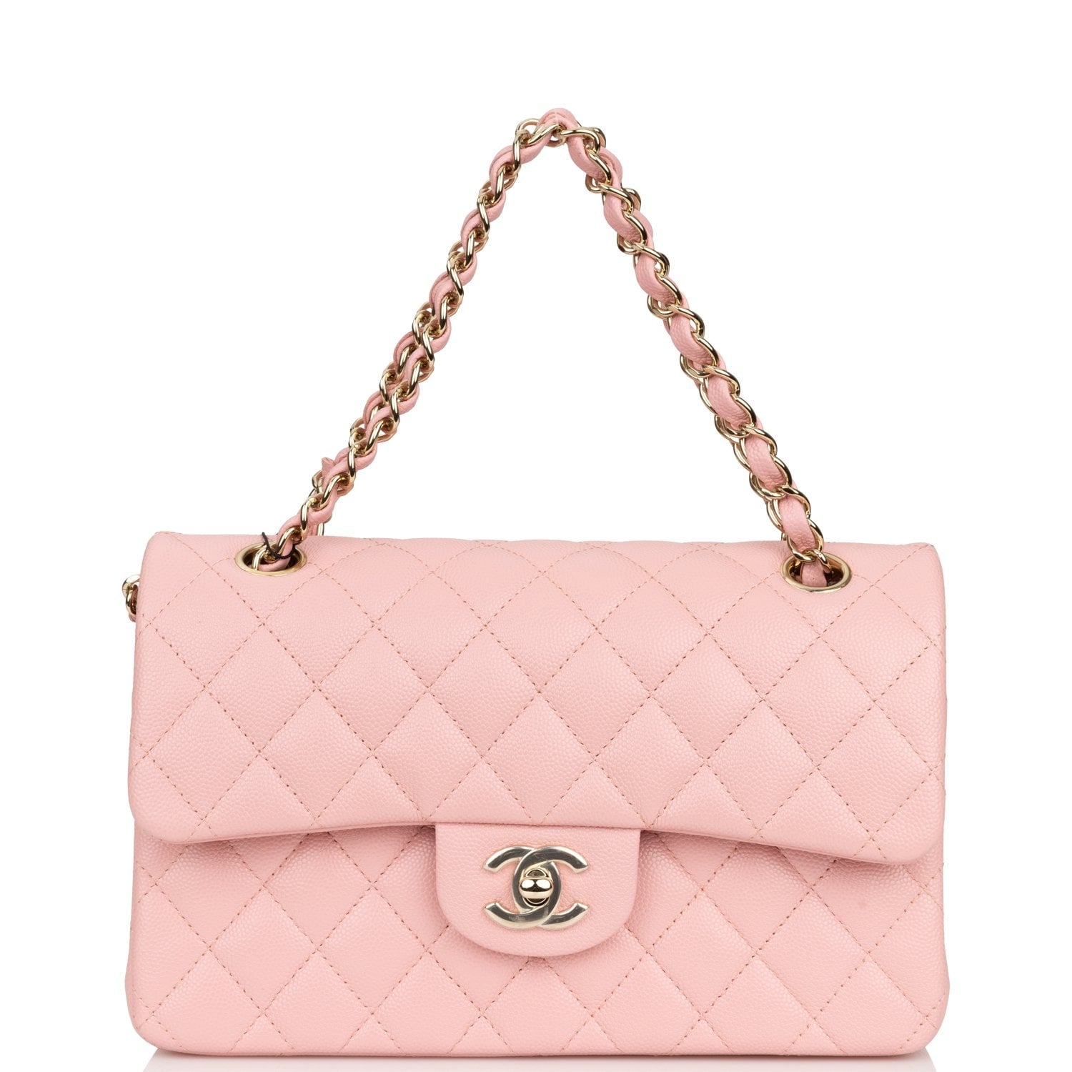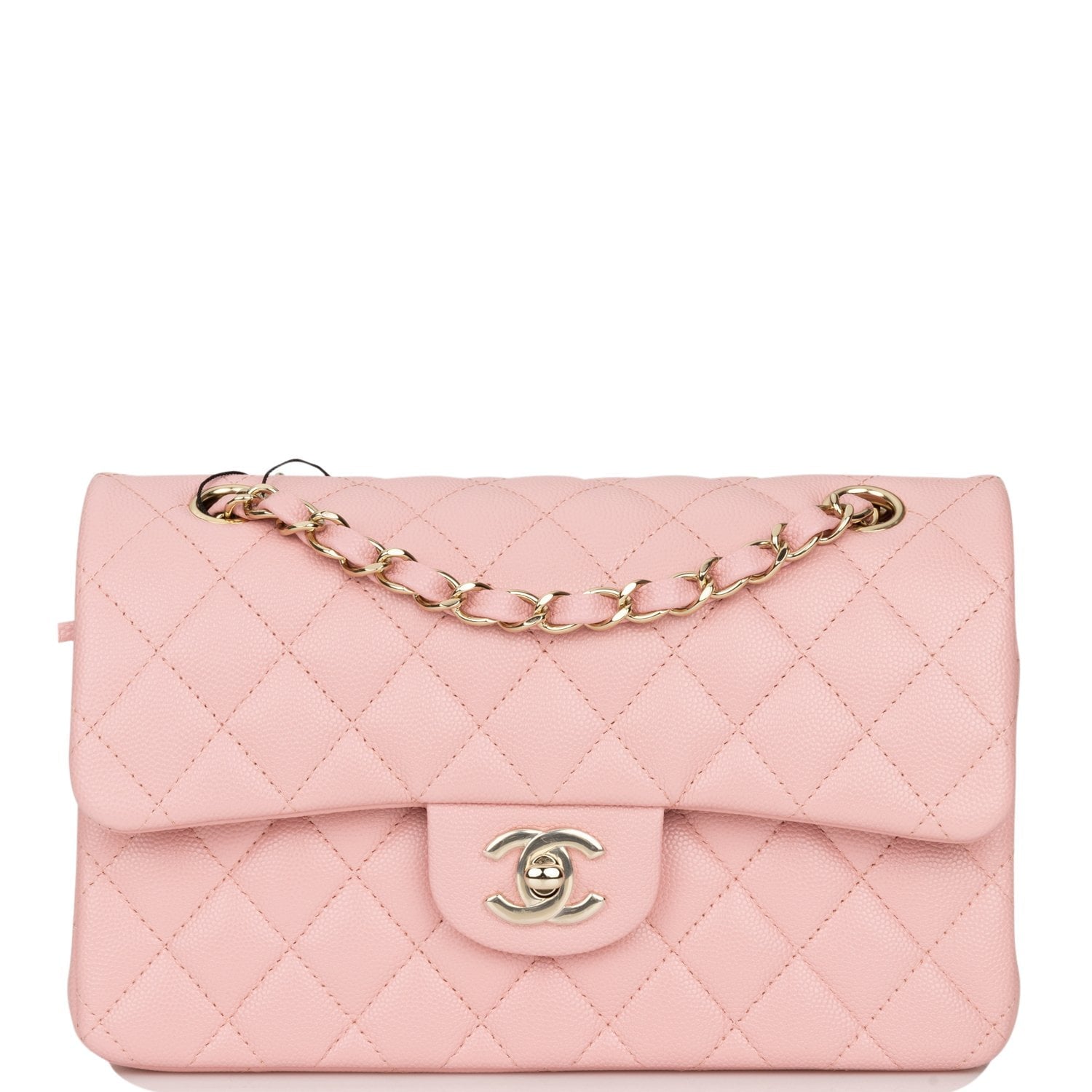This Small Classic Double Flap bag is in pink caviar leather with light gold tone hardware and features a front flap with signature CC turnlock closure, half moon back pocket, and adjustable interwoven light gold tone chain link and pink leather shoulder strap.
