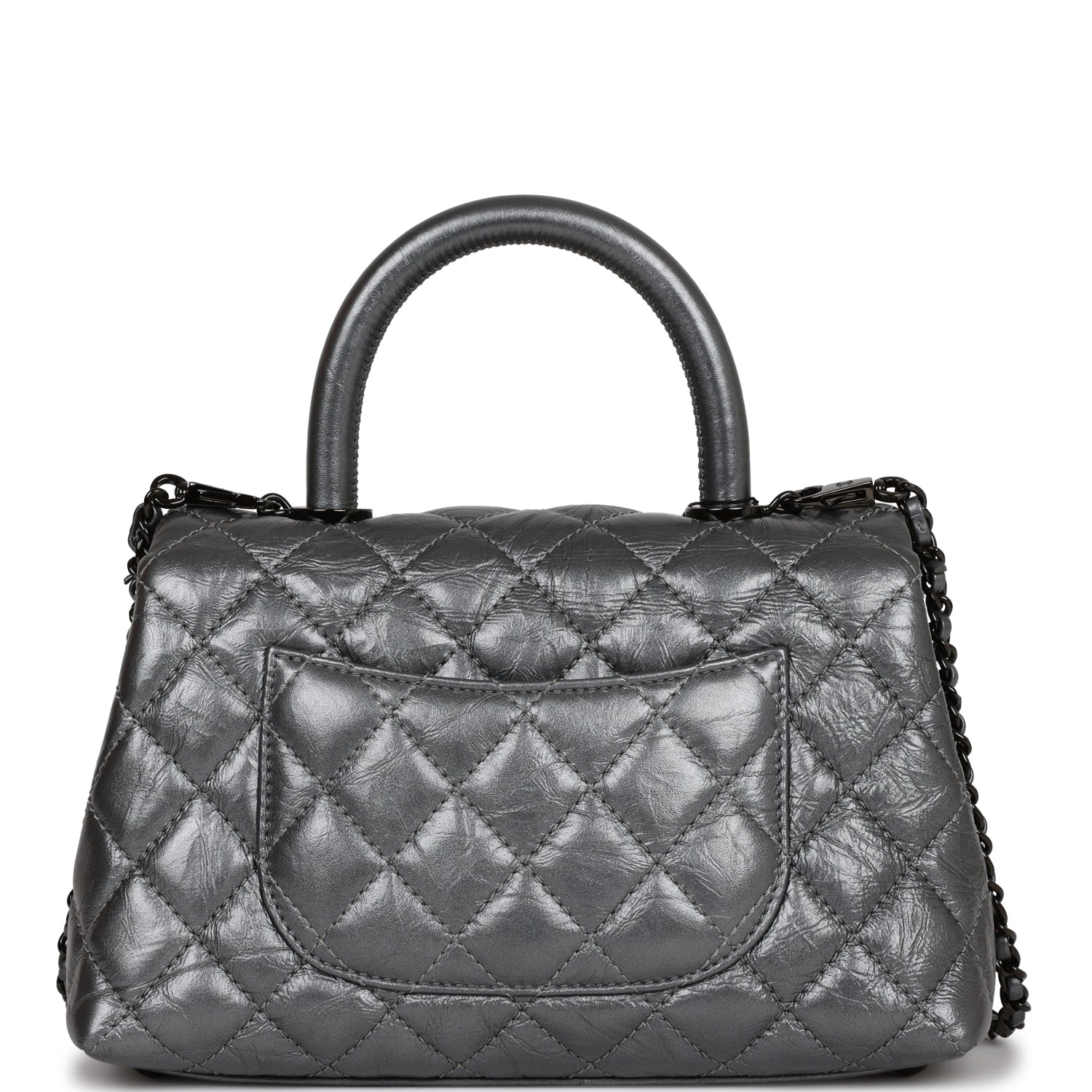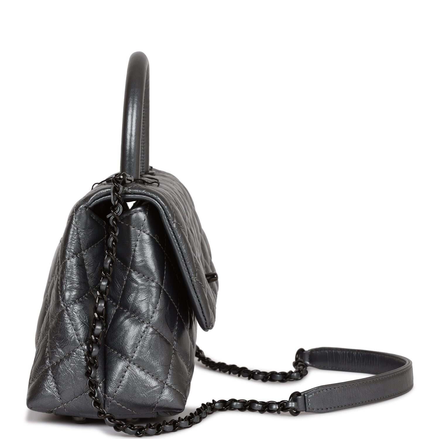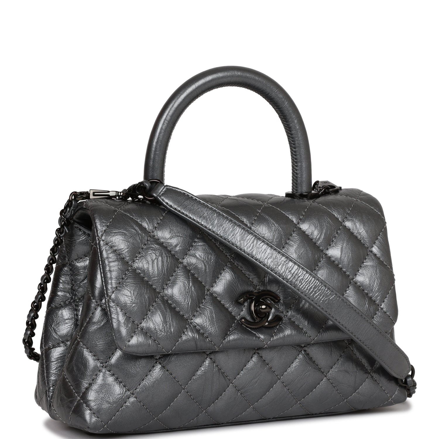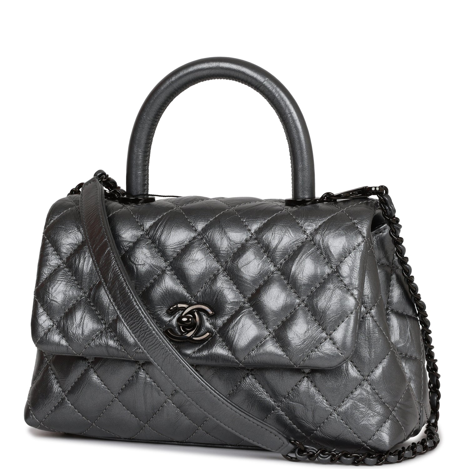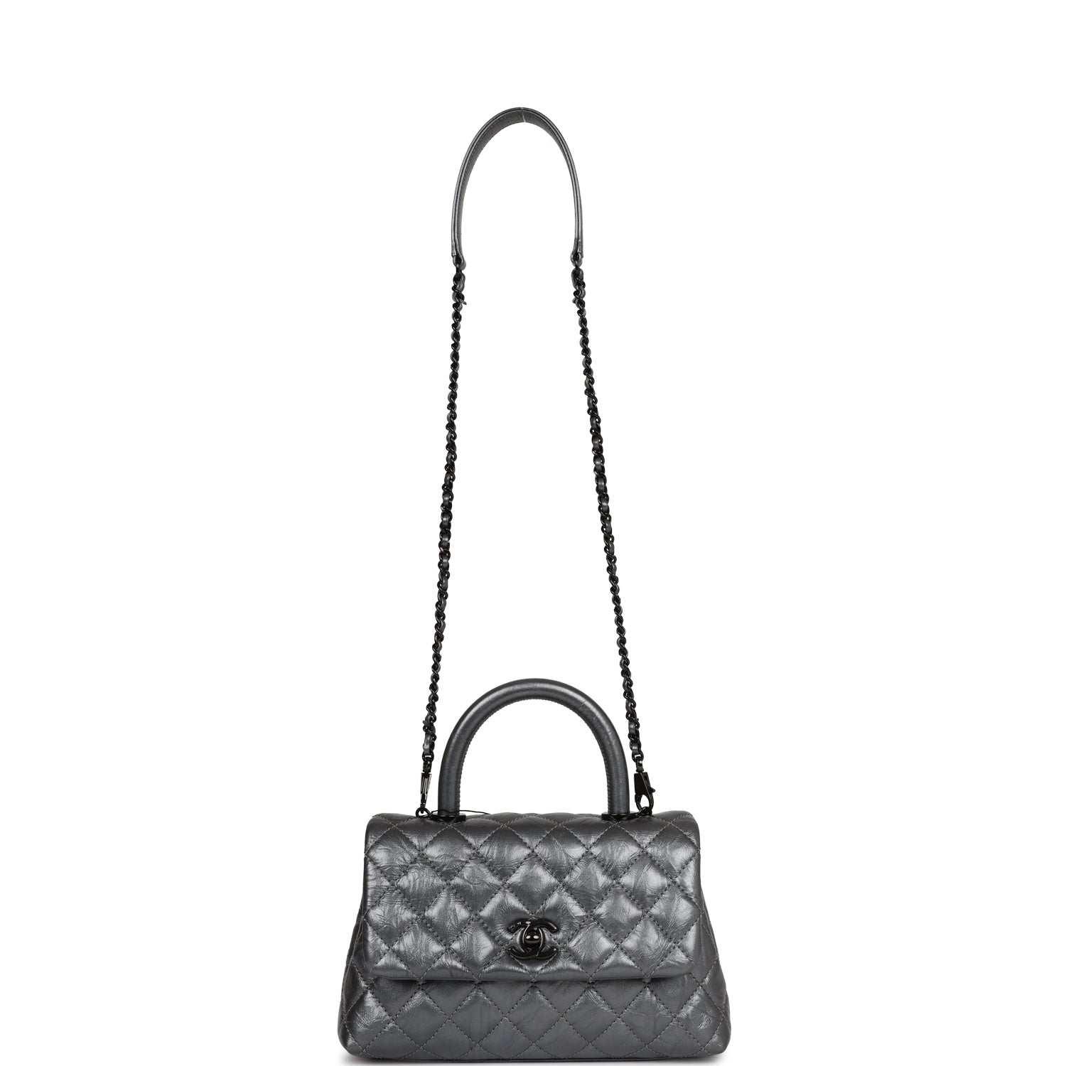 This Small Coco Handle Flap bag is of black aged calfskin with black hardware and has the signature diamond quilting in a trapezoidal shape with signature CC interlocking closure in black metal, top handle, and long black metal and black leather chain.