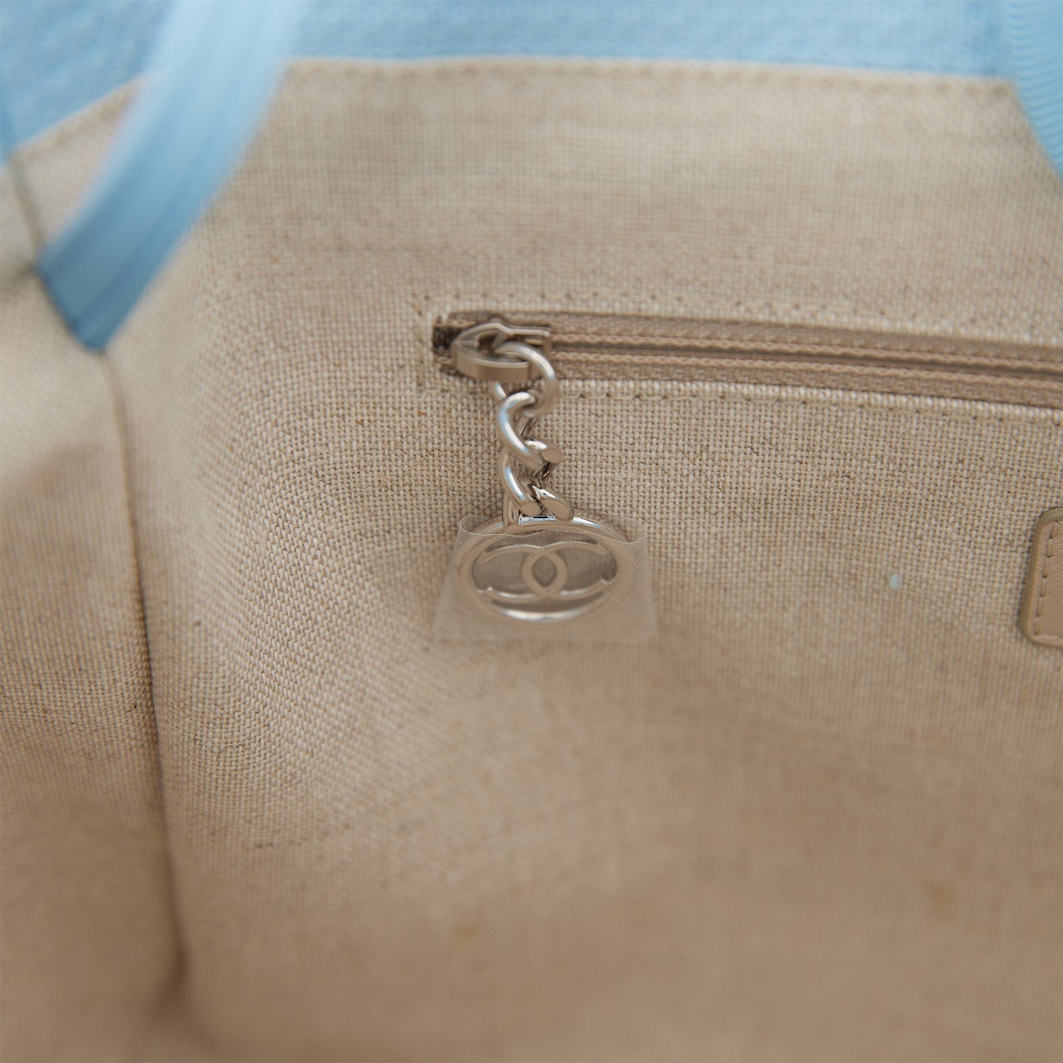 The interior is lined in beige fabric and has two open pockets on the front wall and a zipper pocket with a Chanel pull on the rear wall.