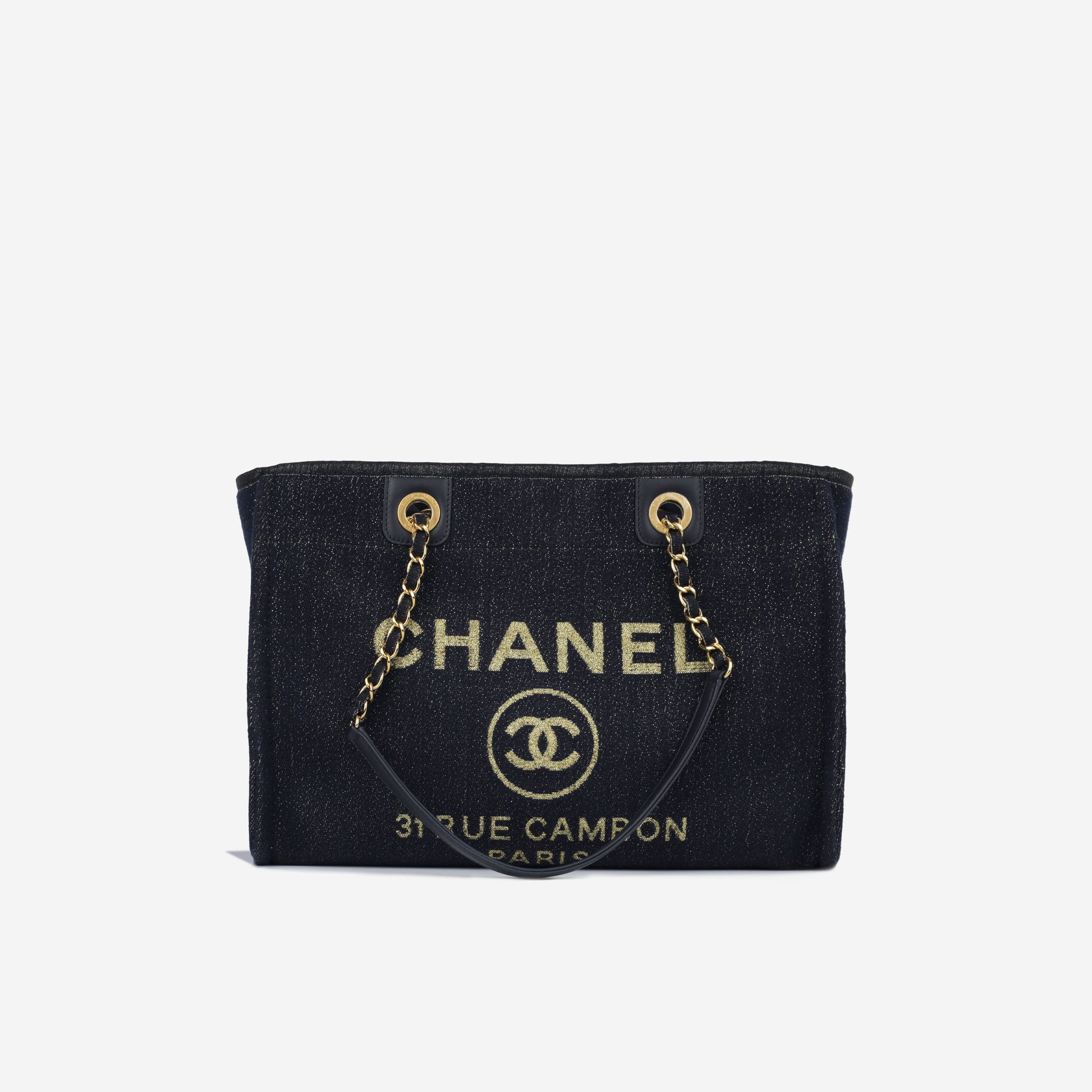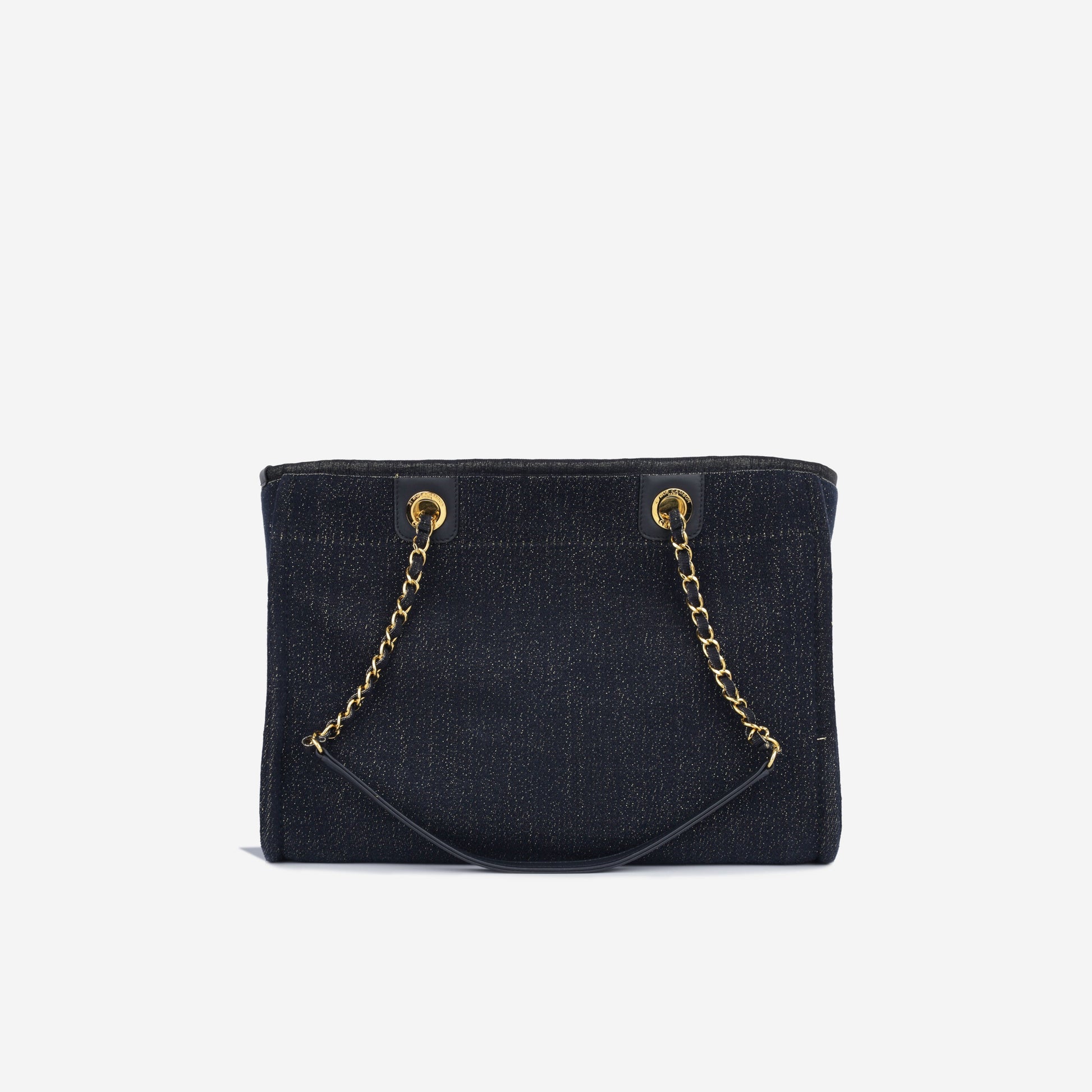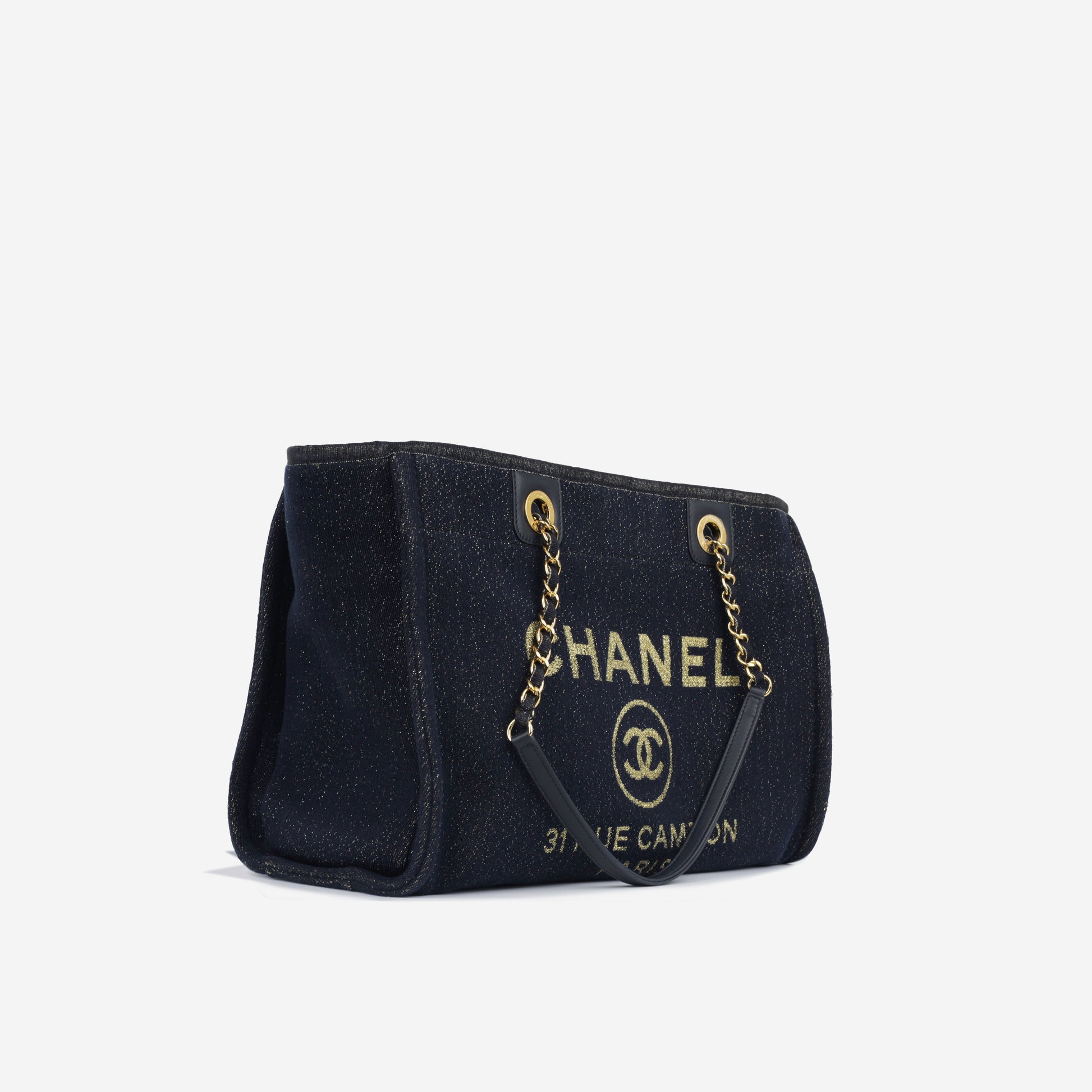 Carefully crafted from navy mixed fabric with gold glitter detailing, the Chanel Deauville handbag is beyond stunning. Complimented by gold-tone hardware, and spacious enough to hold everything you would need throughout the day, the Deauville is suitable for travelling, a day at the beach or just running errands.