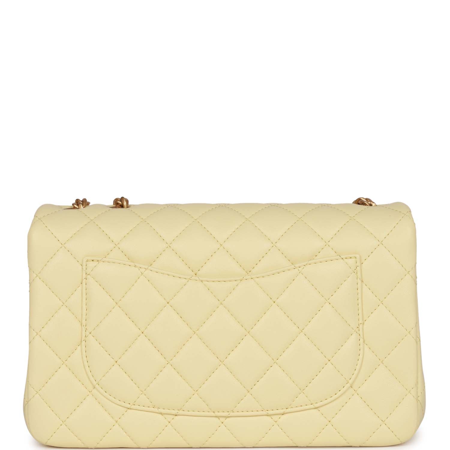 This Camellia Crush Medium Flap bag is in Yellow lambskin leather with antique gold tone hardware and features a front flap with CC turnlock closure, back half moon pocket and adjustable interwoven antique gold tone chain link shoulder/crossbody strap with camellia flower attachment.