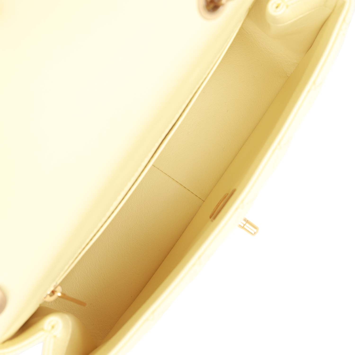 The interior is lined in Yellow leather and features a small zip pocket with Chanel pull and slip pocket underneath on the rear wall.