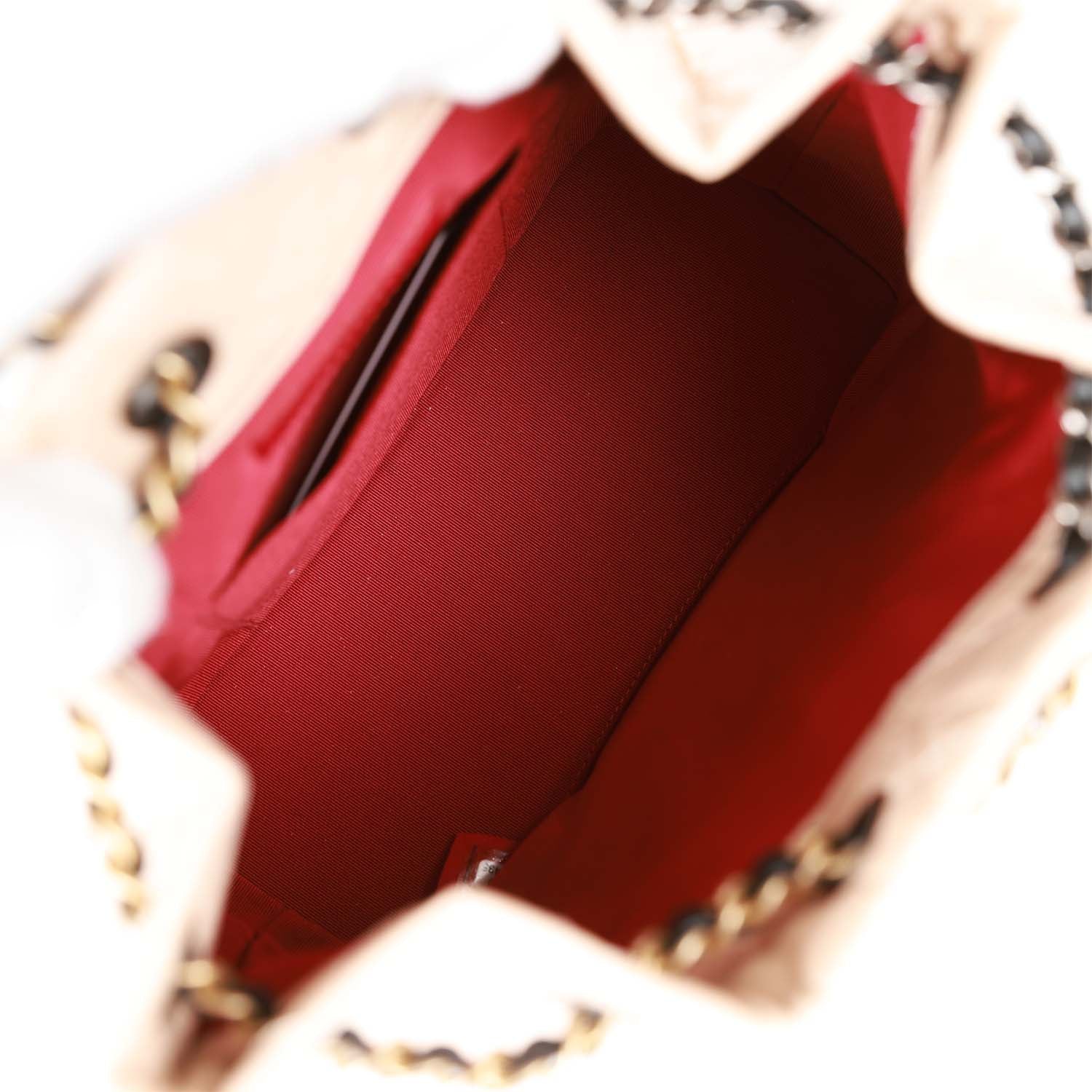 This Small Gabrielle backpack is in Beige aged calfskin leather with a Black calfskin base, mixed metal hardware, a front CC logo, drawstring closure, and two interwoven mixed metal chain link and black leather backpack straps.
