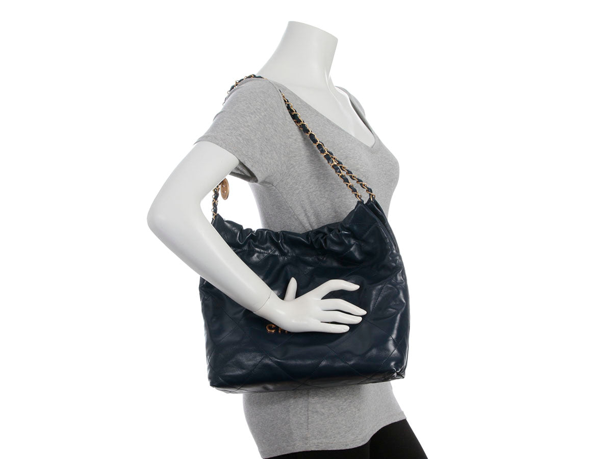 Chanel’s Small Navy Quilted Calfskin 22 is an elusive gem with a relaxed silhouette and luxurious texture! Crafted from quilted calf leather in a rich dark blue hue, it features antique gold hardware and a leather-threaded chain handle with a 9-inch drop and a round logo charm. The gathered top secures with a magnetic closure, and the ends may also be snapped closed. Inside, you’ll find one zipped pocket and quilted navy fabric lining, along with a detachable zip leather pouch for added versatility. In pristine condition from 2022, it comes with a dustbag and box and may have been worn once. This laid-back beauty is equal parts Parisian poise and everyday ease!