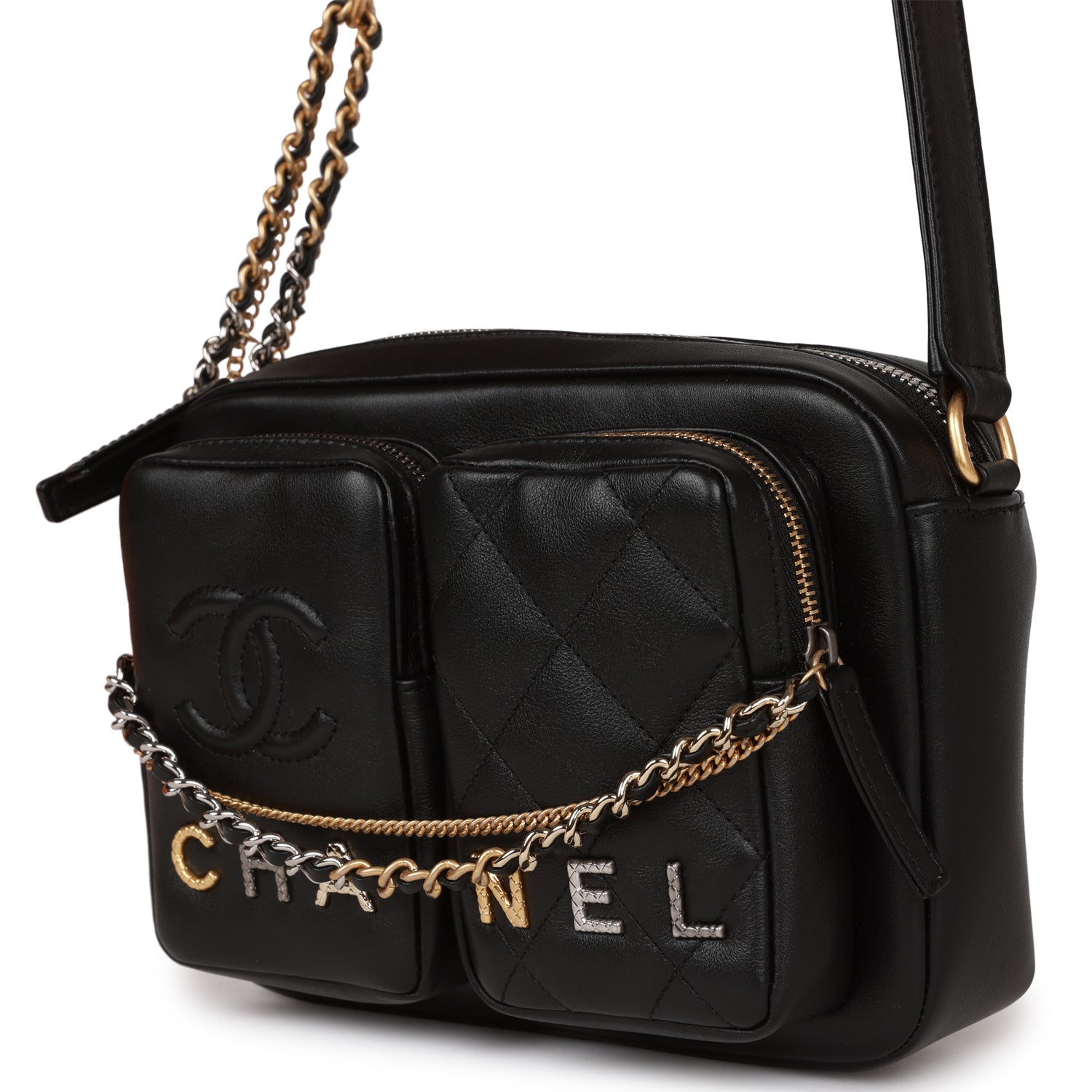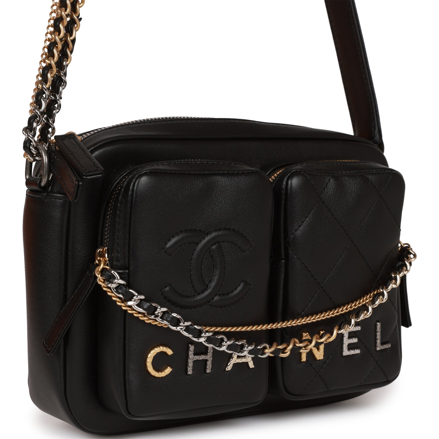 This is a Chanel Small Camera Bag of black calfskin leather with mixed metal hardware and features two exterior zip pockets, one back slip pocket, an interwoven chain link with antique gold and silver metal and black leather, & CC stitched embossed leather.