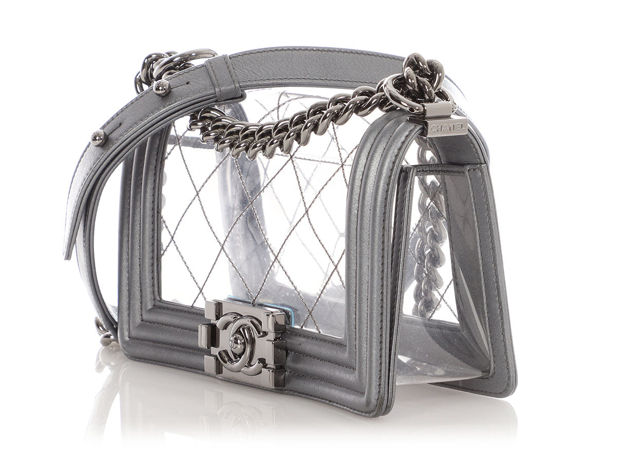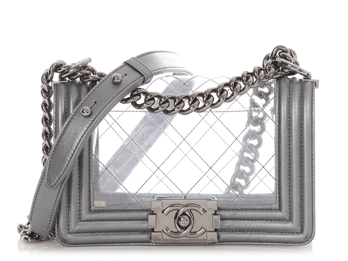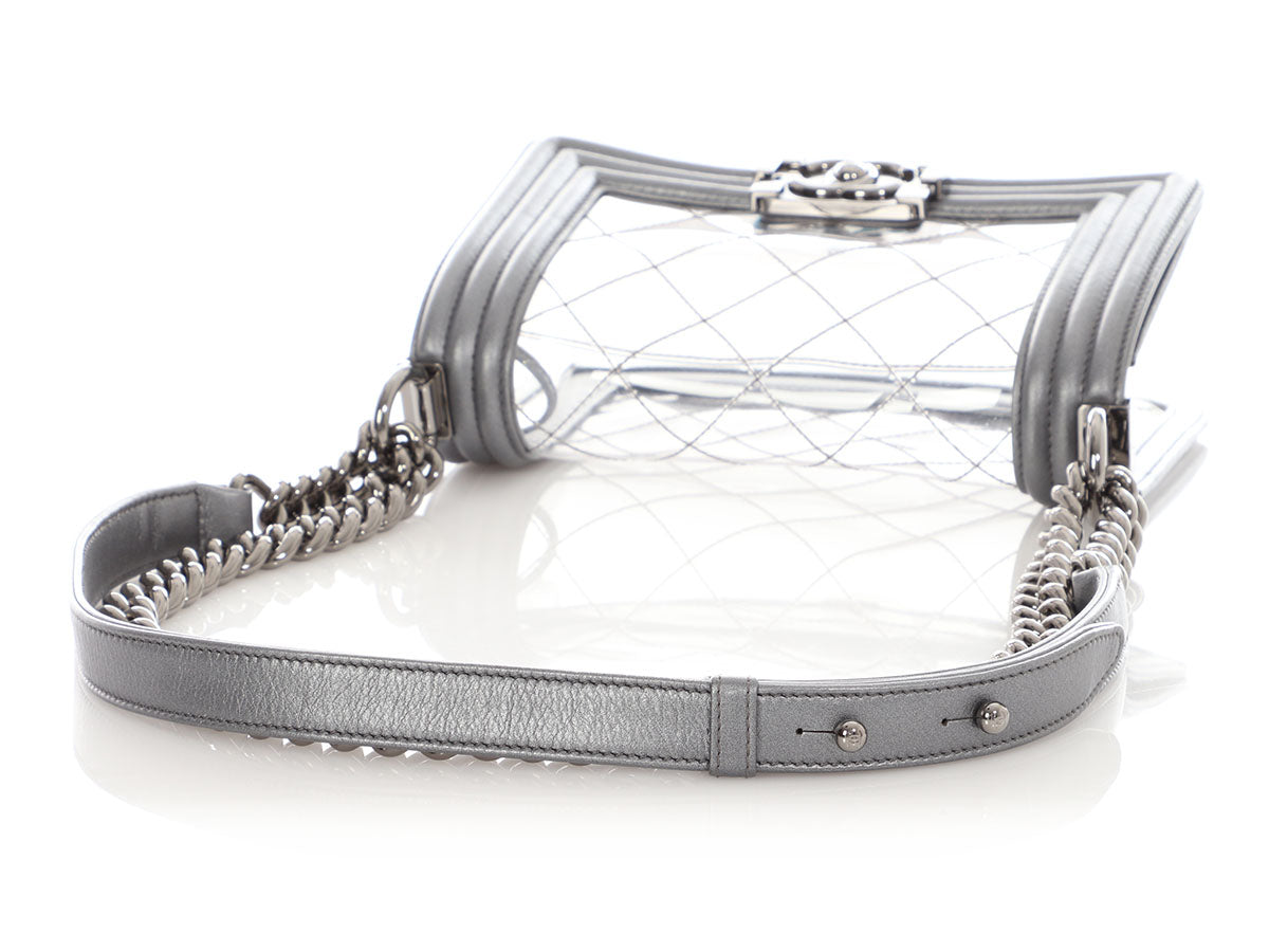 A little naughty and a lot nice, this see-through Chanel Small Silver PVC Boy Bag is a showstopper! Made of clear quilted silver PVC with channel-stitched silver calfskin trim, it’s paired with ruthenium hardware in the push-lock Boy Clasp and leather and chunky-chain strap that can be worn doubled with an 11.5-inch drop or crossbody with a 21-inch drop. In very good condition from 2014, it comes with a dustbag and has light corner wear, wear on the edges, and some marks on the PVC. It has no lining or pockets as you might expect with a peek-a-boo bag like this!