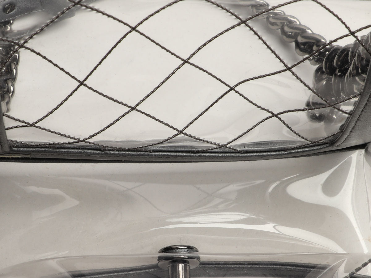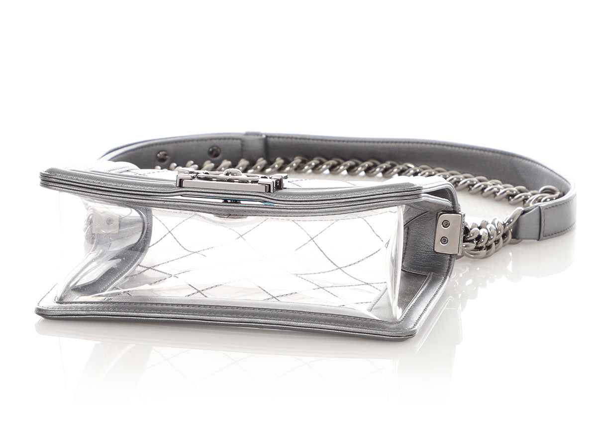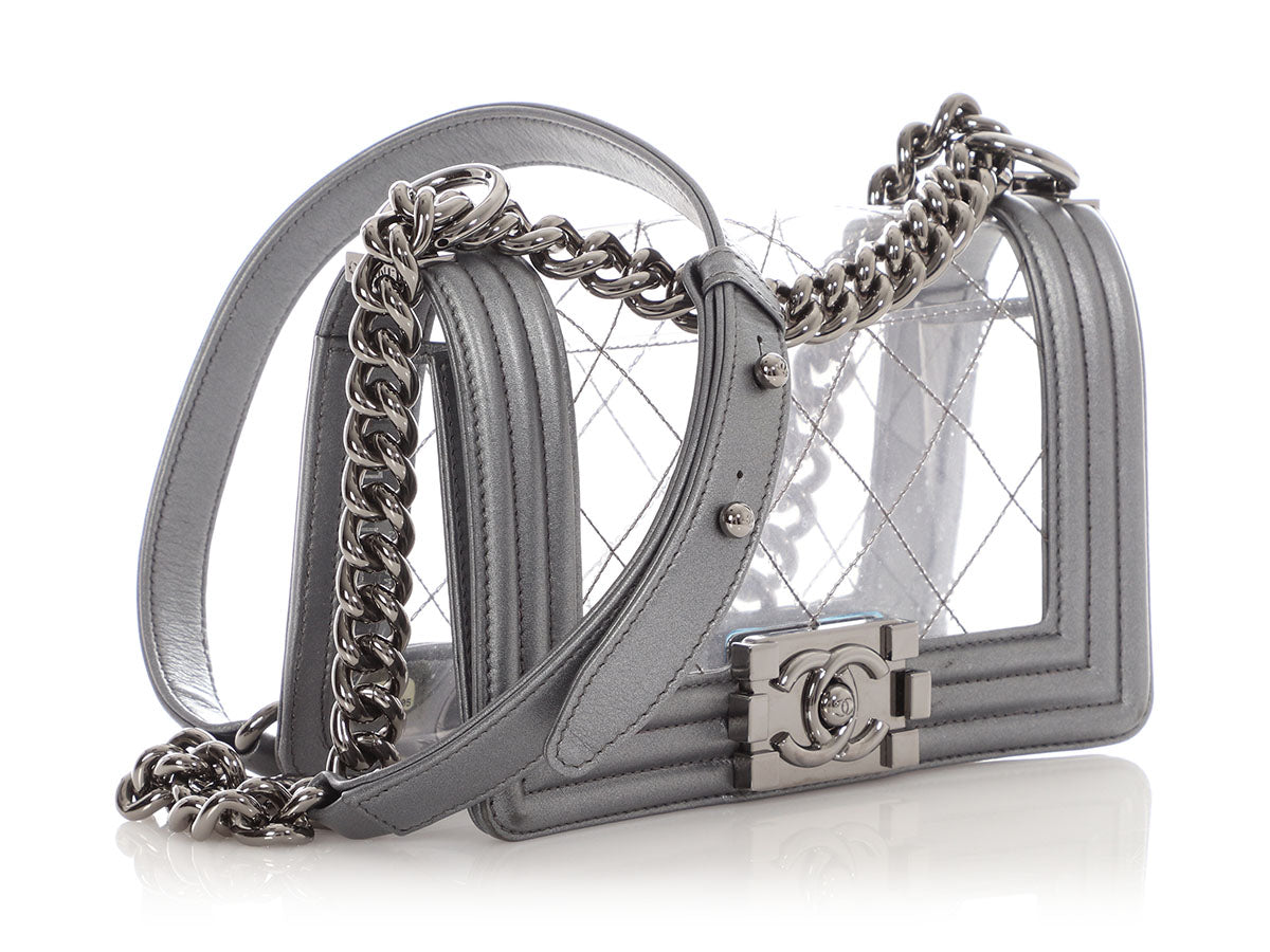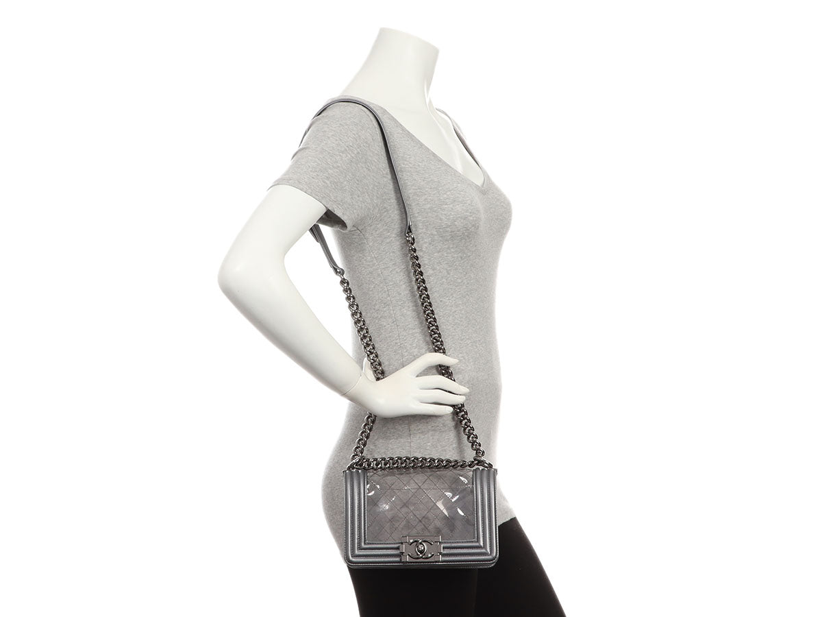 A little naughty and a lot nice, this see-through Chanel Small Silver PVC Boy Bag is a showstopper! Made of clear quilted silver PVC with channel-stitched silver calfskin trim, it’s paired with ruthenium hardware in the push-lock Boy Clasp and leather and chunky-chain strap that can be worn doubled with an 11.5-inch drop or crossbody with a 21-inch drop. In very good condition from 2014, it comes with a dustbag and has light corner wear, wear on the edges, and some marks on the PVC. It has no lining or pockets as you might expect with a peek-a-boo bag like this!