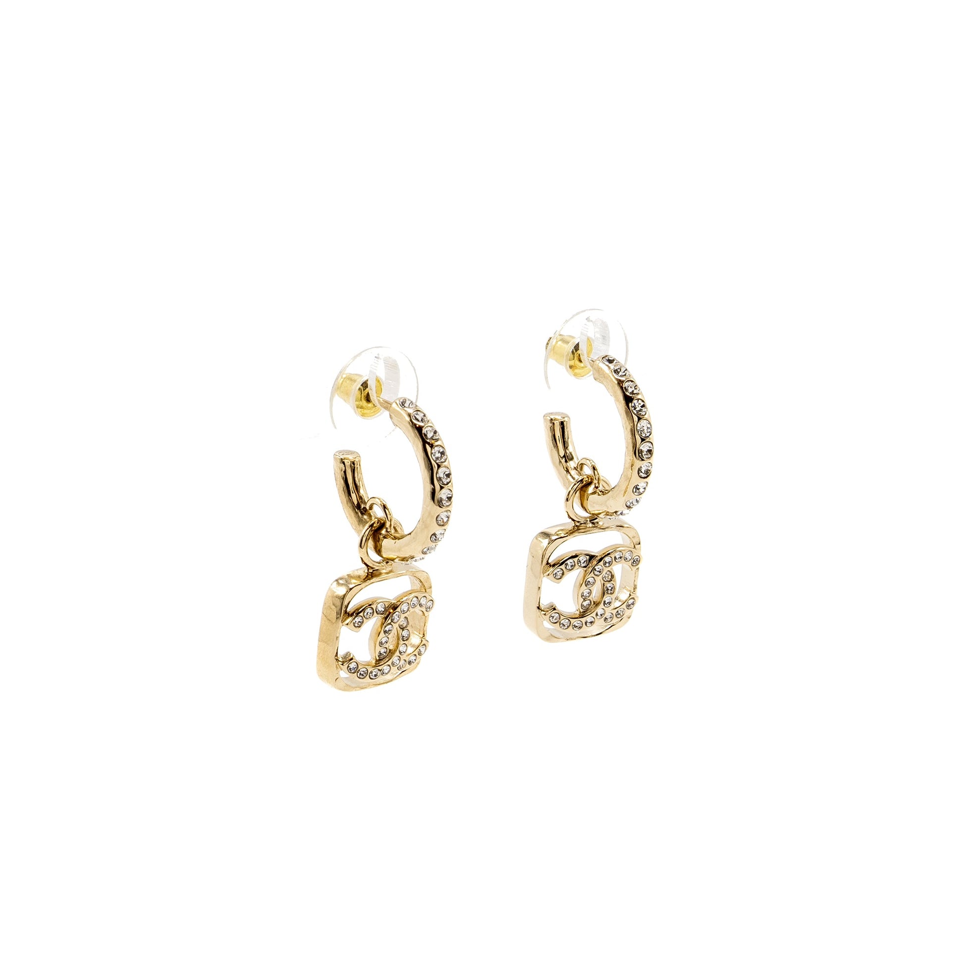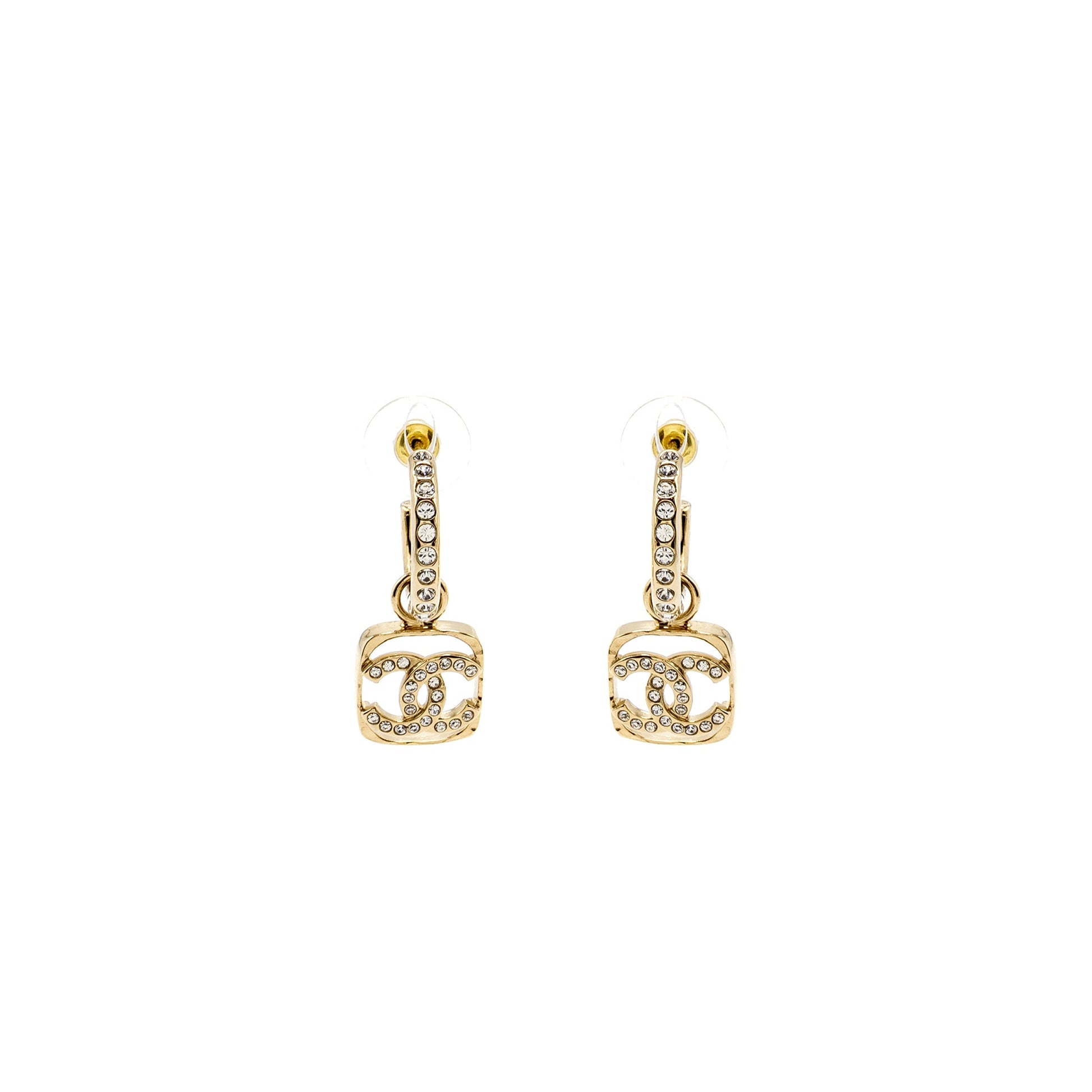 Chanel Square CC Logo Dropped Earrings Crystal Light Gold Tone