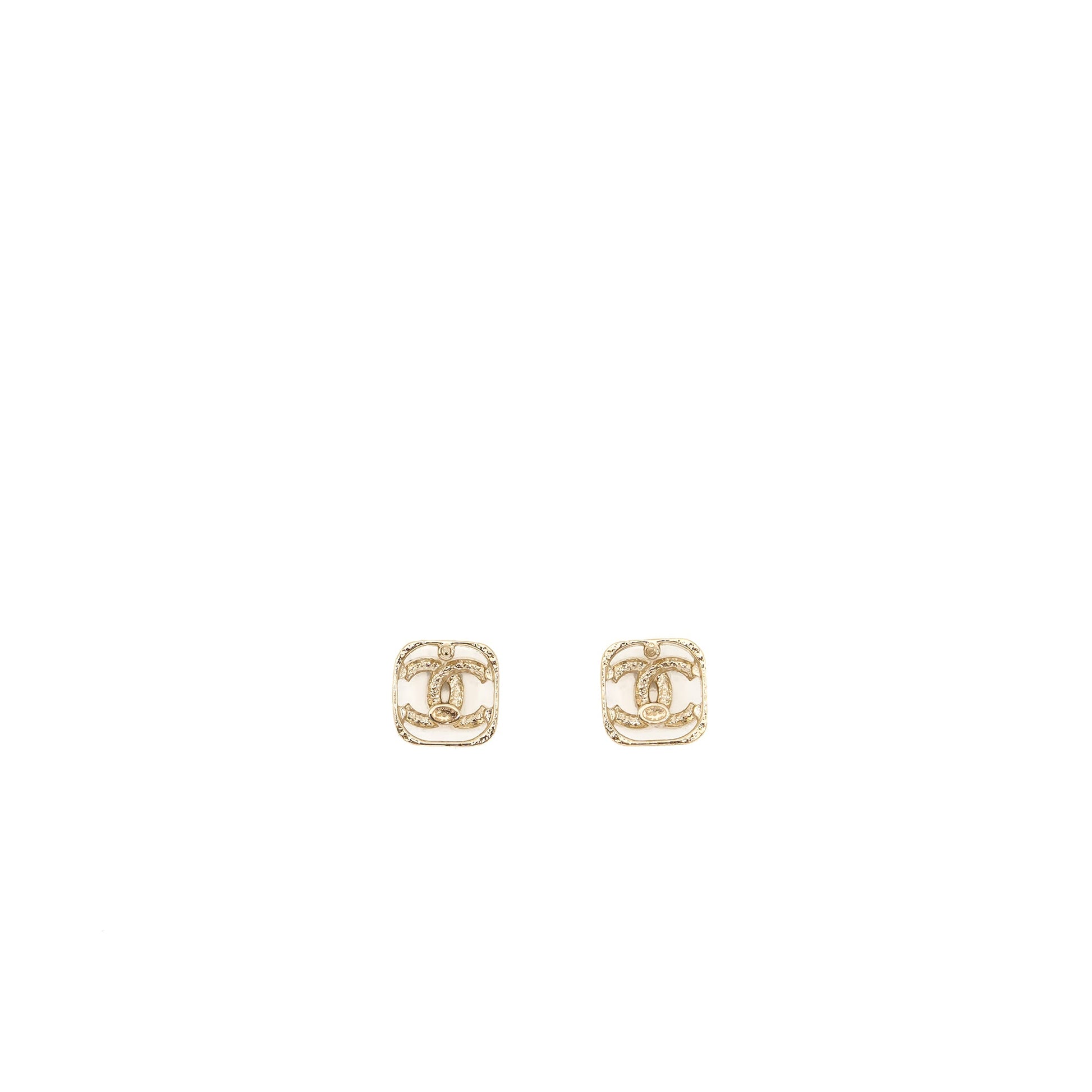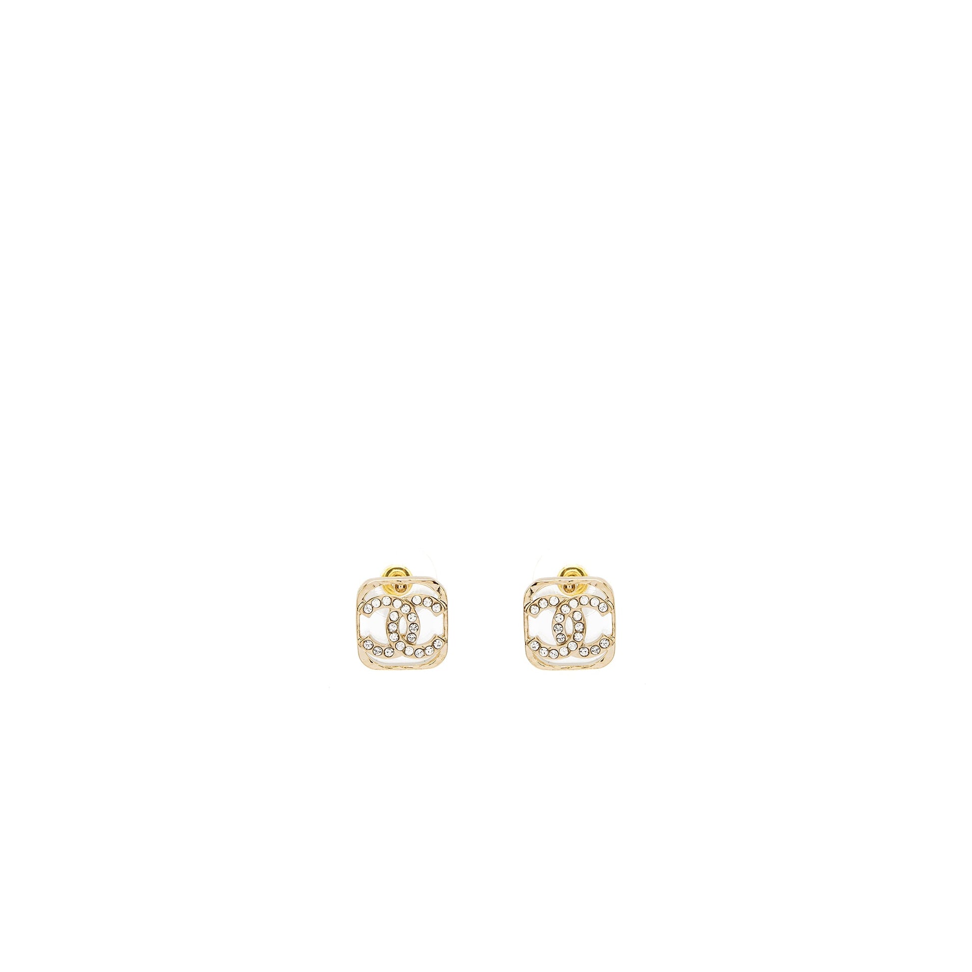 Chanel Square CC Logo Earrings Crystal Light Gold Tone