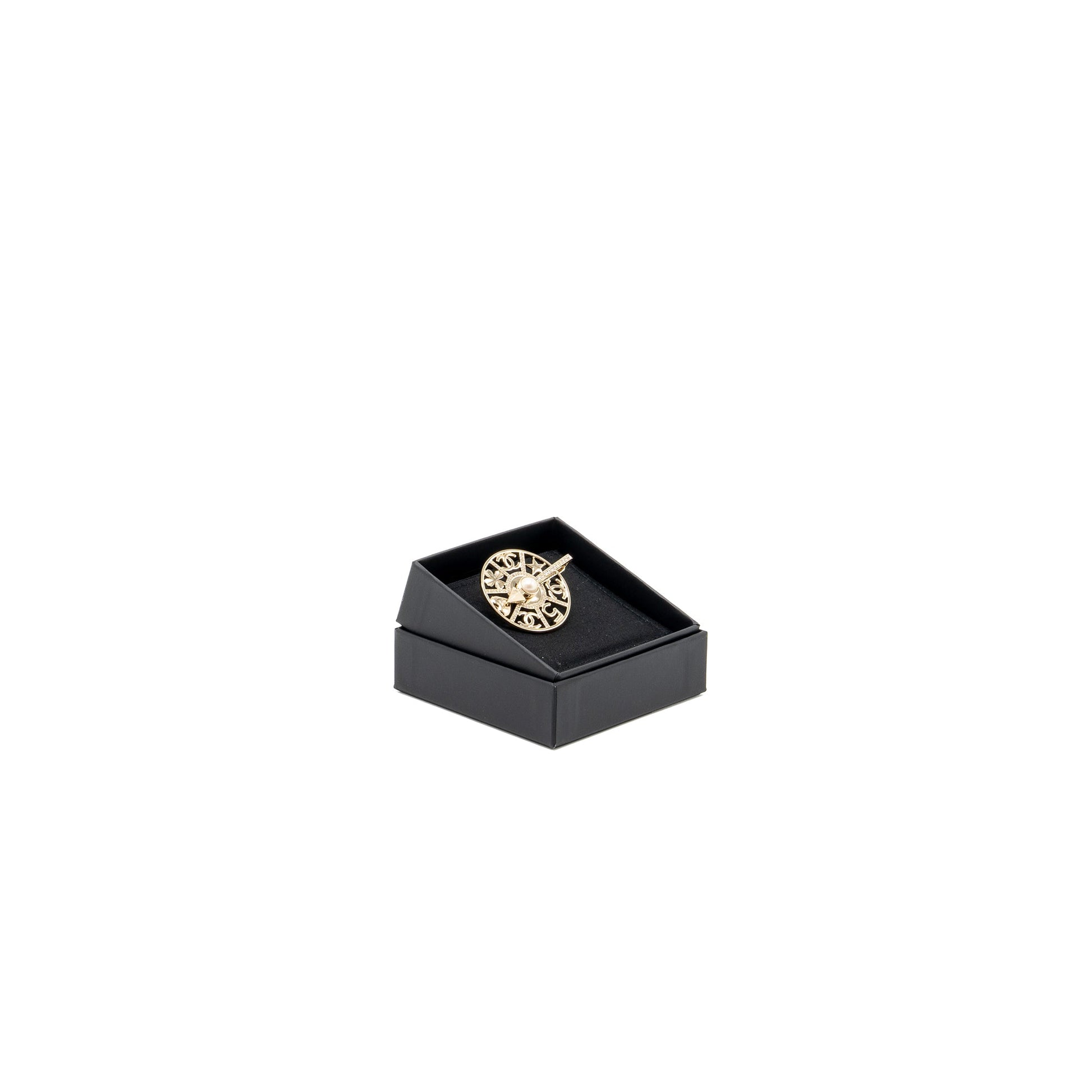 Chanel Strass spinning wheel pin brooch with Crystal / pearl Light Gold tone
