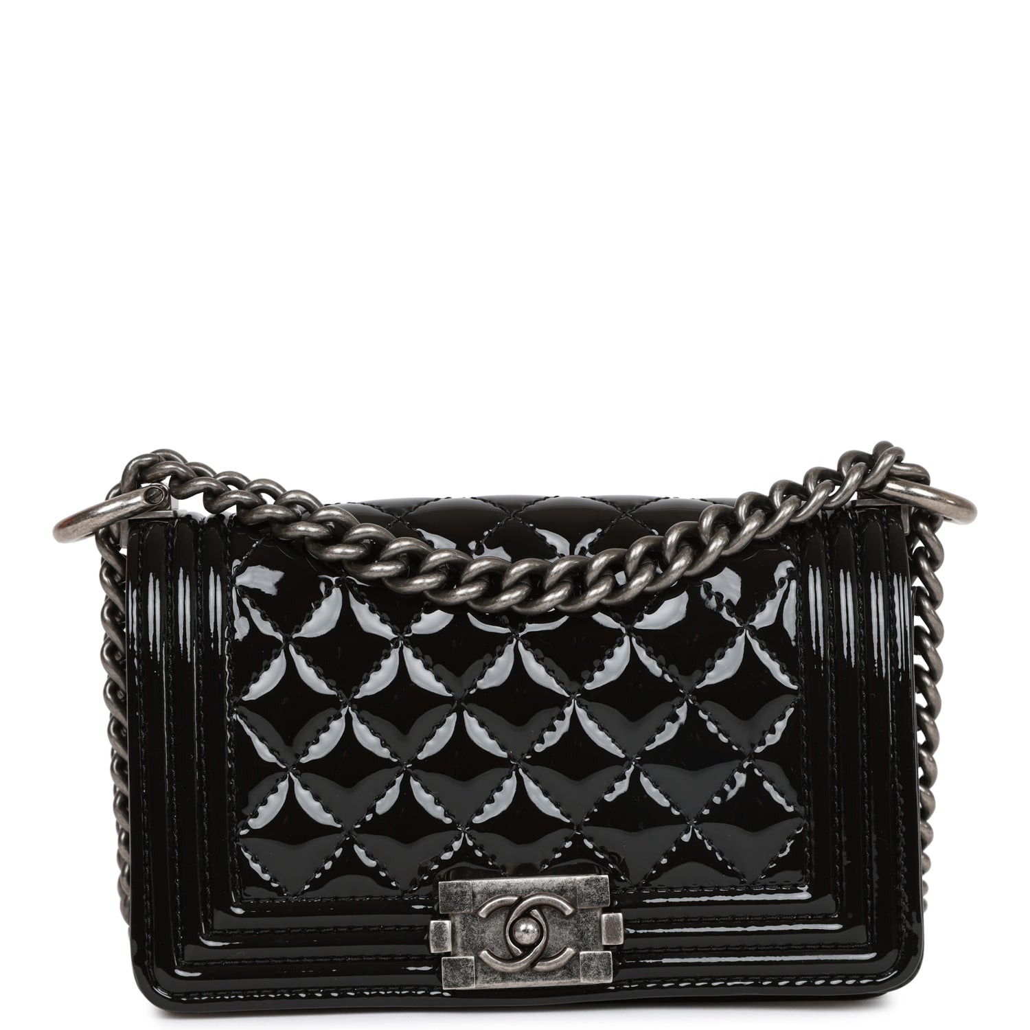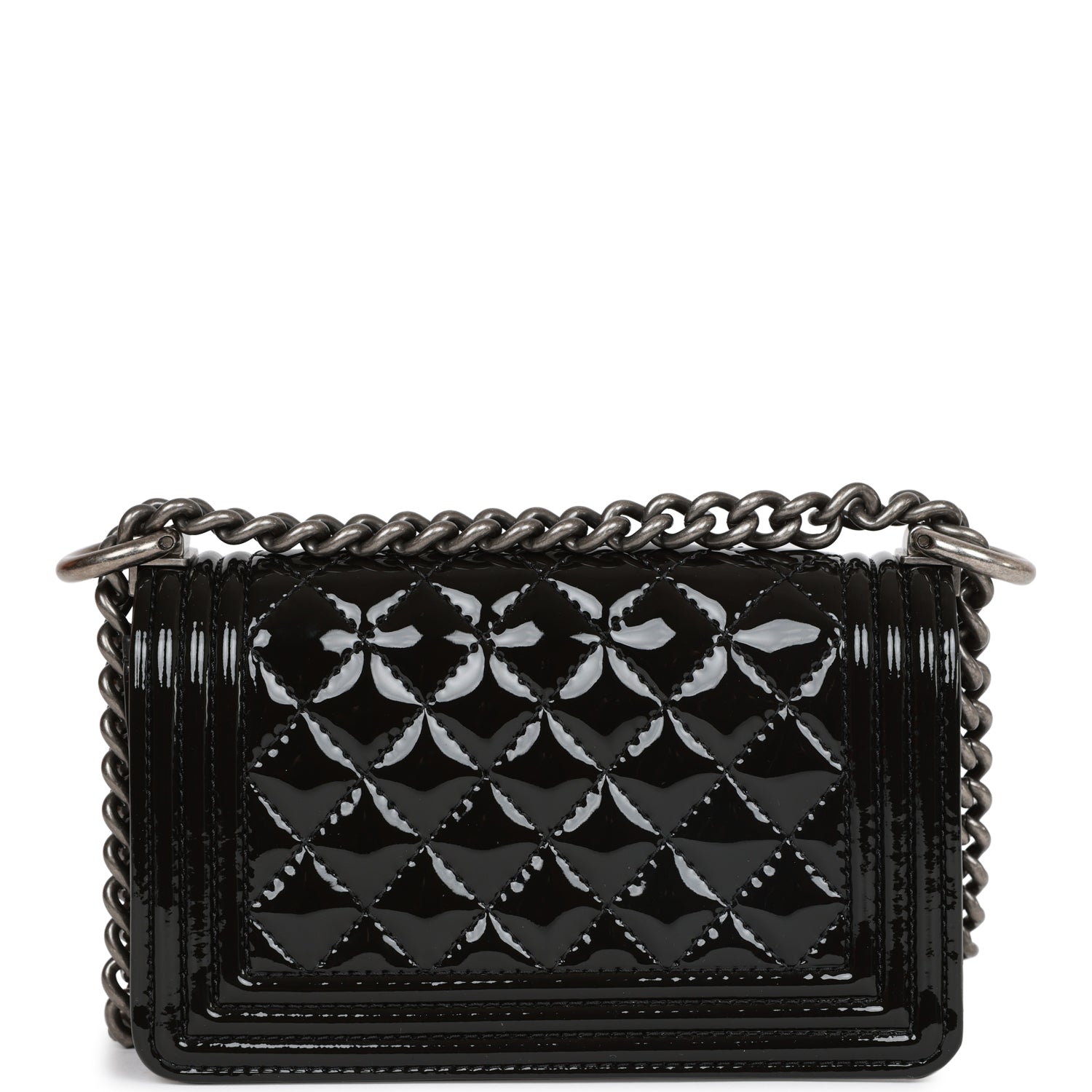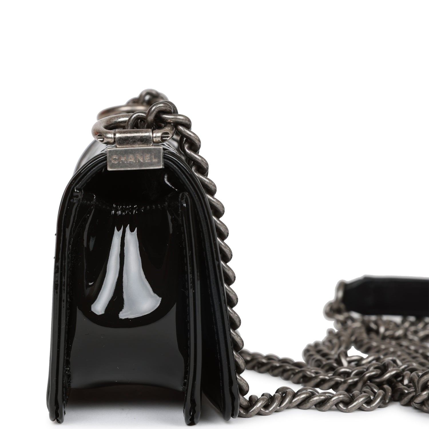 Chanel Boy Bag in black patent leather with ruthenium hardware featuring a front flap, CC pushlock closure, ruthenium chain link and leather padded shoulder strap.