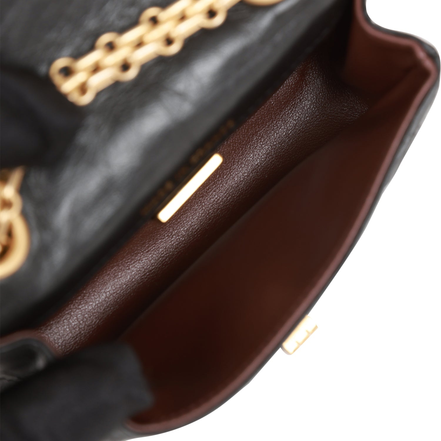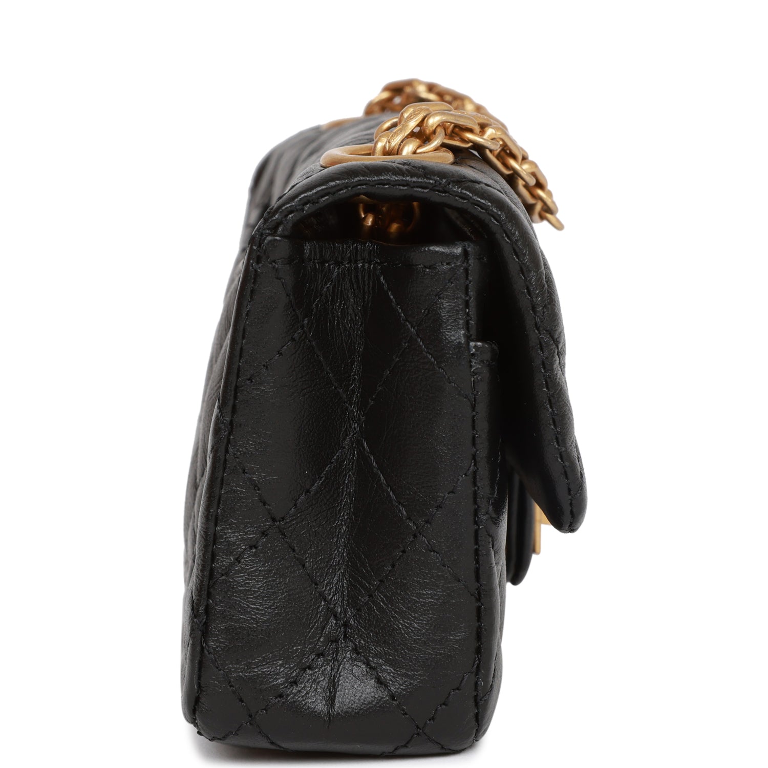 Chanel 2.55 Reissue in black aged calfskin with antique gold tone hardware featuring the reissue chain shoulder strap and mademoiselle turnlock.