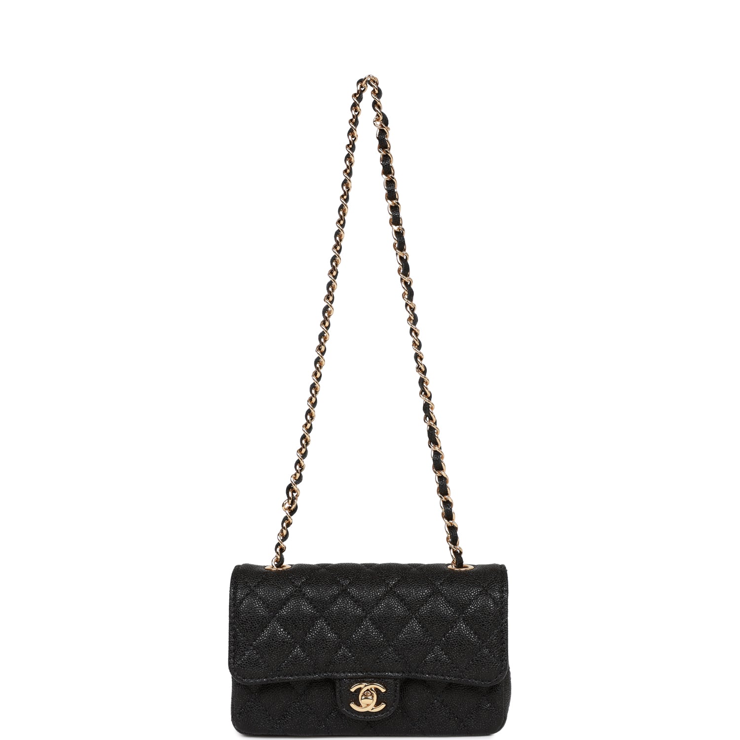 Chanel Classic Flap is in black caviar with gold tone hardware and features a the signature CC turnlock closure and an adjustable interwoven gold tone chain link with black caviar shoulder strap/cross body strap.