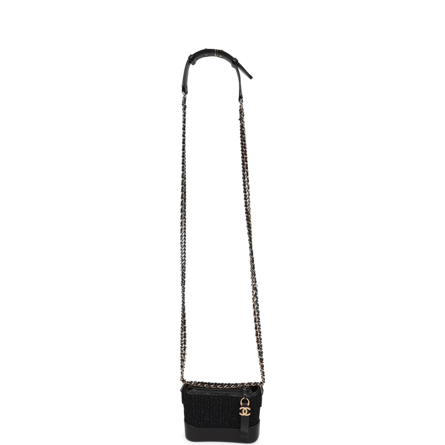 Chanel Gabrielle in black tweed and leather with gold tone, silver tone and ruthenium hardware features a zip top closure and mixed metal chain link and black leather shoulder straps.