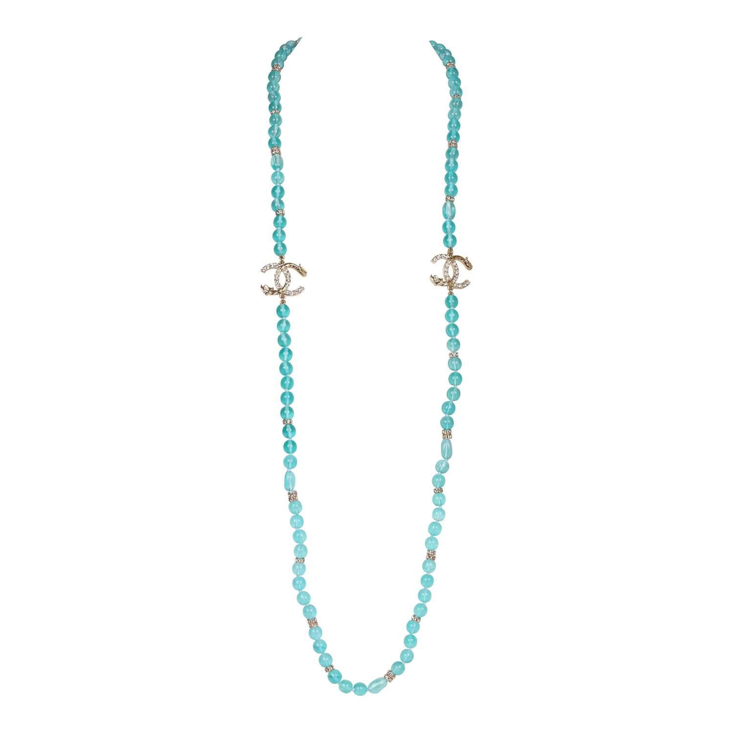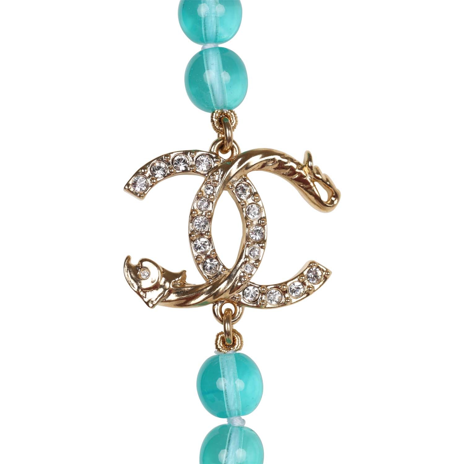 Chanel Teal Gripoix Beaded Necklace Gold Metal and White Strass CC Logos