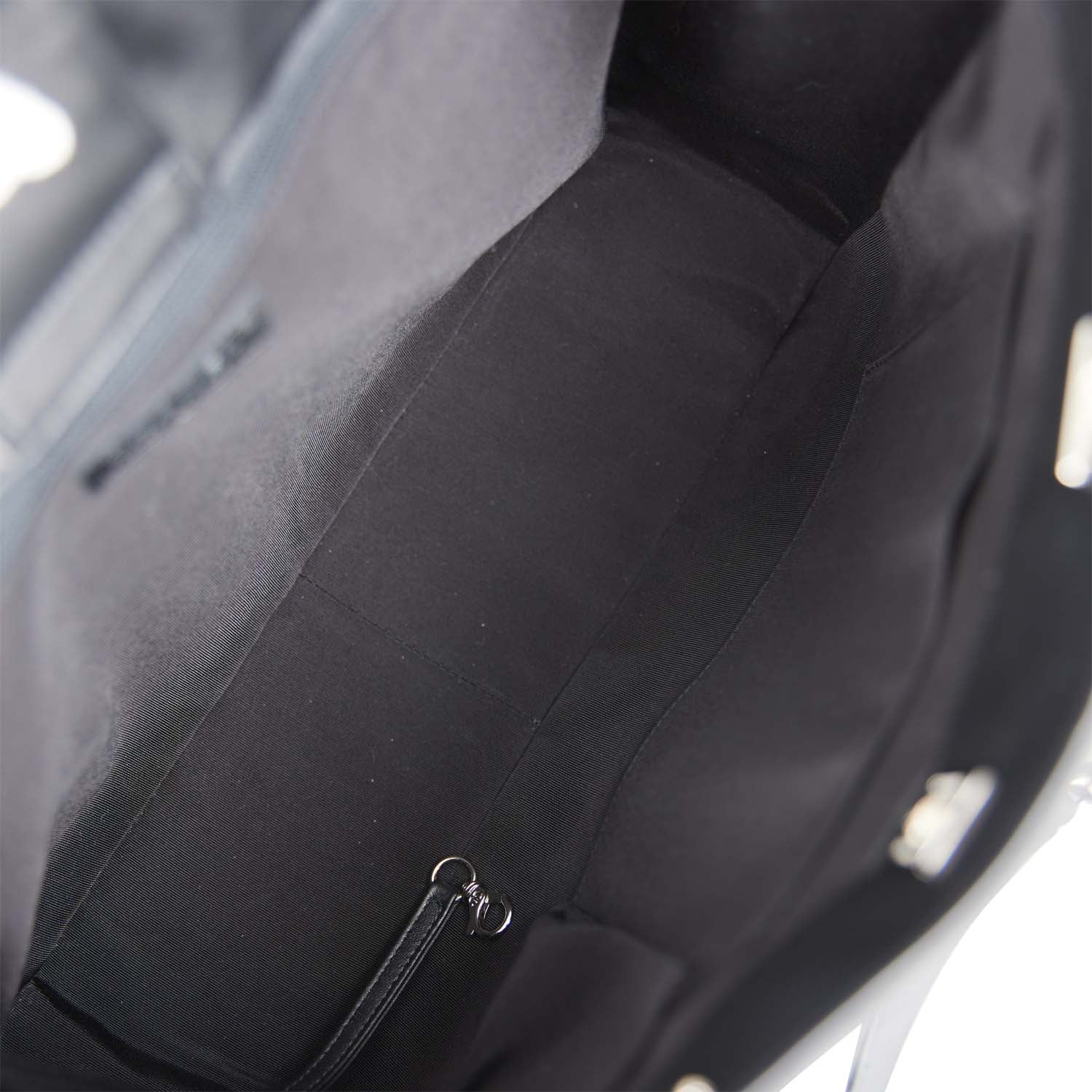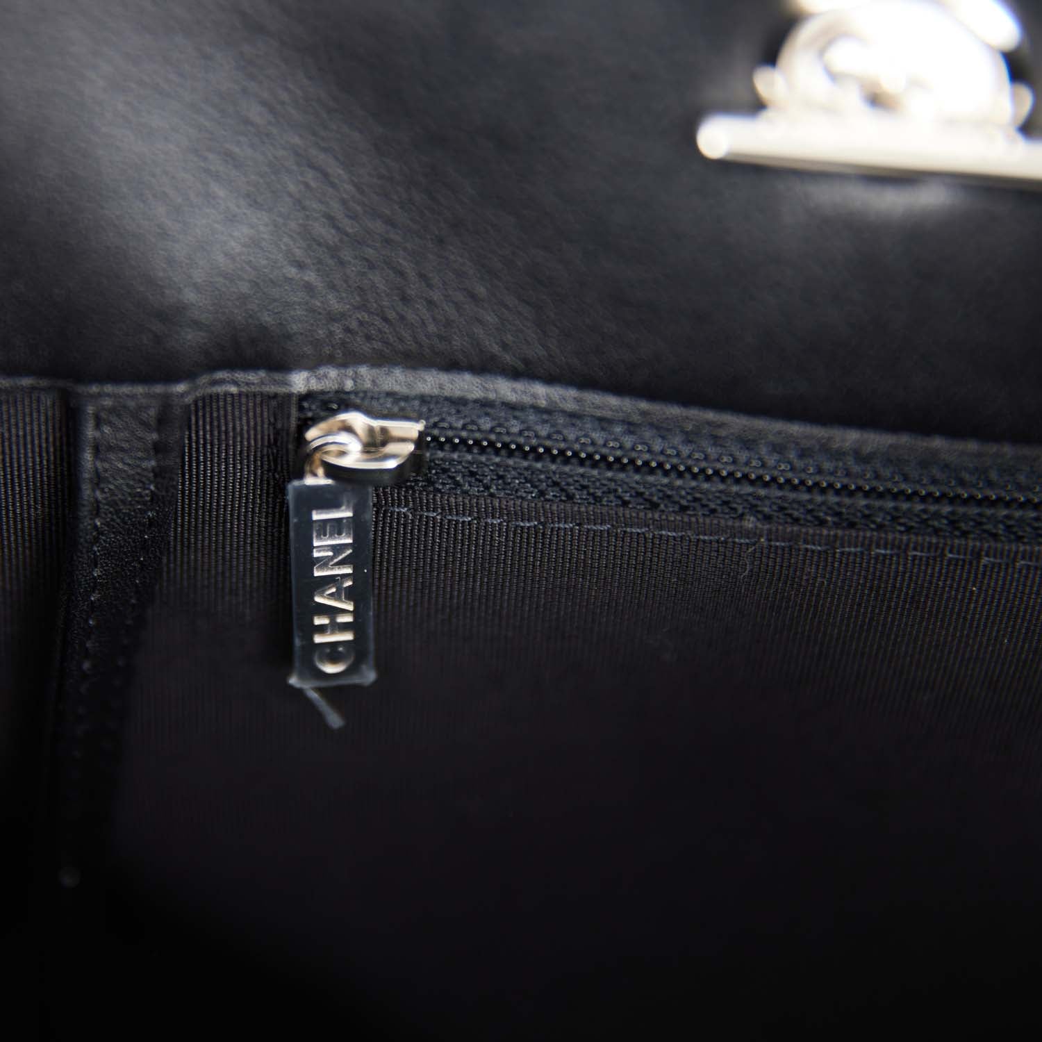 This Timeless tote bag is made of black calfskin with silver tone hardware; featuring the CC signature clasp, rear exterior slip pocket and interwoven silver tone chain link and black leather shoulder straps.