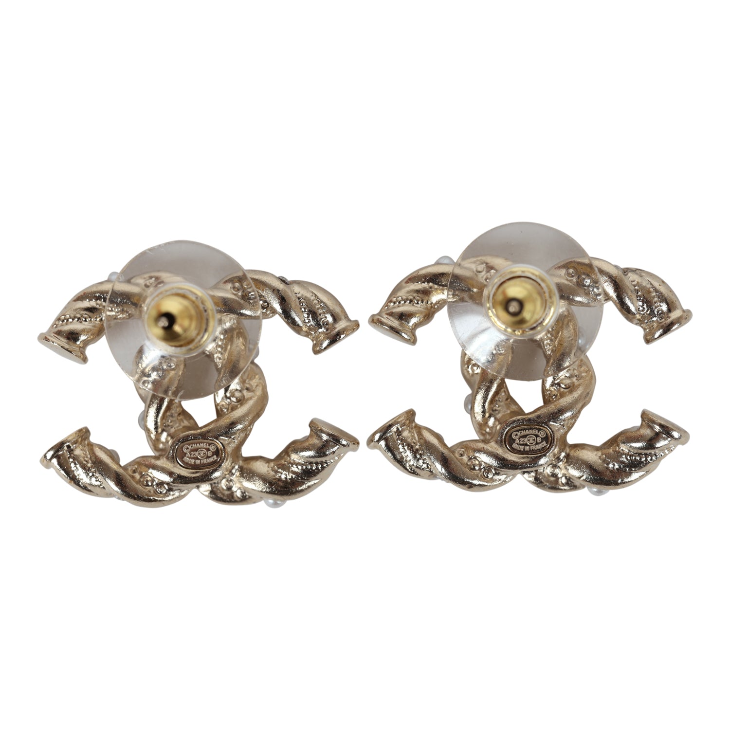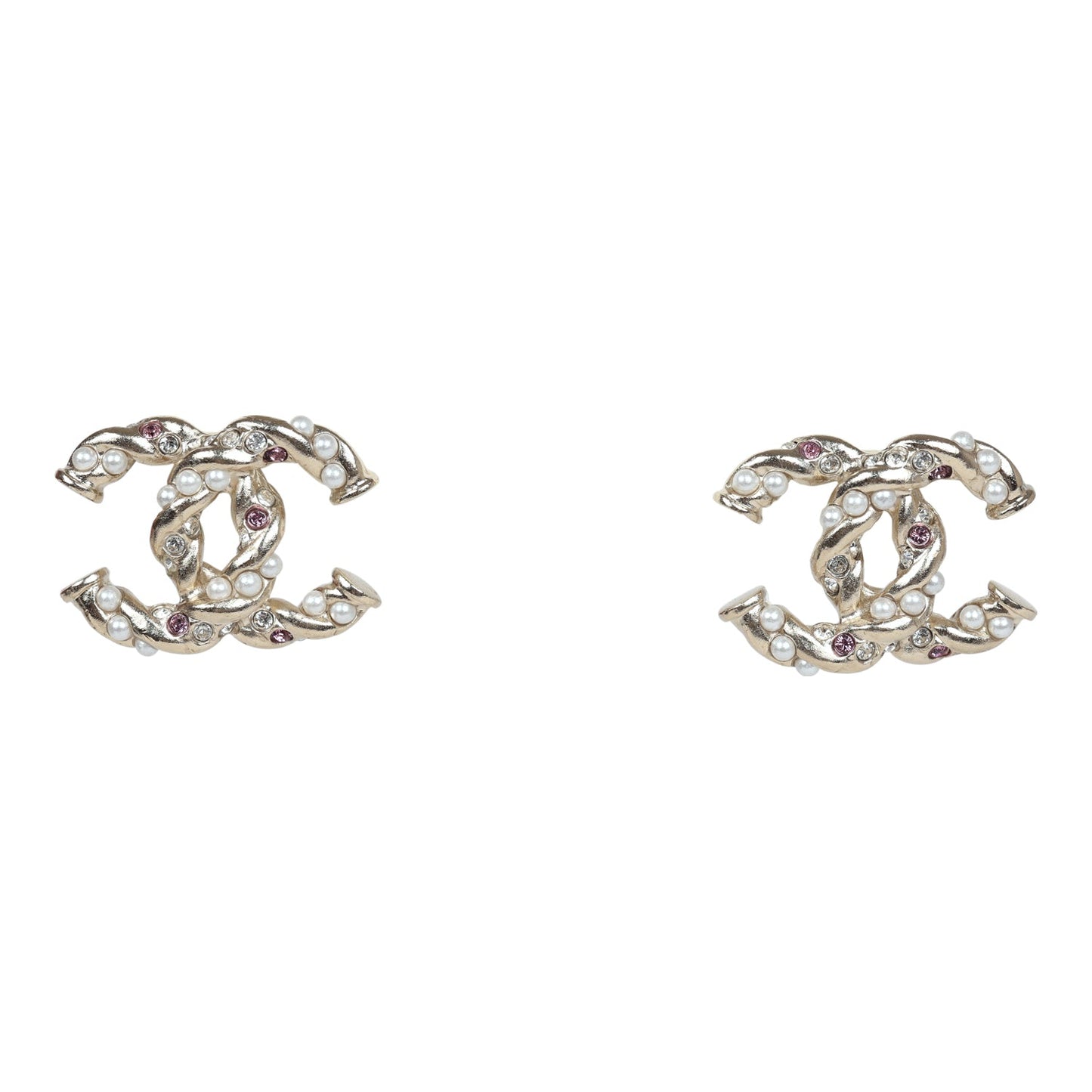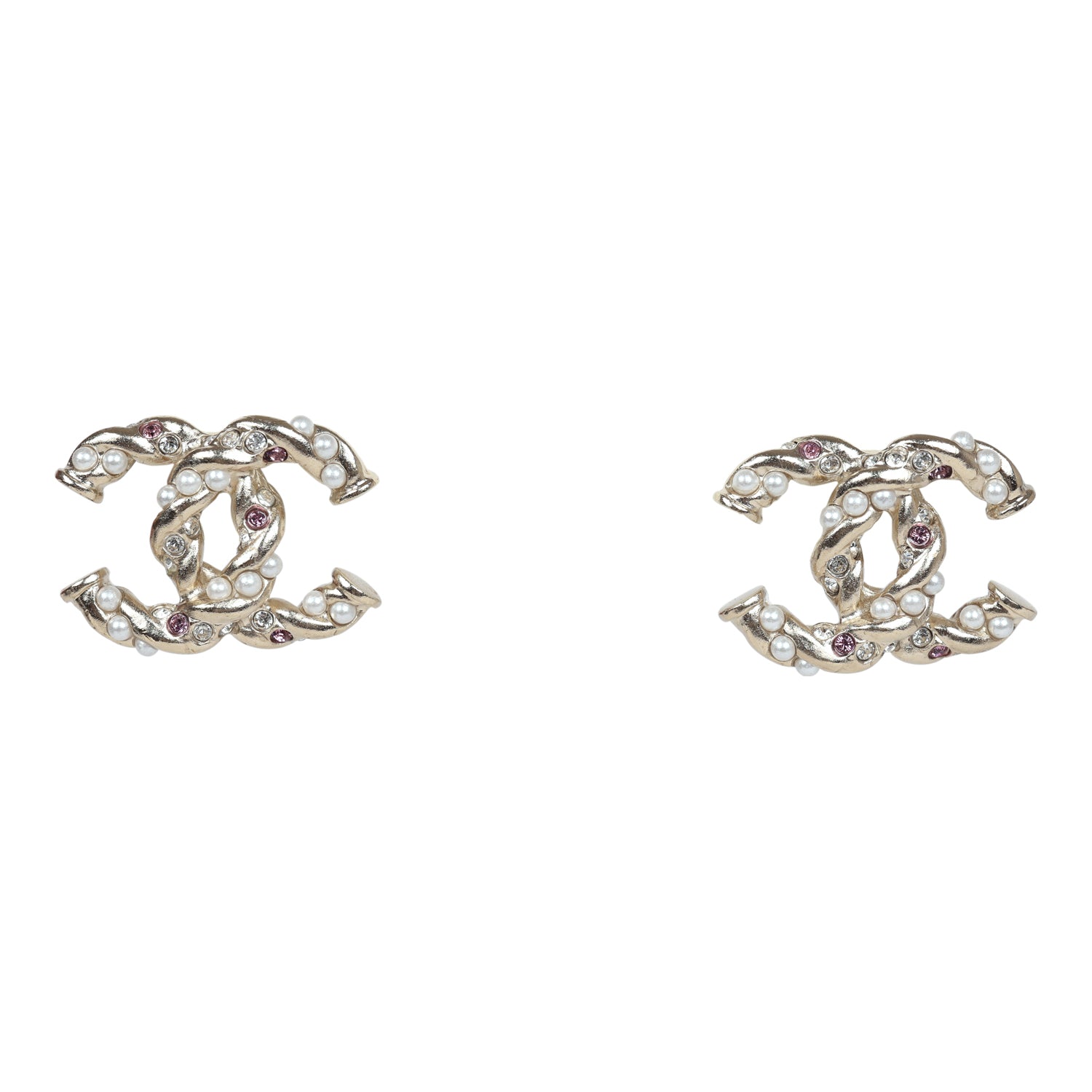 These CC logo earrings are in twisted Gold tone metal with pearls, White and Light Pink crystals intertwined.