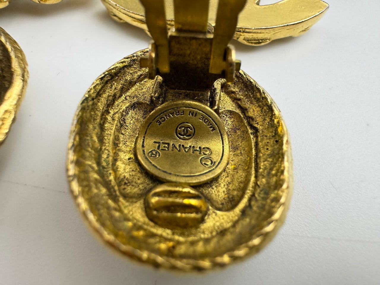 Add a touch of vintage glamour to any outfit with these Chanel Rhinestone & Gold-plated Earrings. Featuring a round relief design, they are perfect for any occasion. The clip-on style provides comfort and the gold-plated material adds a classic touch. Elevate your style with these stunning earrings.