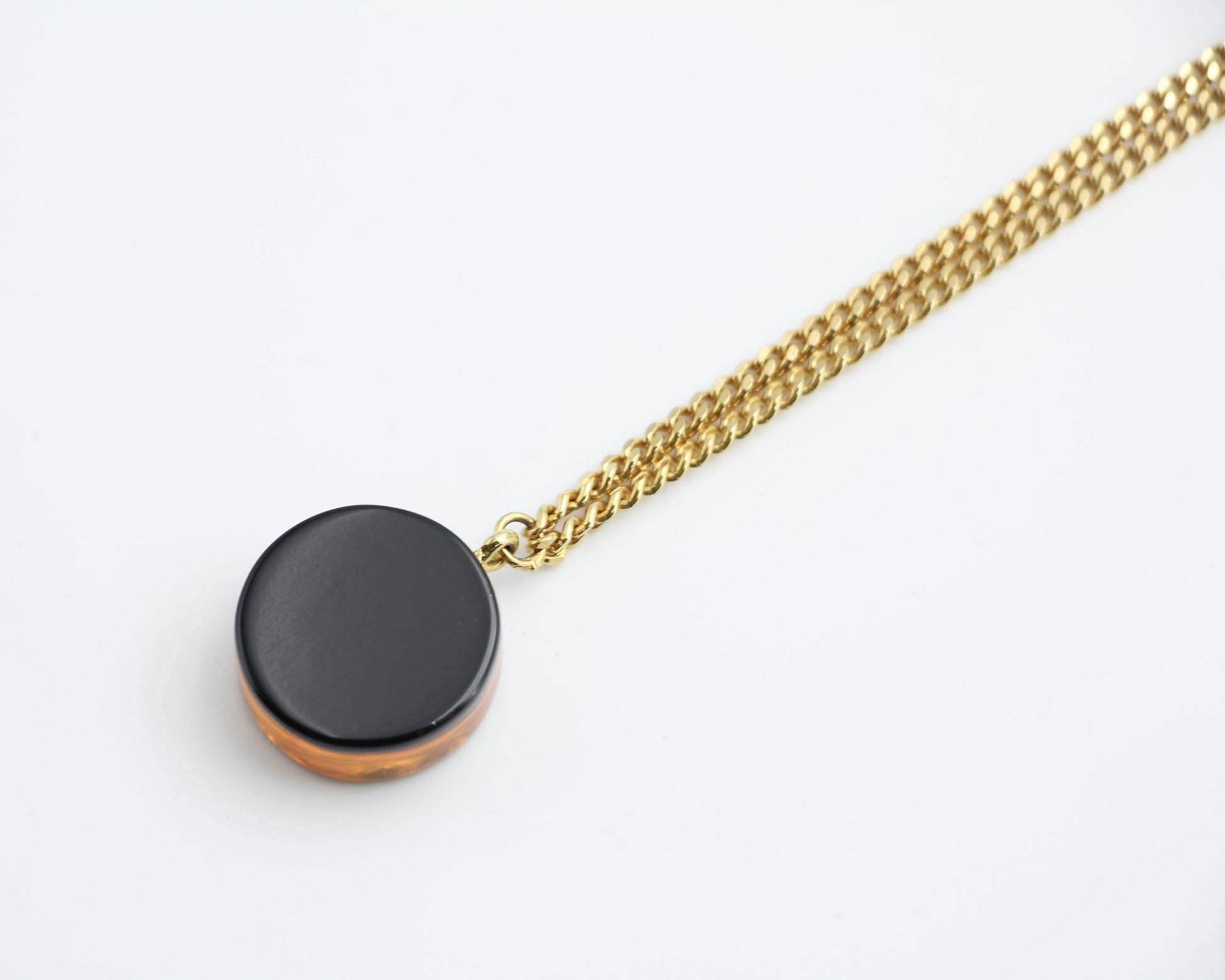 Expertly crafted by Chanel, this vintage 98A necklace features a dark brown acrylic camellia pendant. The iconic flower design exudes elegance and sophistication, making it the perfect statement piece for any outfit. Add a touch of vintage luxury to your collection with this stunning necklace.