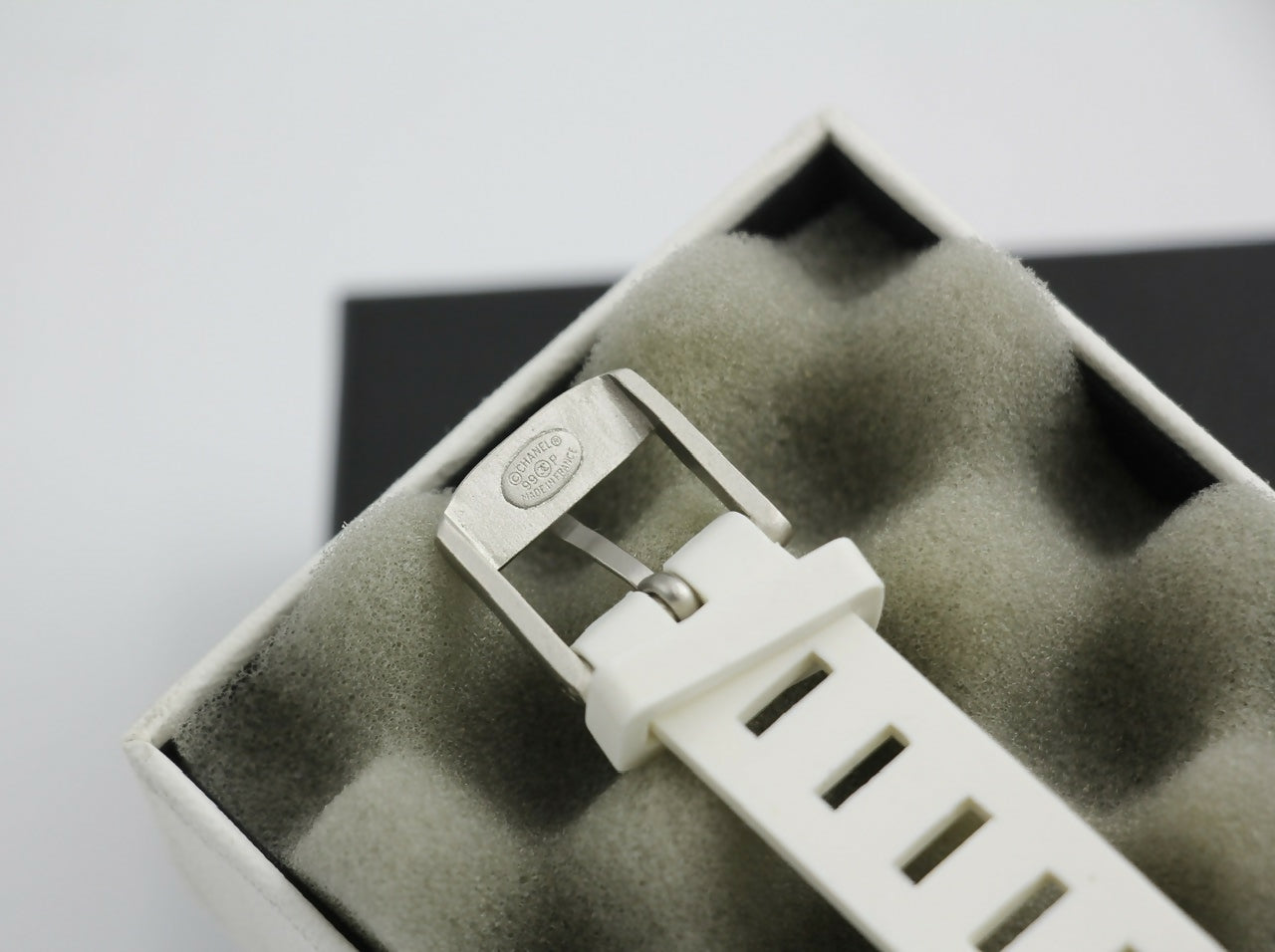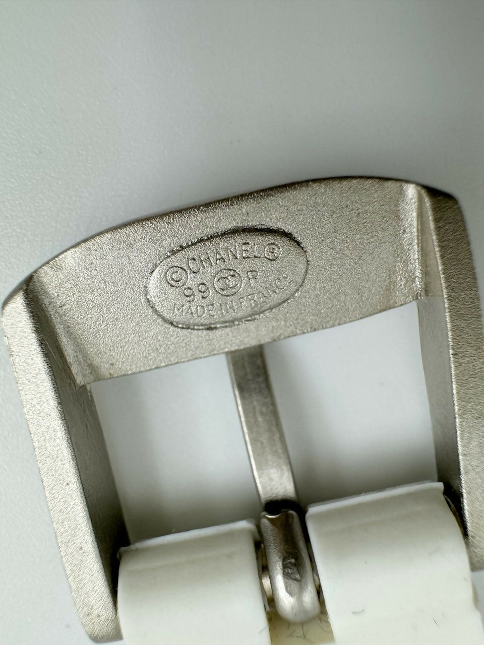 Introducing the Chanel Vintage 99P Rubber Pink with Peach Wording Bracelet, a unique blend of style and functionality. The rubber material provides durability while the pink and peach colors add a touch of femininity. Elevate your outfit and make a statement with this vintage piece.