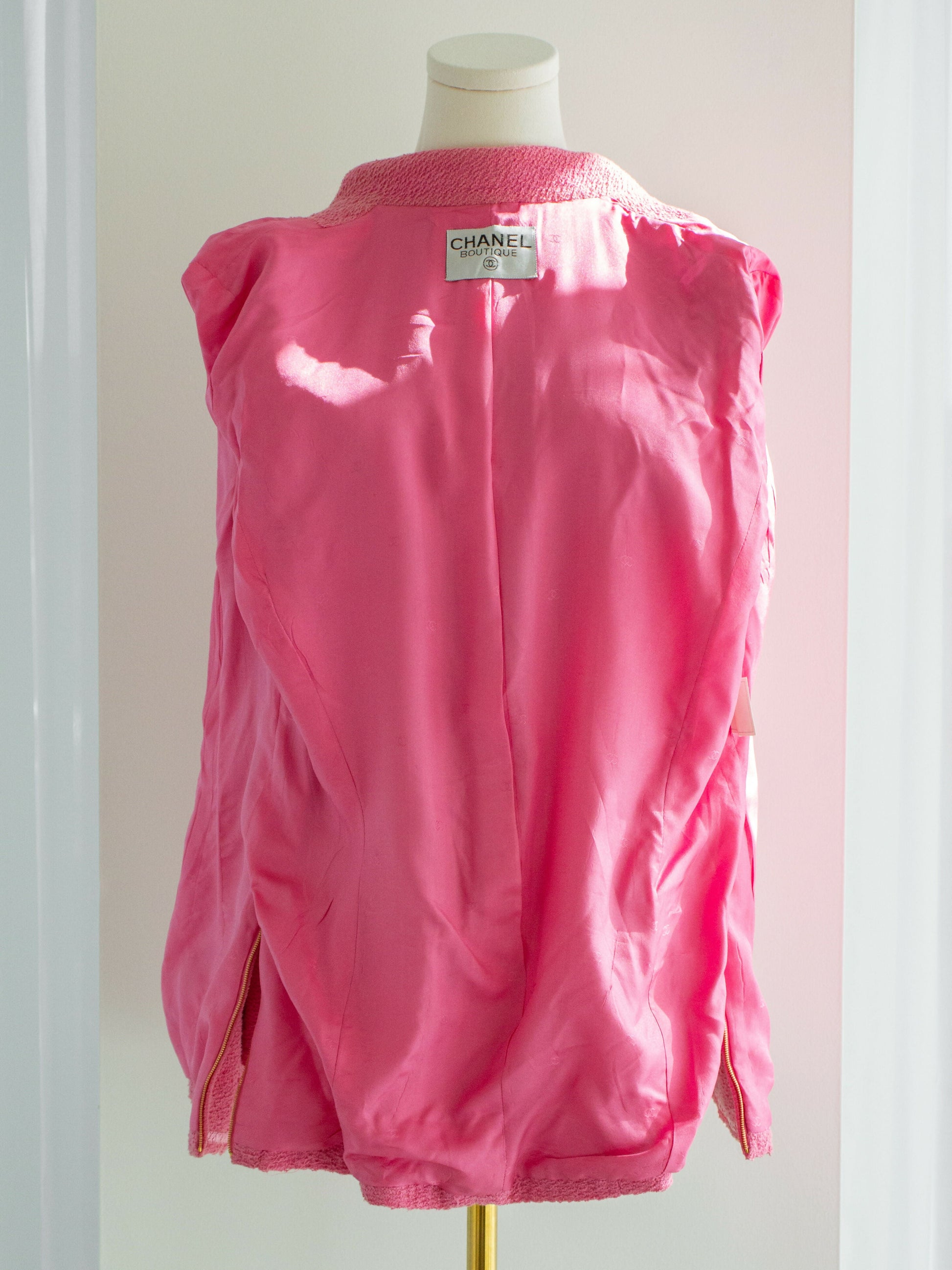 Presenting an extraordinary find: the rare pink tweed jacket from Chanel's Spring/Summer 1995 "Barbie" collection. This coveted collector's set showcases a long-sleeved tweed jacket adorned with delicate braided trims, four practical patch pockets and glistening gold zippers on the front and sides.