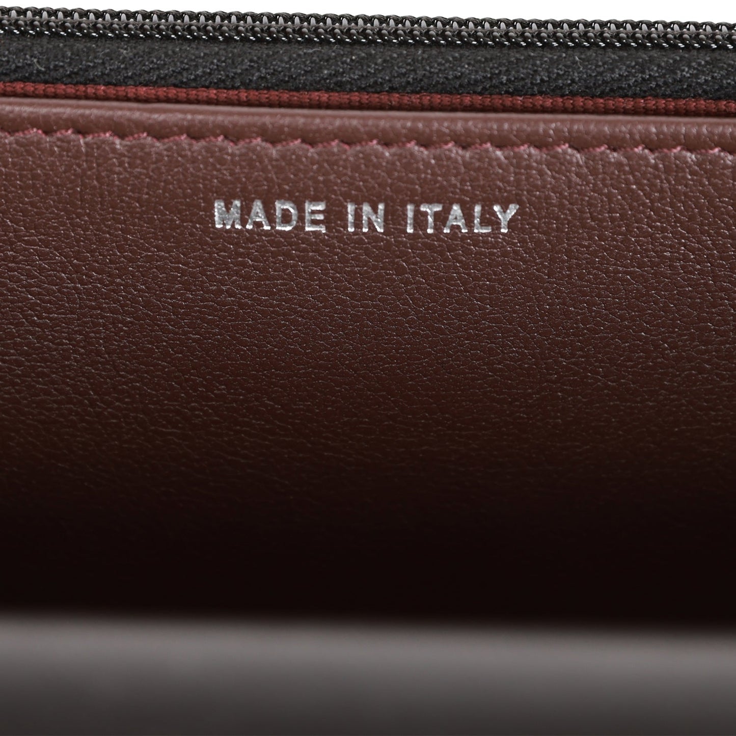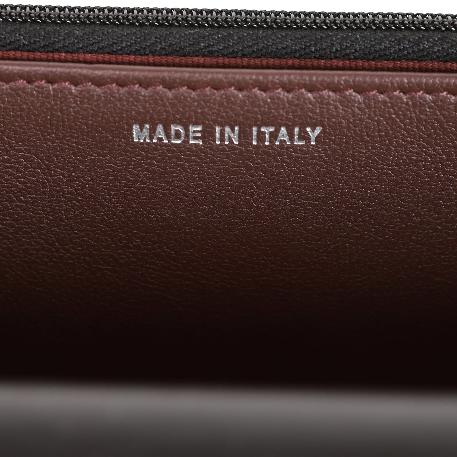 The interior is lined in burgundy leather and fabric and features a top zipper pocket under flap, a slit front pocket, a zipper compartment with leather pull, and an open pocket with six credit card slots.