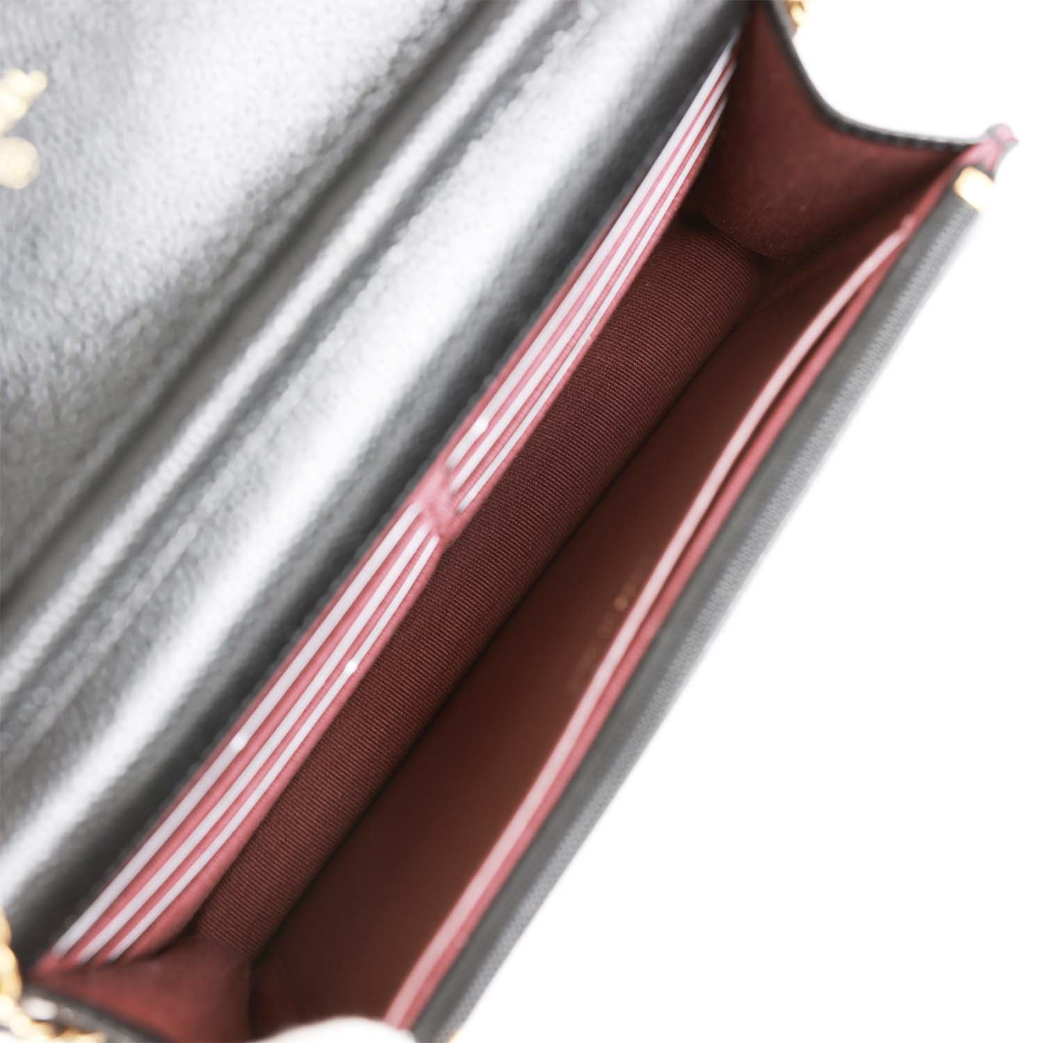 This Wallet on Chain is of black caviar with gold tone hardware and has a front flap with CC emblem, half moon back pocket and long light gold tone metal and light pink leather chain.
