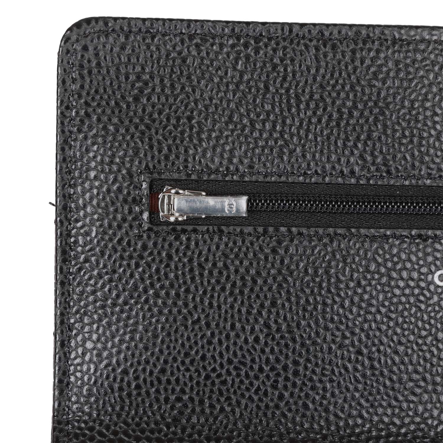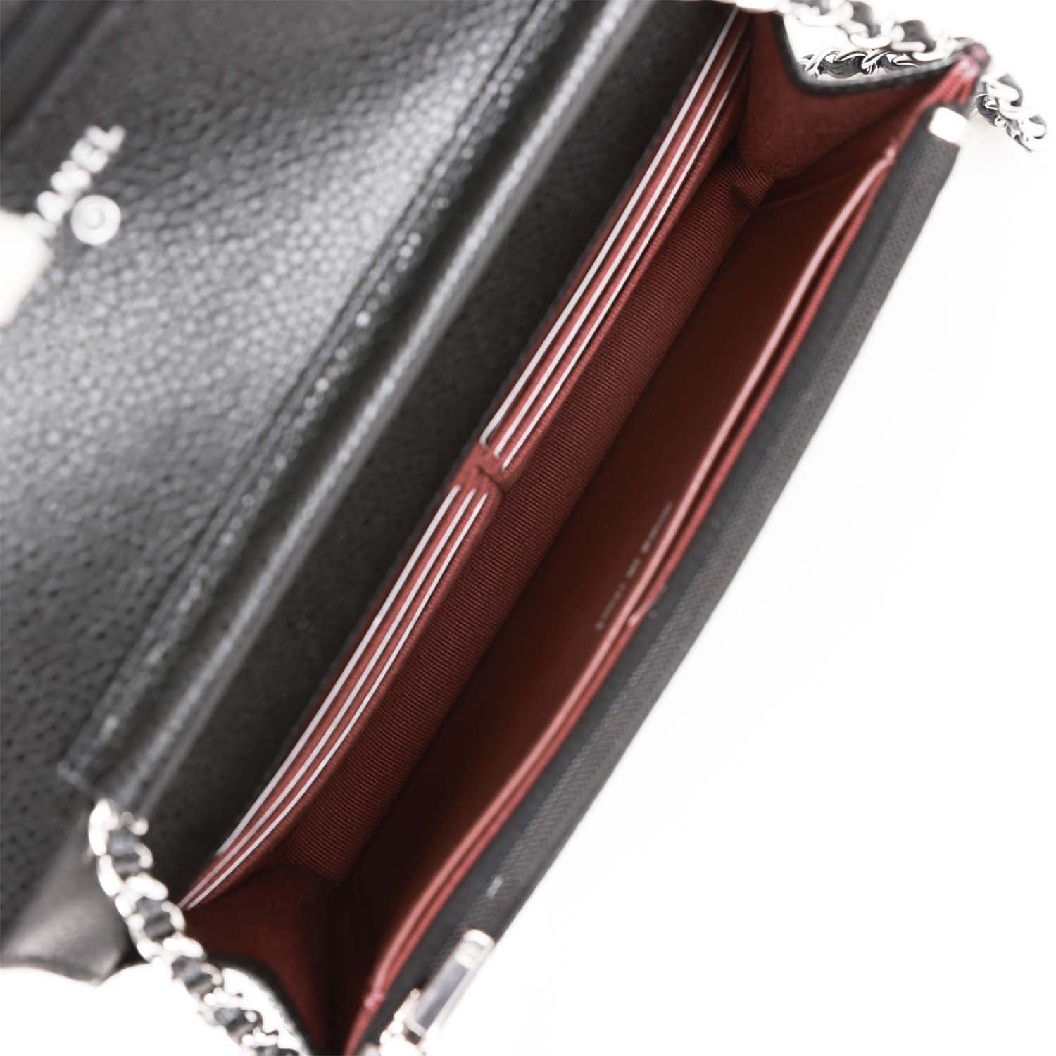 This Wallet on Chain is of black caviar with silver tone hardware and has a front flap with CC emblem, half moon back pocket and long silver tone metal and black leather chain.