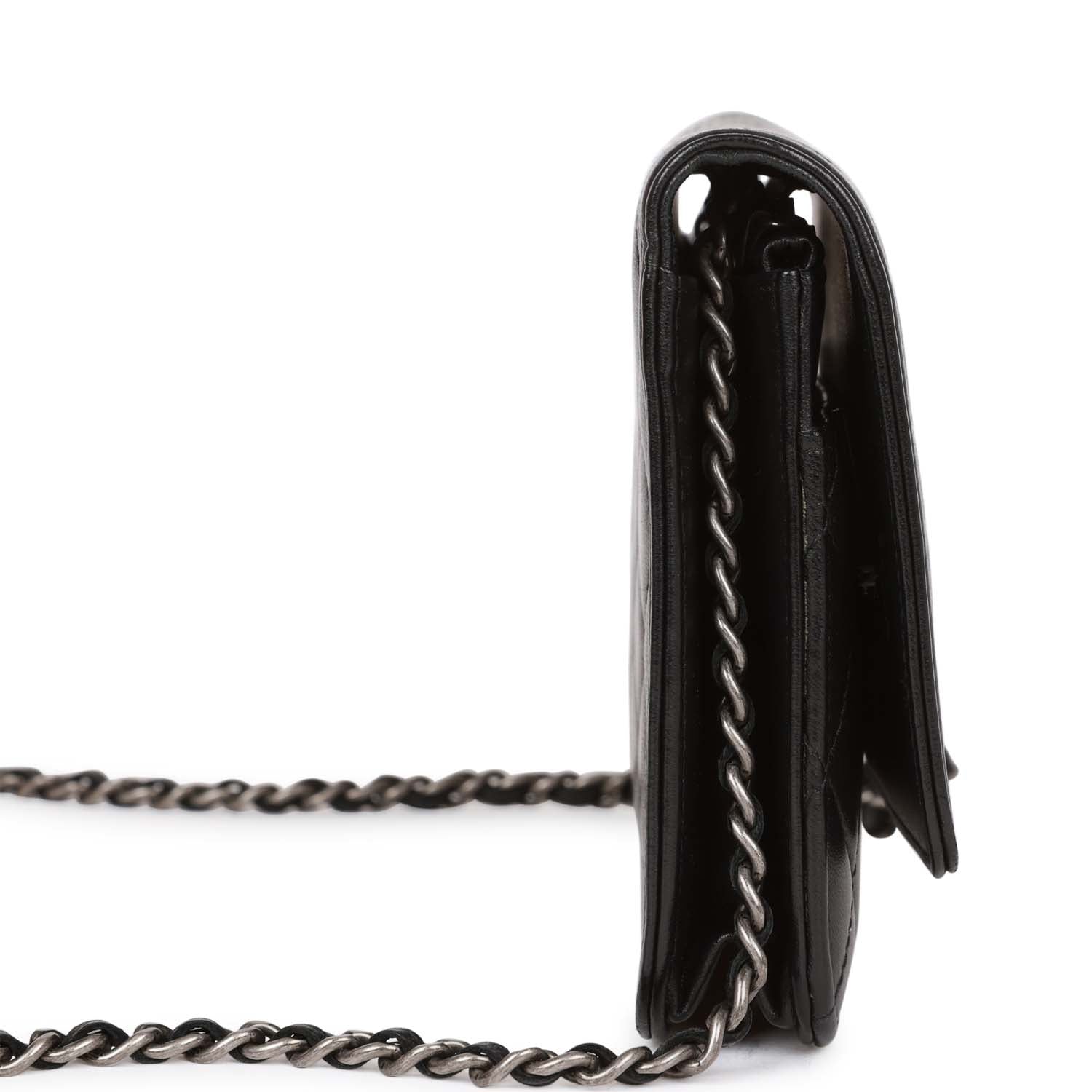 This Wallet on Chain is of Black lambskin with aged silver tone hardware and has a front flap with boy CC emblem, half moon back pocket and long silver tone metal and black leather chain.