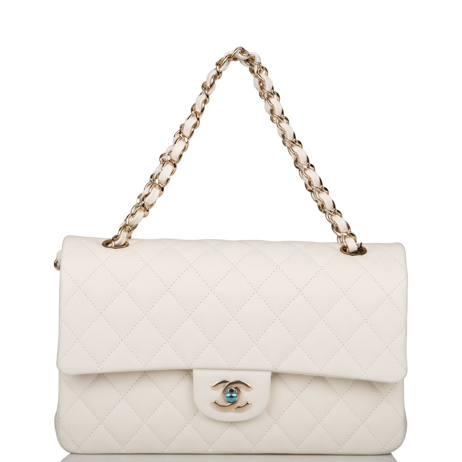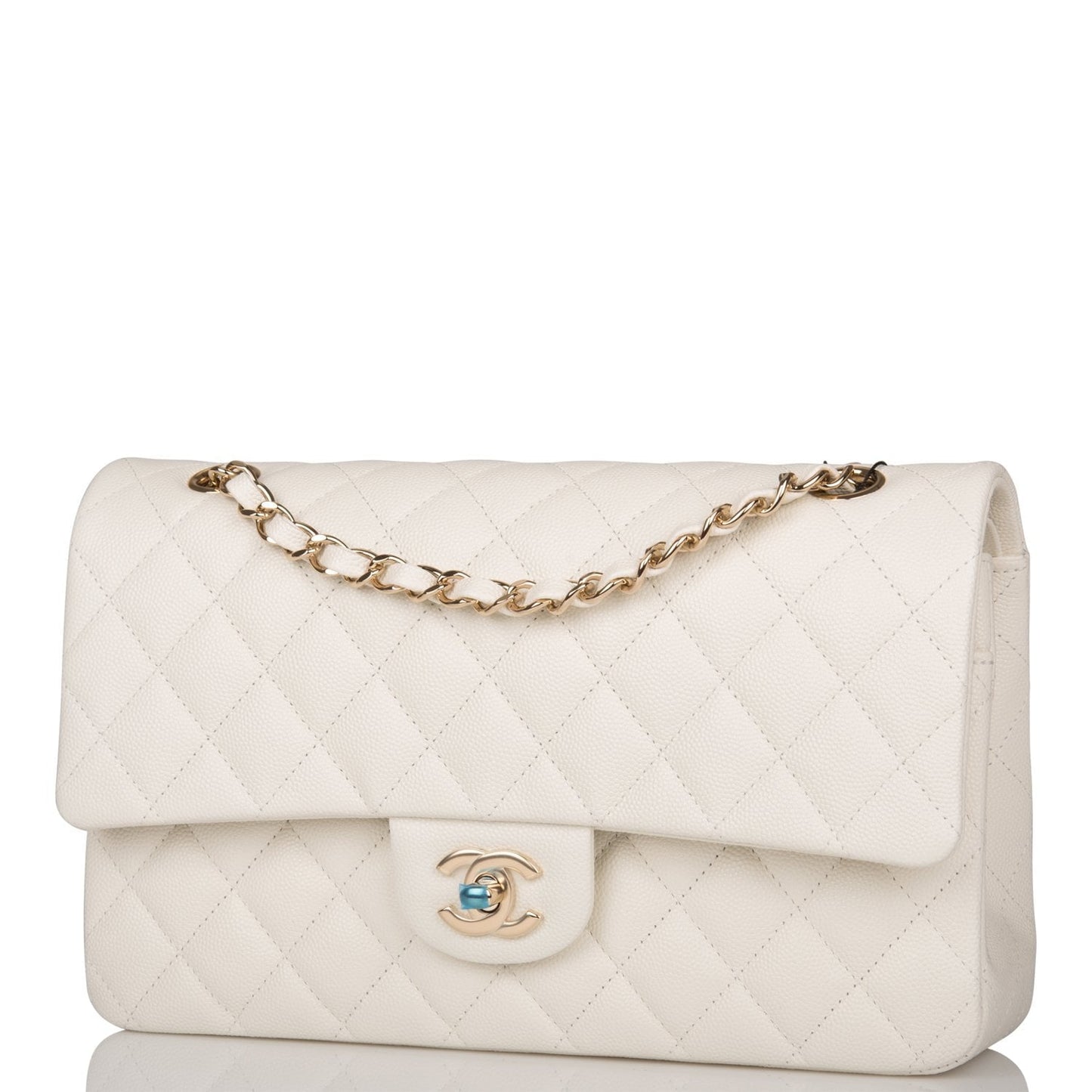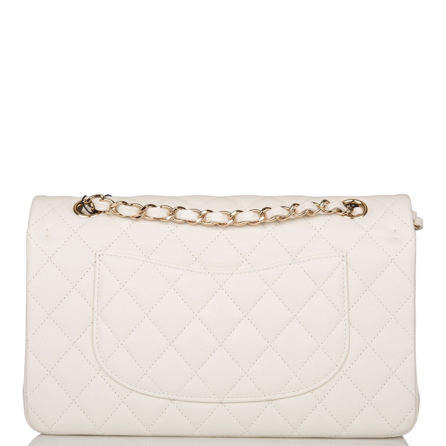 Chanel White Quilted Caviar Medium Classic Double Flap Bag Light Gold Hardware