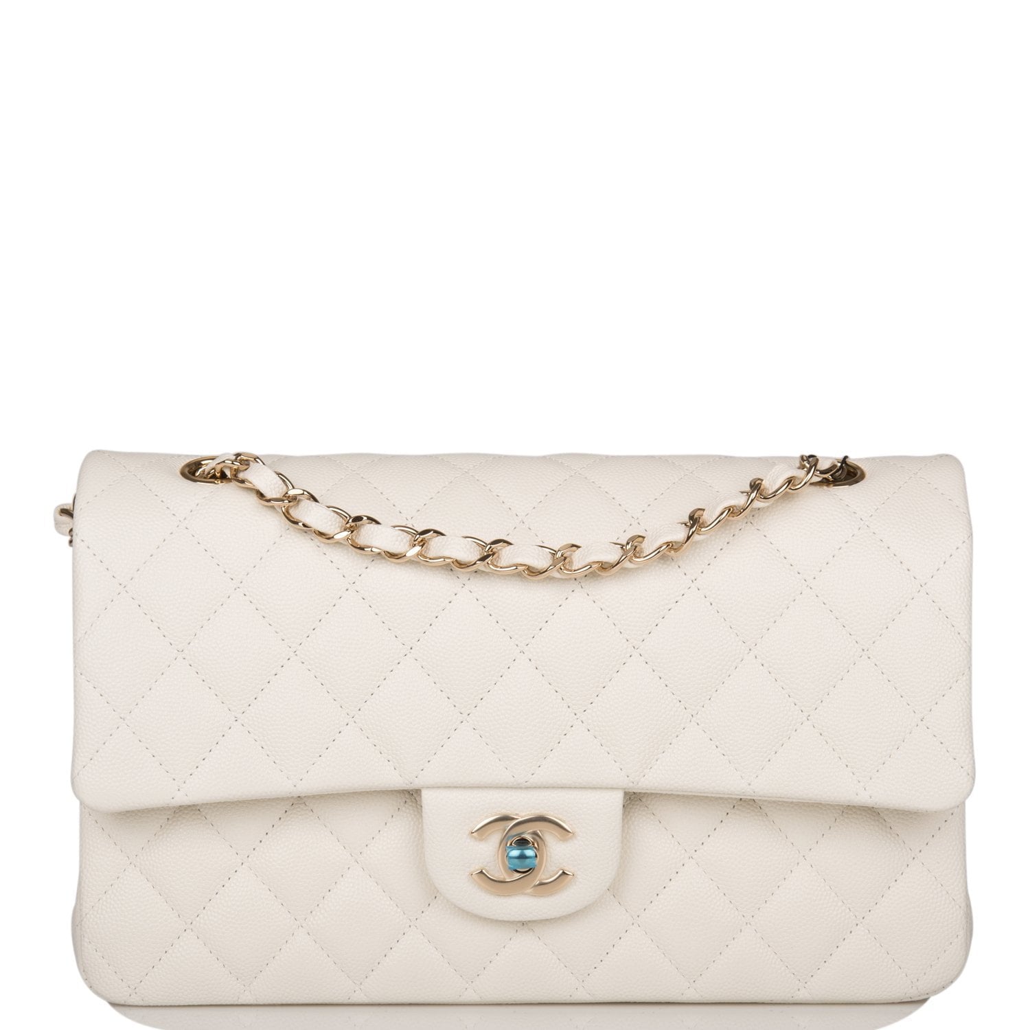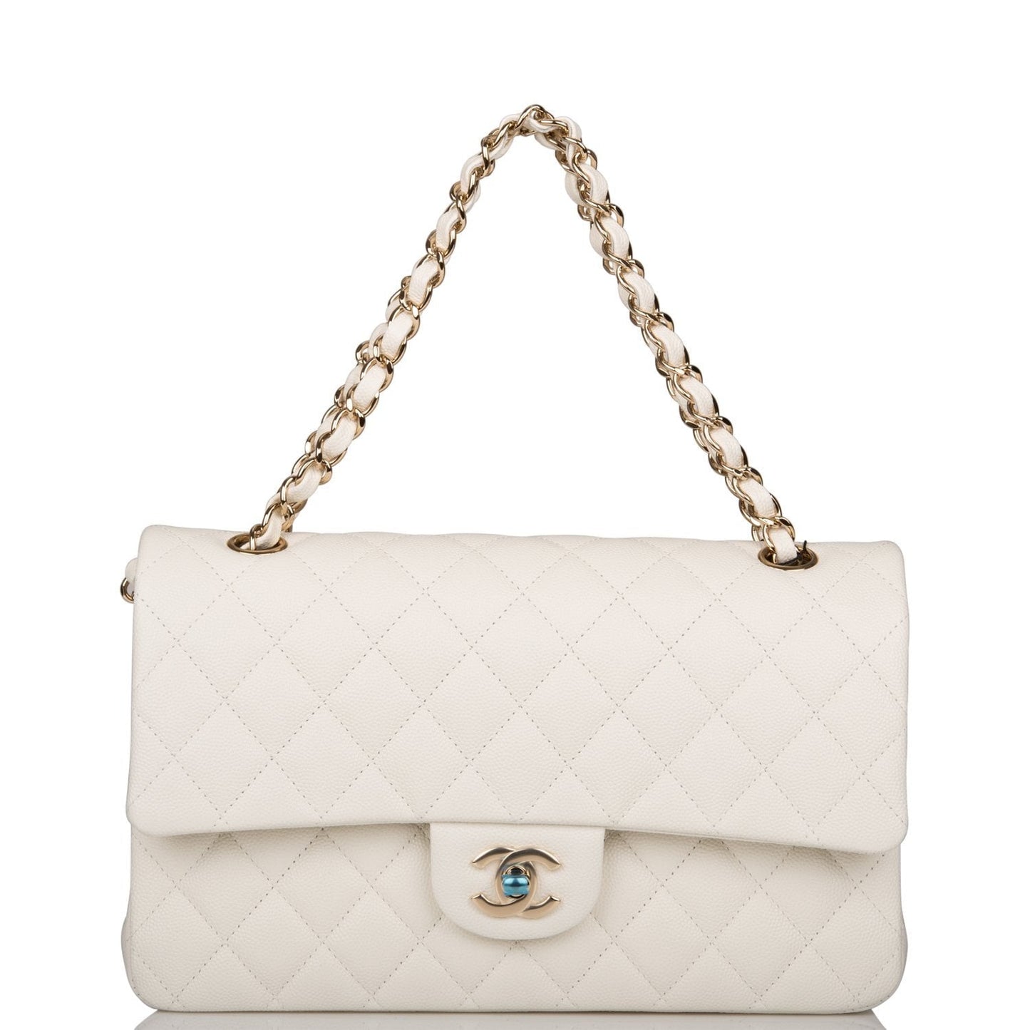 This Medium Classic Double Flap bag is in white caviar leather with light gold tone hardware and features a front flap with signature CC turnlock closure, half moon back pocket, and adjustable interwoven light gold tone chain link and white leather shoulder strap.