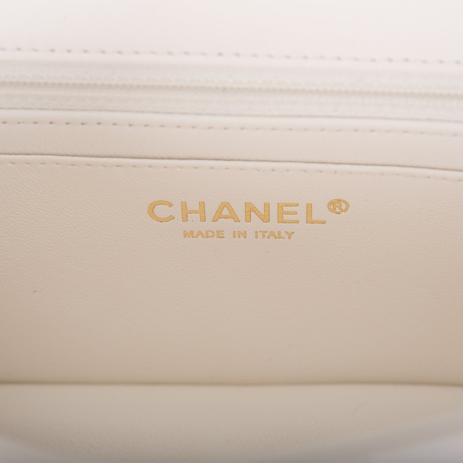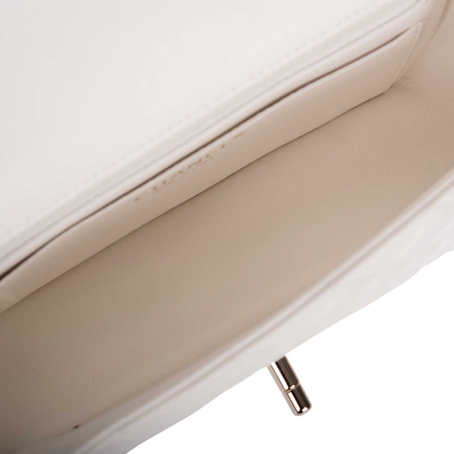 The interior is lined in white leather and features a zipper pocket with Chanel pull and an open pocket below.