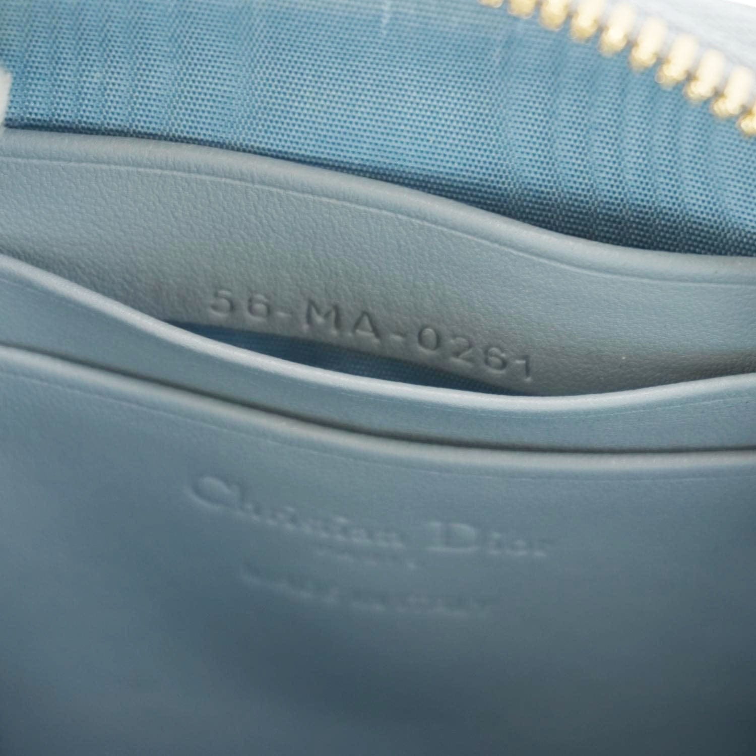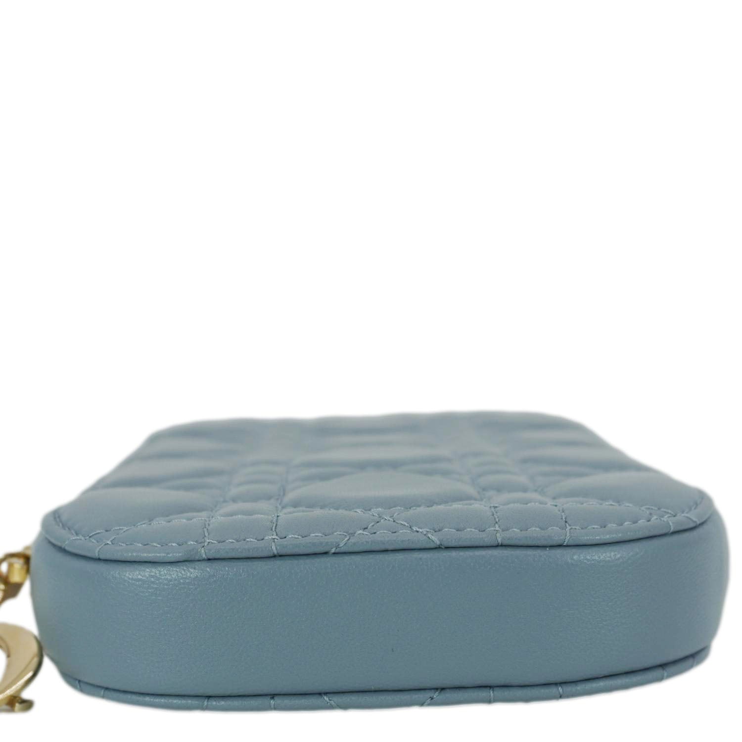 The Christian Dior Lady Dior Call'in Cannage Leather Phone Holder in blue showcases the brand's signature Cannage quilting and iconic "D.I.O.R." charms. Compact and elegant, it’s a chic accessory for carrying your phone and essentials with effortless sophistication.