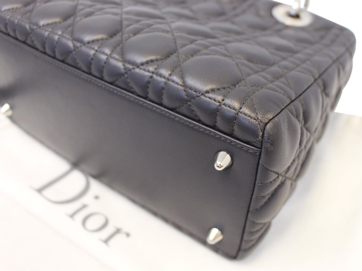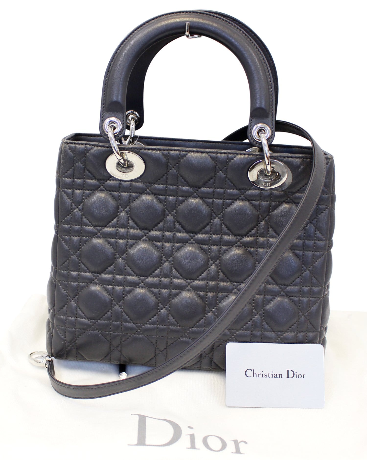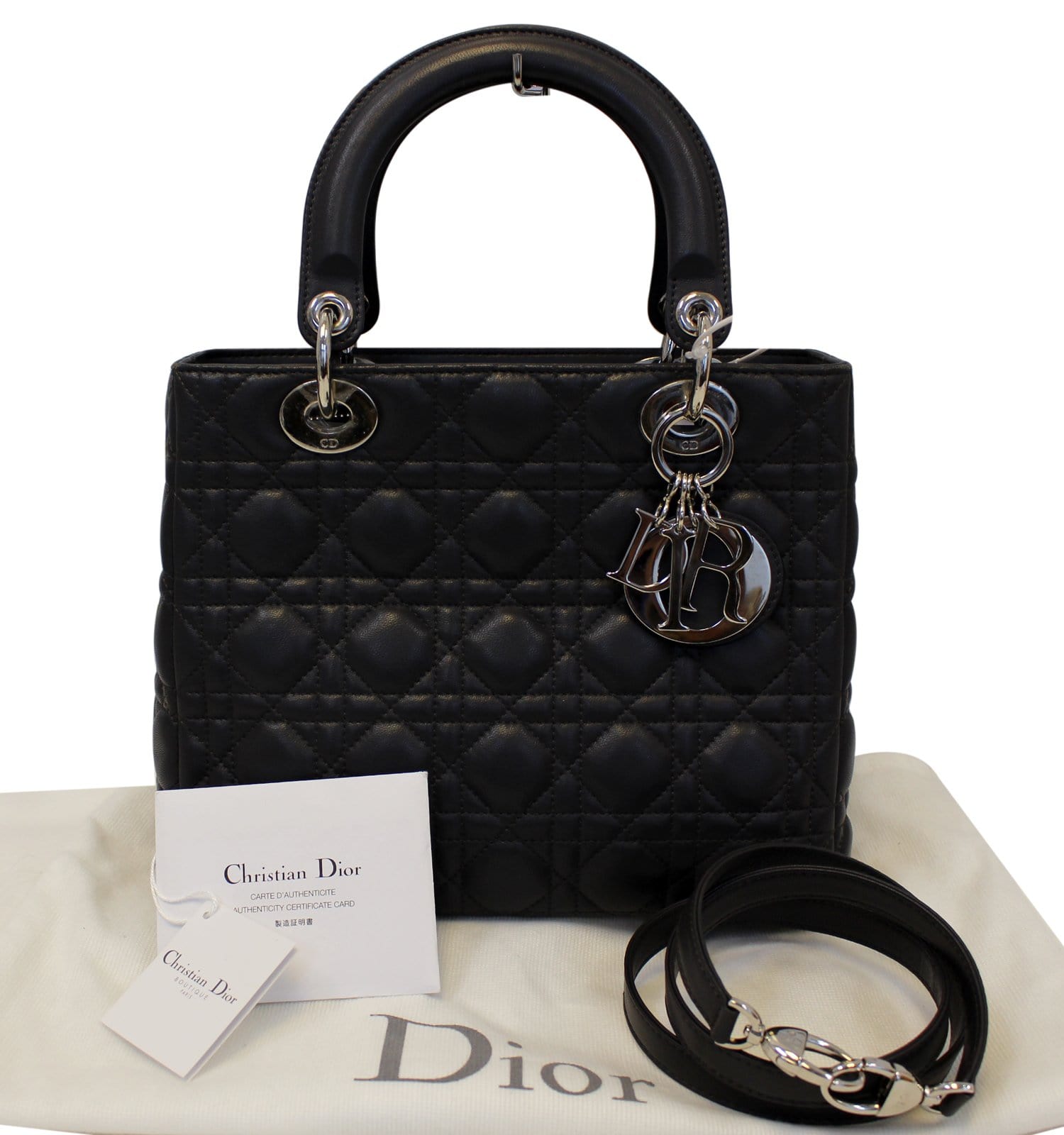 Christian Dior Black Cannage Lambskin Leather Lady Dior Medium Tote Bag is the one for you! This structured bag is made of buttery soft quilted leather with a quilted pattern embroidery. It features a black pink leather and dangling silvertone DIOR letter charms which adds some bling to this glamorous bag. It also comes with a detachable shoulder strap.