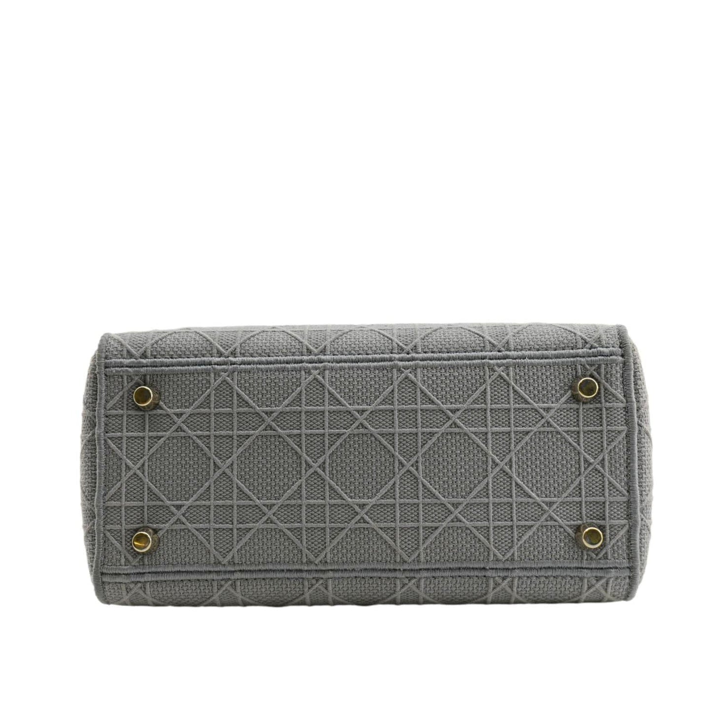 The Christian Dior Lady Dior D-Lite Shoulder Bag in gray embroidered Cannage canvas features the iconic quilted pattern, offering a modern twist on a classic design. With its elegant silhouette, top handles, and removable strap, this bag combines luxury and versatility, perfect for day or evening wear.