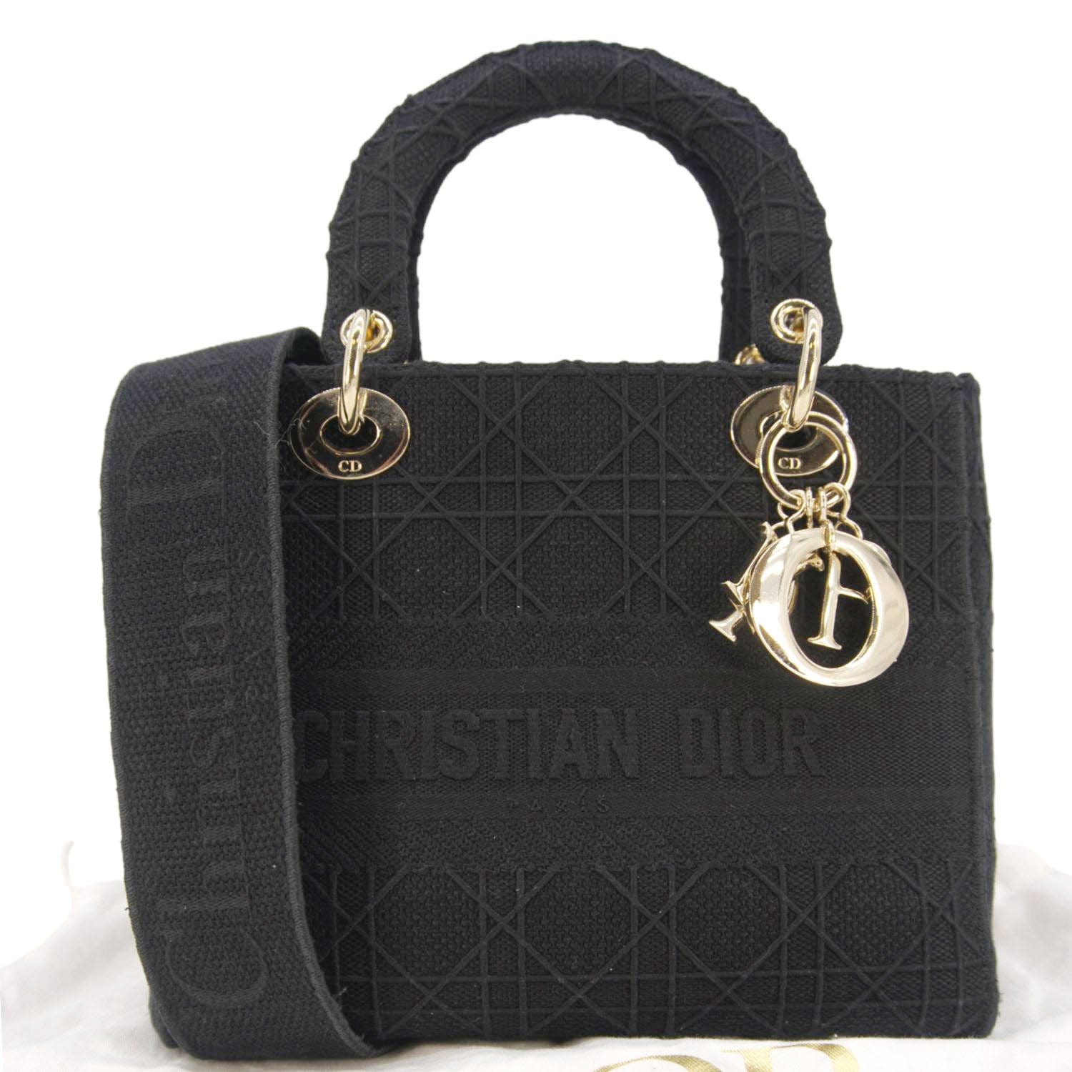The Christian Dior Lady D-Lite Shoulder Bag in black embroidered canvas exudes sophistication. It blends iconic elegance with modern versatility by showcasing intricate tonal embroidery, signature 'D.I.O.R.' charms, and a detachable strap.