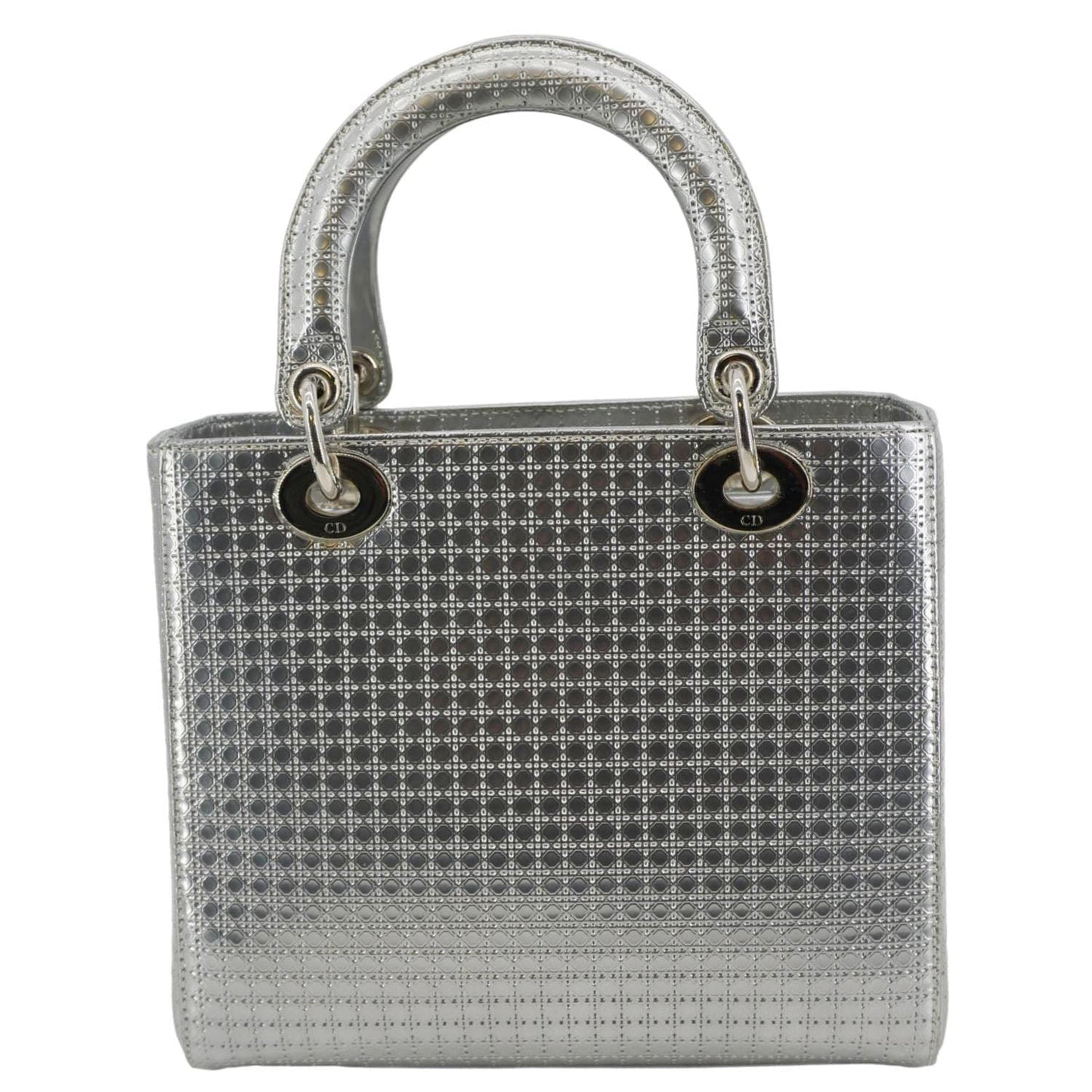 The Christian Dior Lady Dior Medium Shoulder Bag in metallic silver leather is a luxurious icon of elegance. It's a sophisticated statement piece for any occasion, featuring the signature cannage quilting, polished silver-tone hardware, and the iconic "D.I.O.R." charms.
