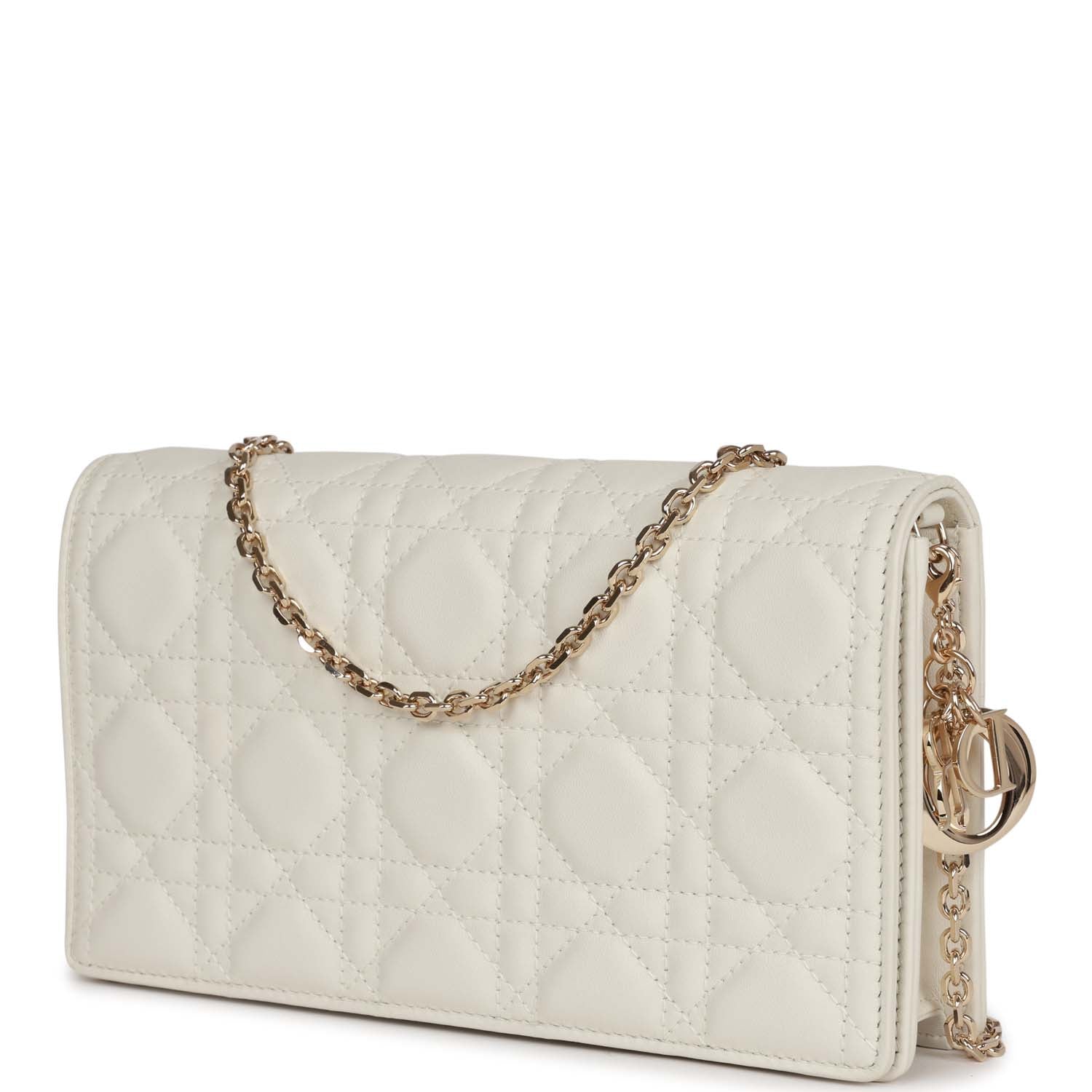 This Christian Dior Lady Dior Pouch is in Latte lambskin with gold hardware, a removable card holder and zip pouch, a detachable chain crossbody/shoulder strap, and a Dior charm.