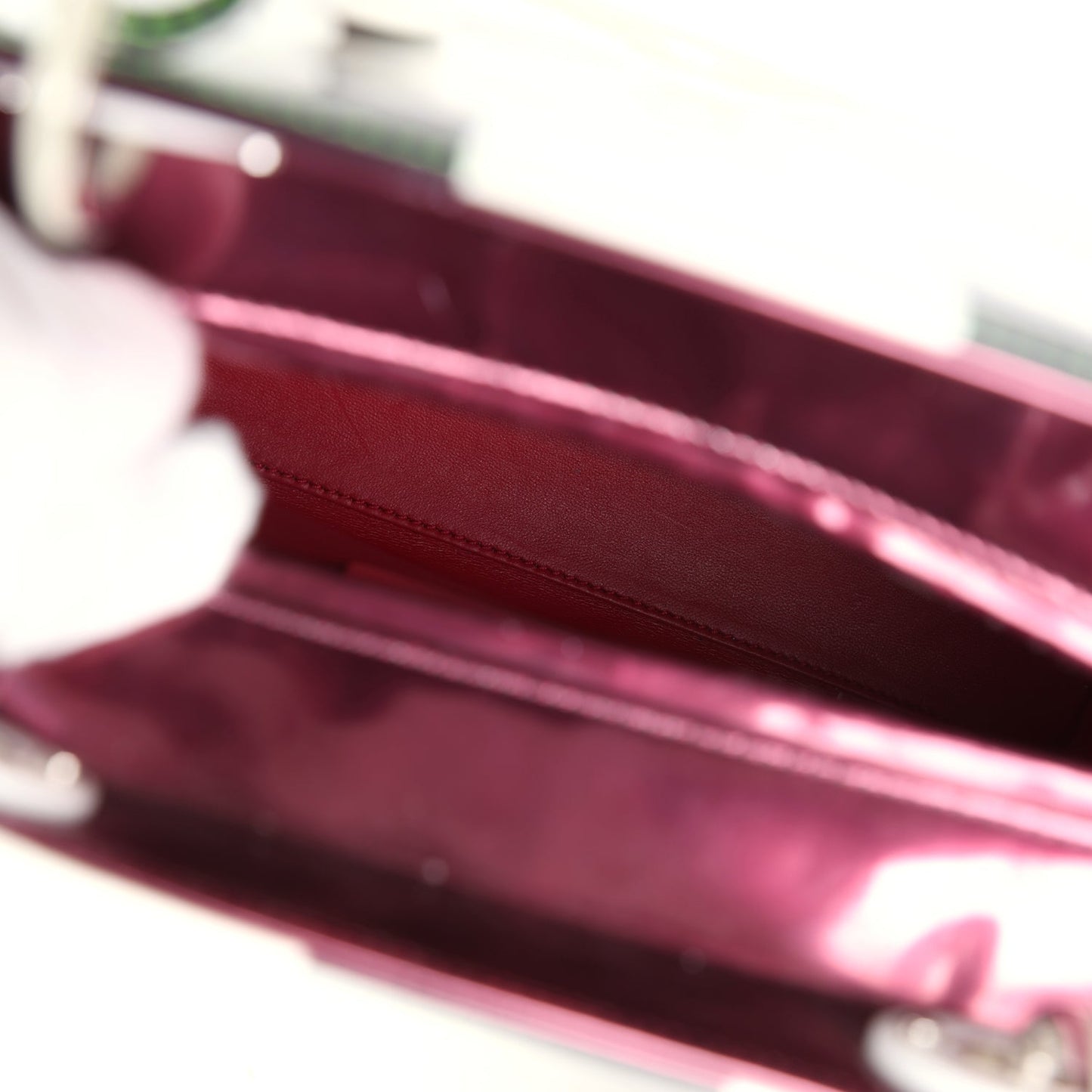 The interior is lined in pink leather and has one zip pocket on the rear wall.