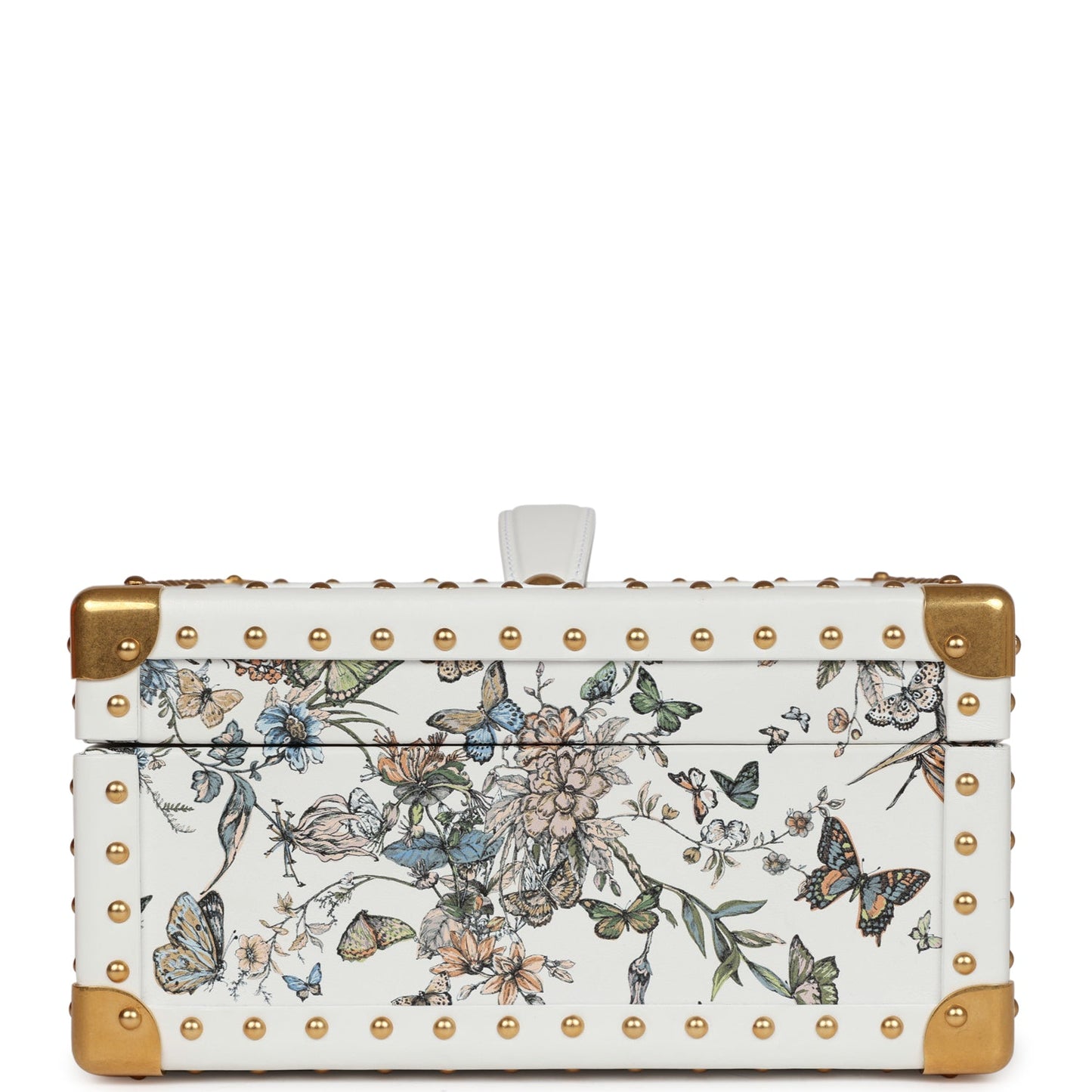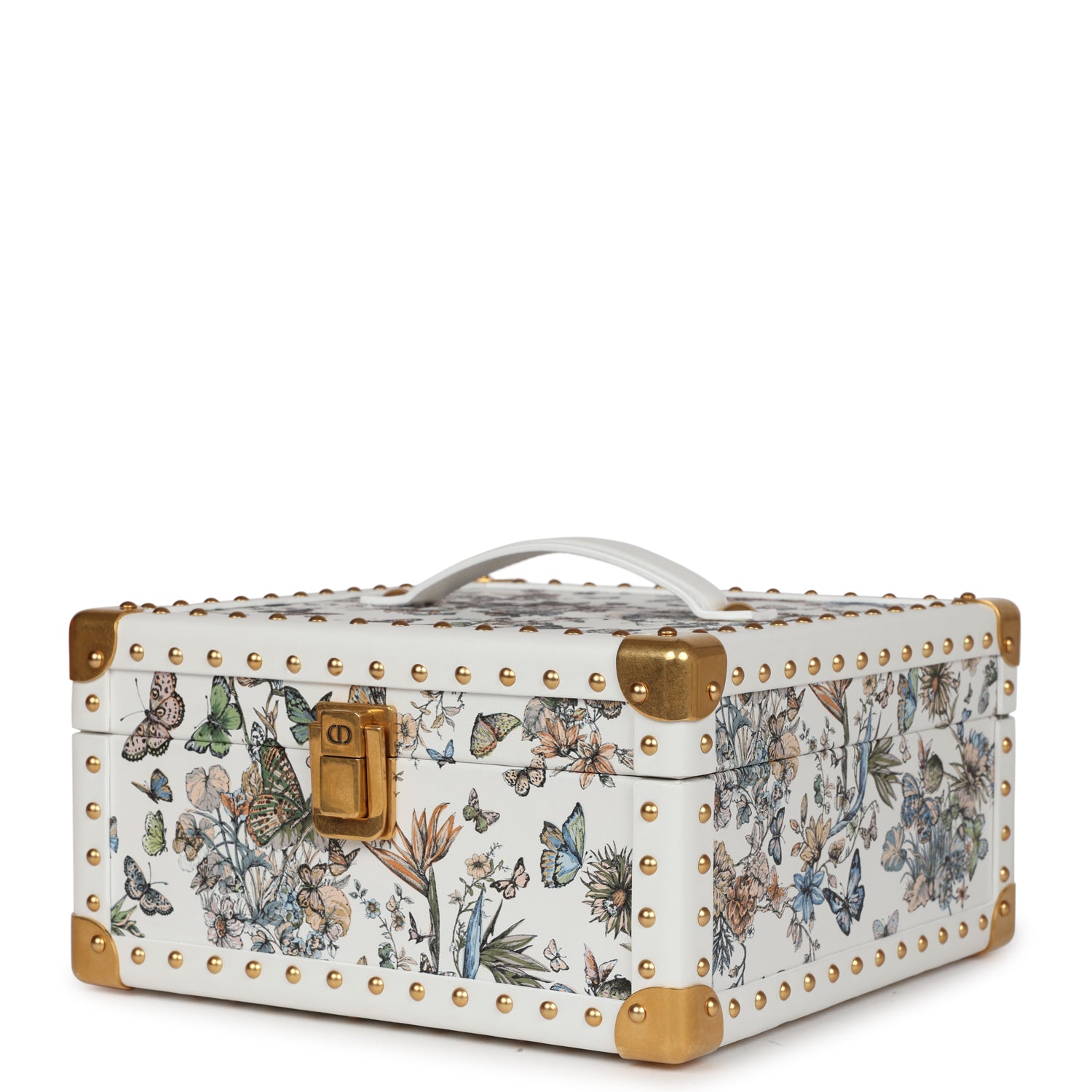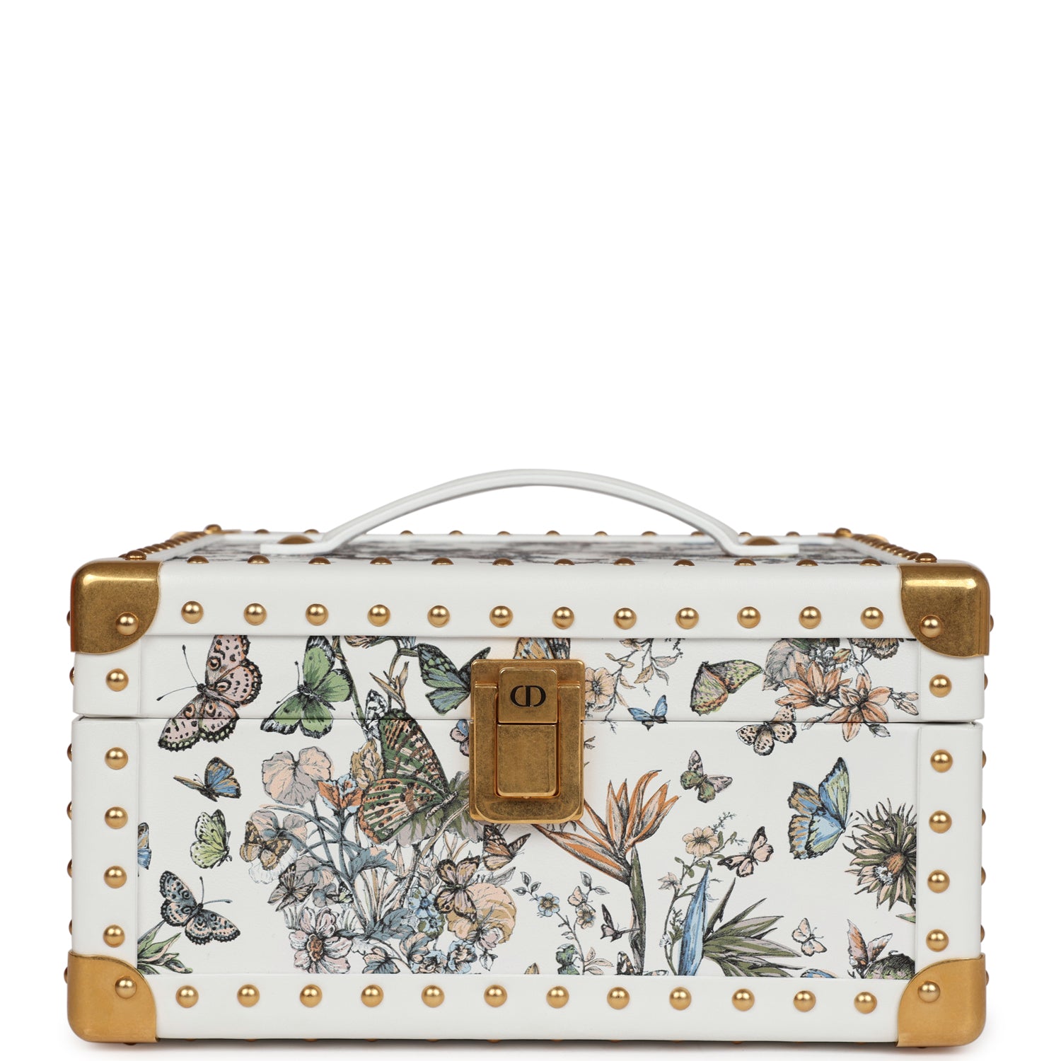 The Micro Lady Dior also comes in a White Multicolored Calfskin Leather Small Trunk. The Trunk also features a butterfly and floral motif in calfskin leather, Antique Gold Hardware, gold studs along the top, side and bottom, gold metal clasp closure, and soft suede/fabric interior.
