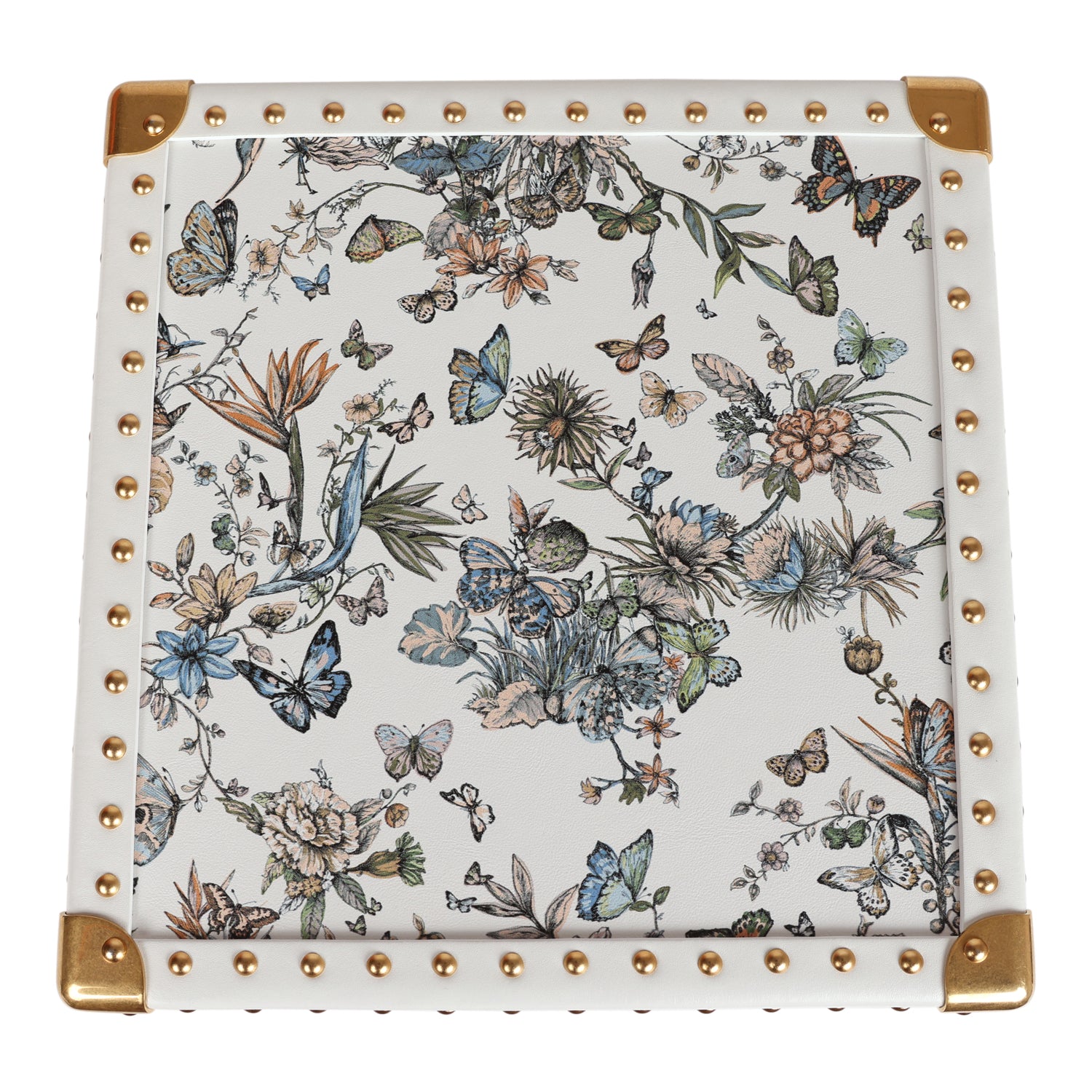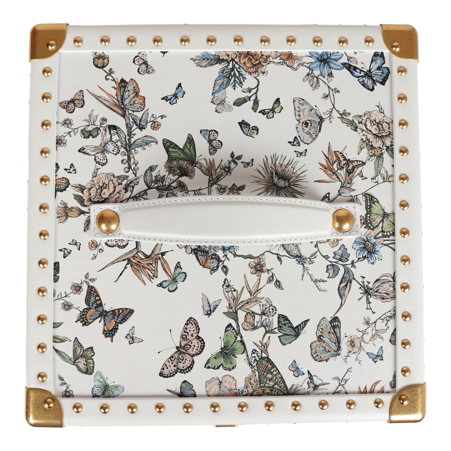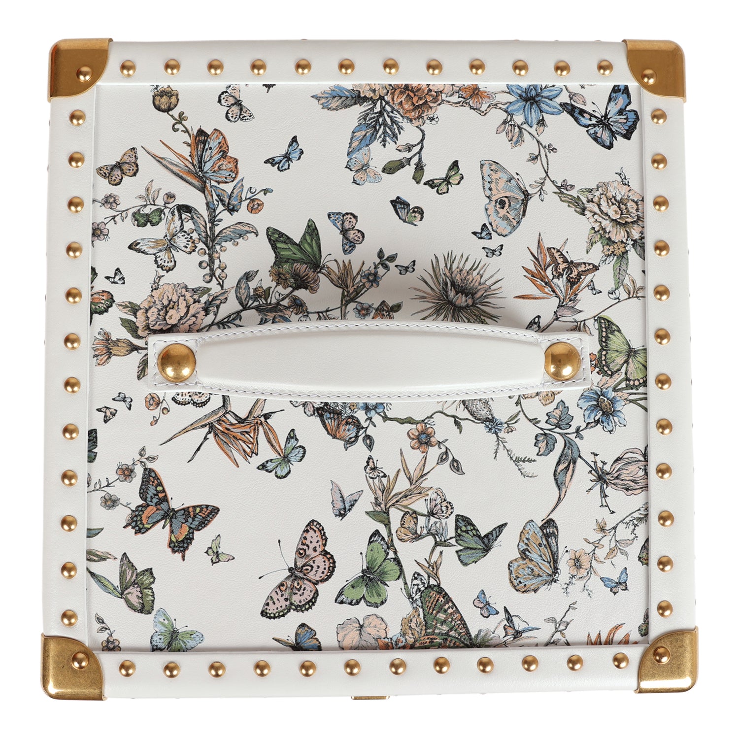 The Micro Lady Dior also comes in a White Multicolored Calfskin Leather Small Trunk. The Trunk also features a butterfly and floral motif in calfskin leather, Antique Gold Hardware, gold studs along the top, side and bottom, gold metal clasp closure, and soft suede/fabric interior.