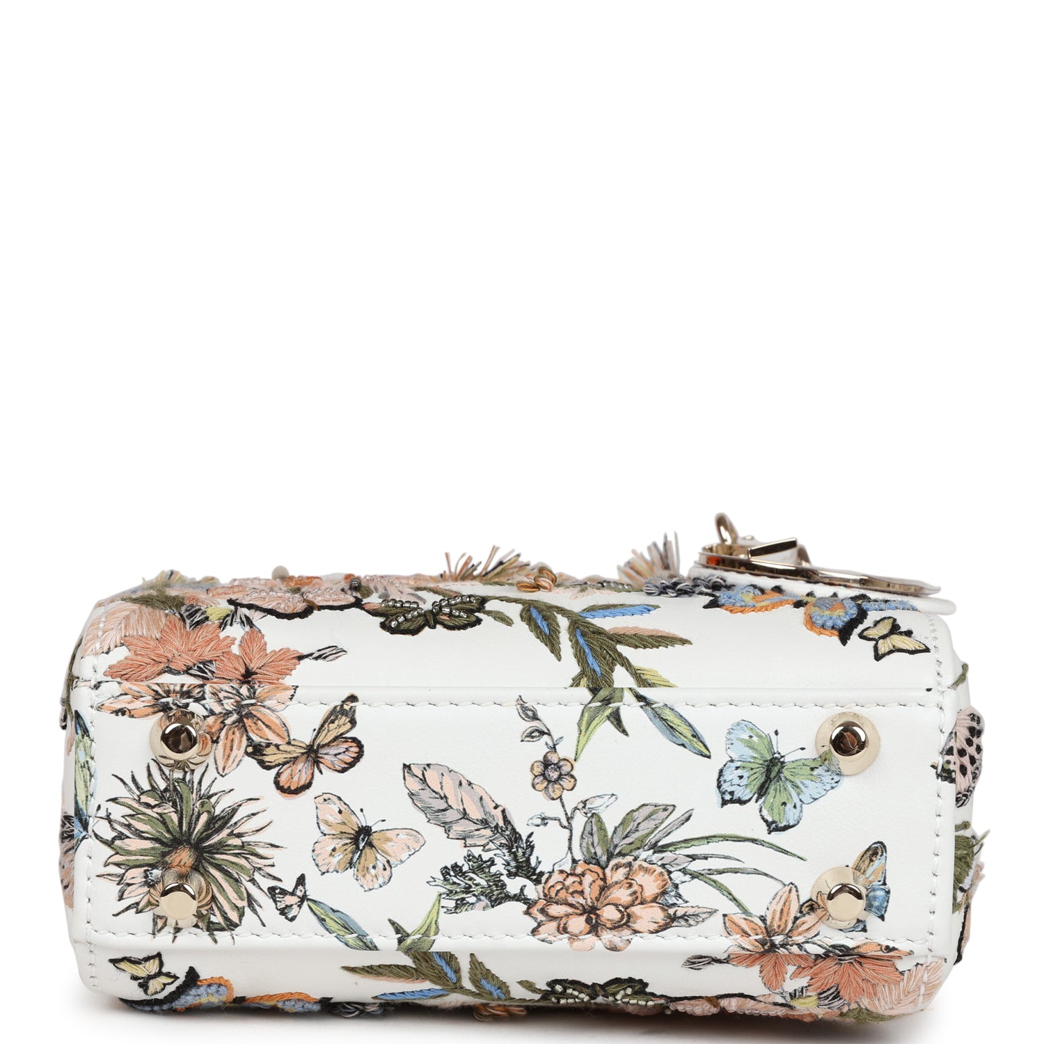 This Limited Edition Christian Dior Mirco Lady Dior Bag is in White/Multicolored Embroidered Calfskin with Light Gold Hardware, features butterfly and flower garden motif with 3D-like embroidered flowers and butterflies all over bag, tonal stitching, DIOR logo charm hanging from bag, two flat leather top handles, flap closure and removable shoulder strap.