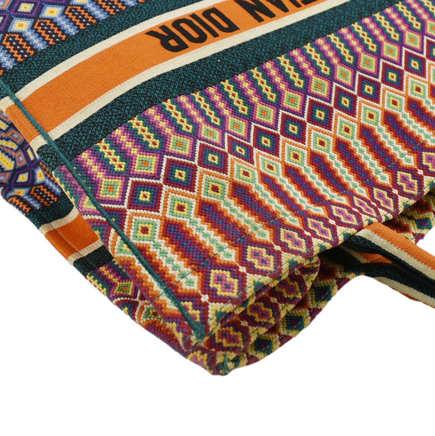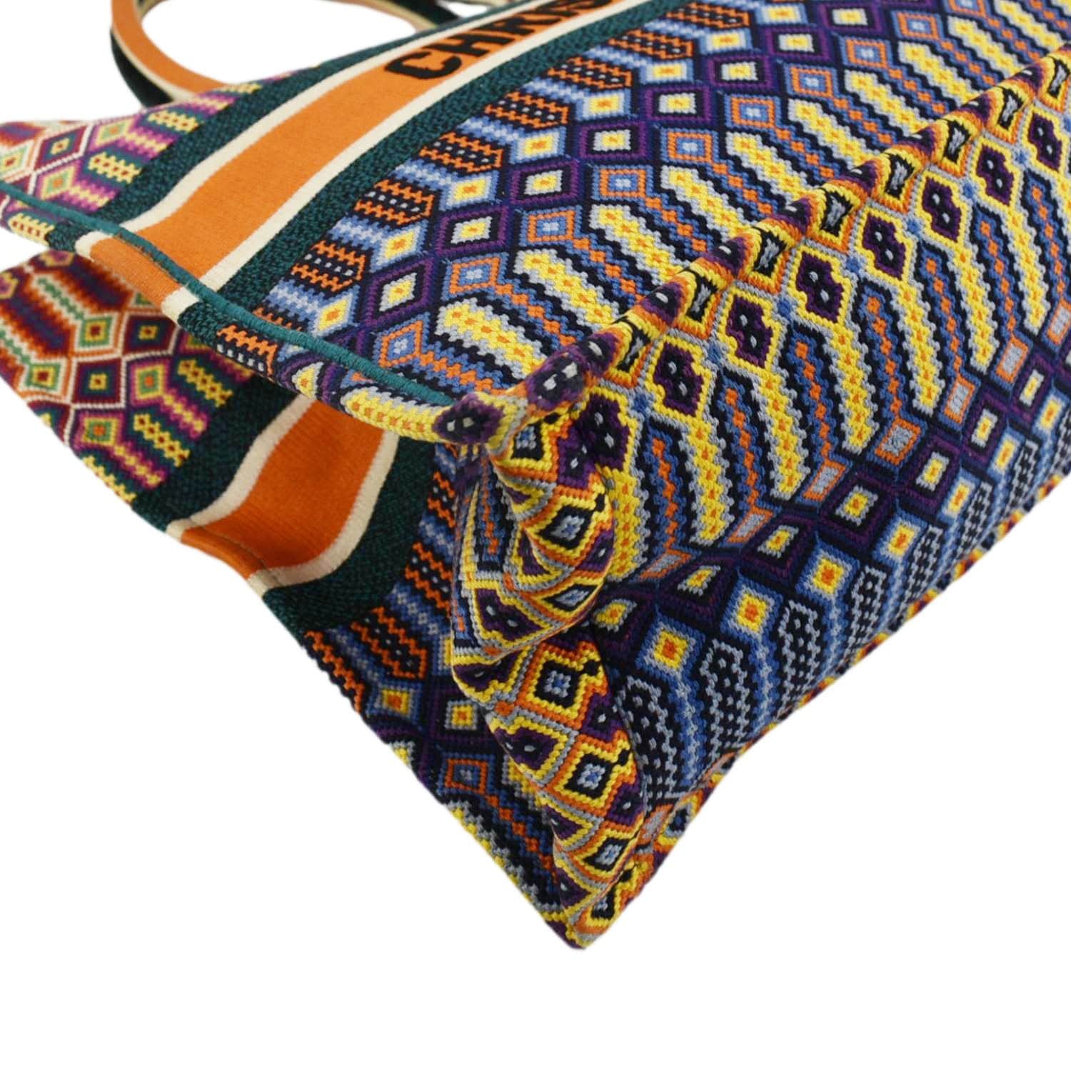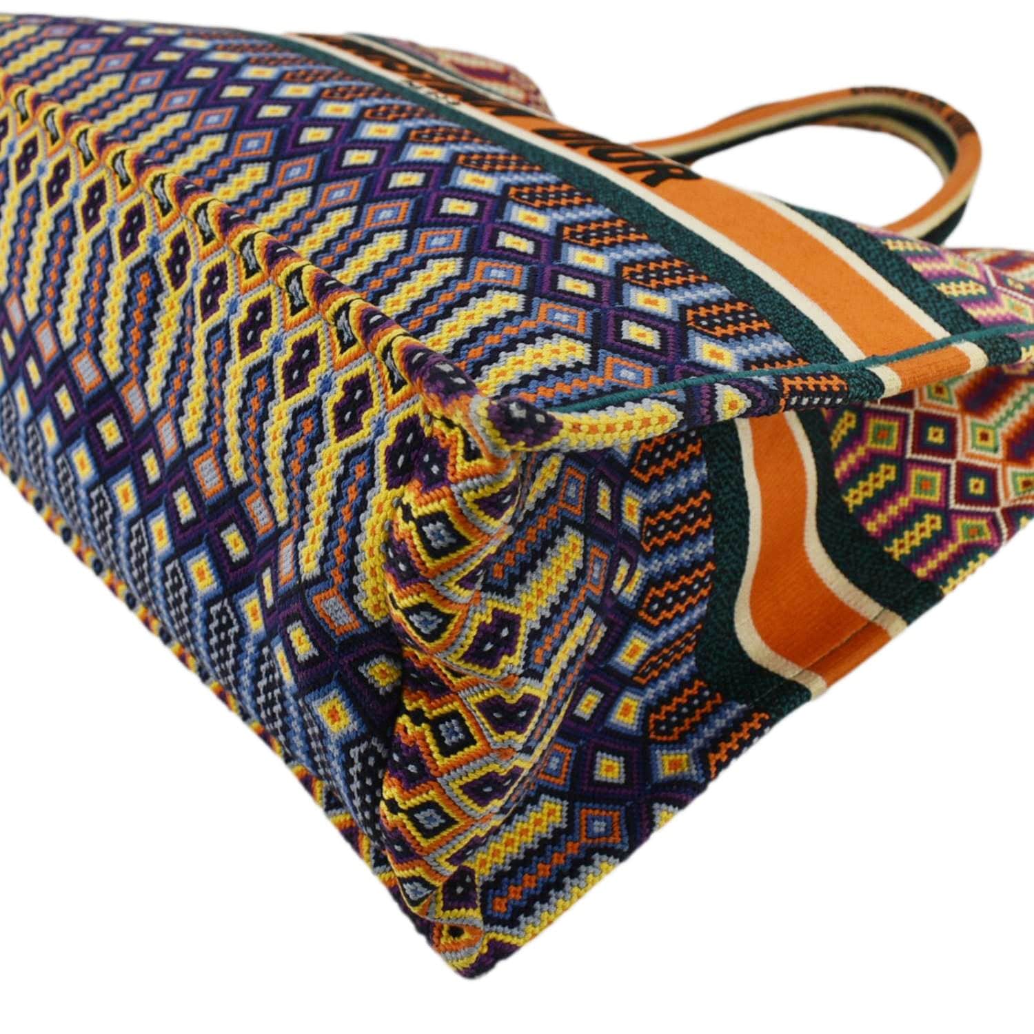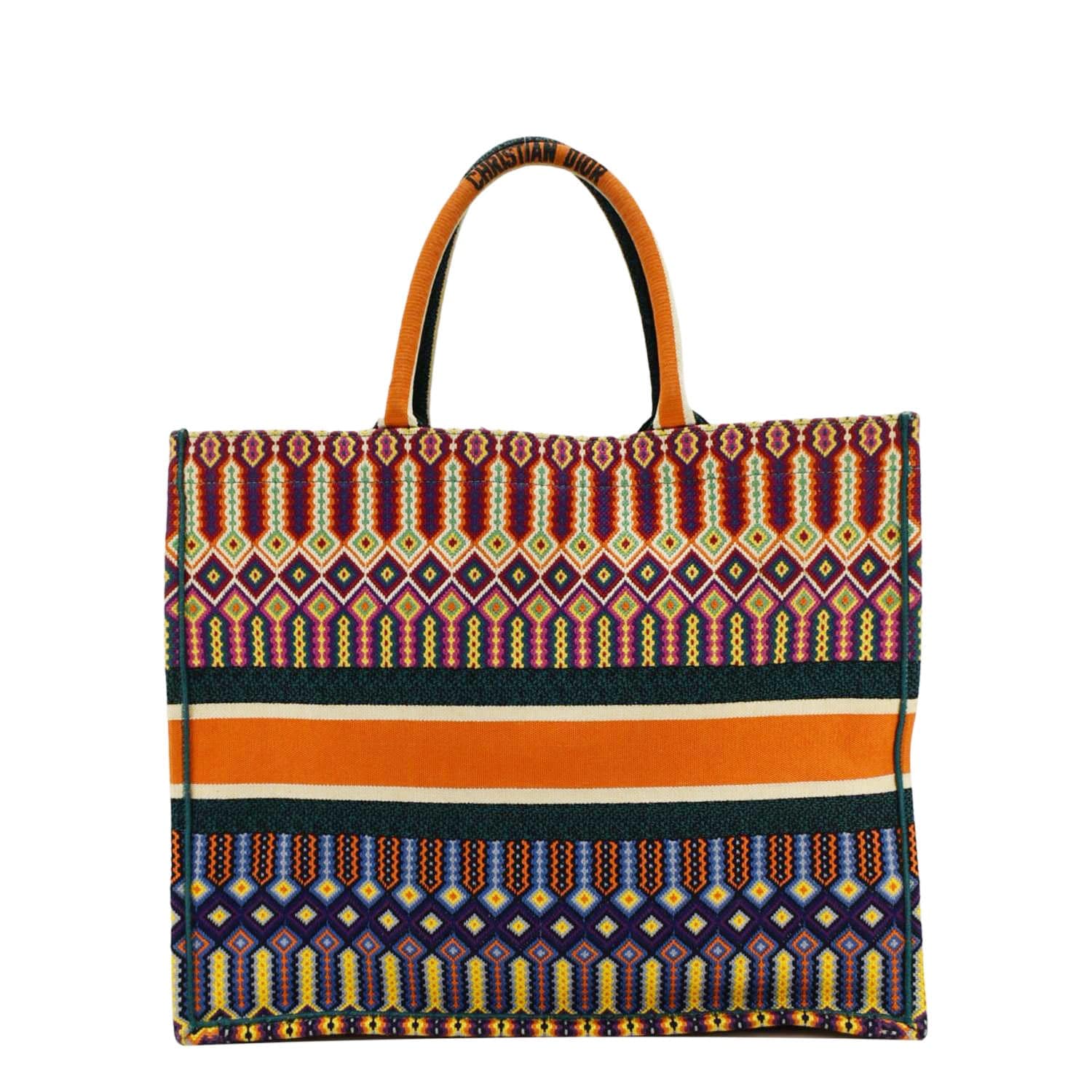 The CHRISTIAN DIOR Book Large Canvas Tote in Multicolor features vibrant prints on durable canvas with the "Christian Dior" logo prominently displayed. Its spacious design makes it both a stylish and practical carryall.