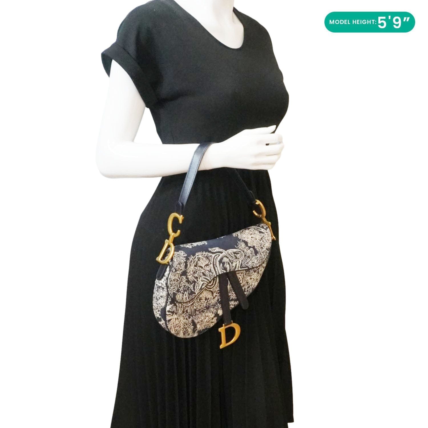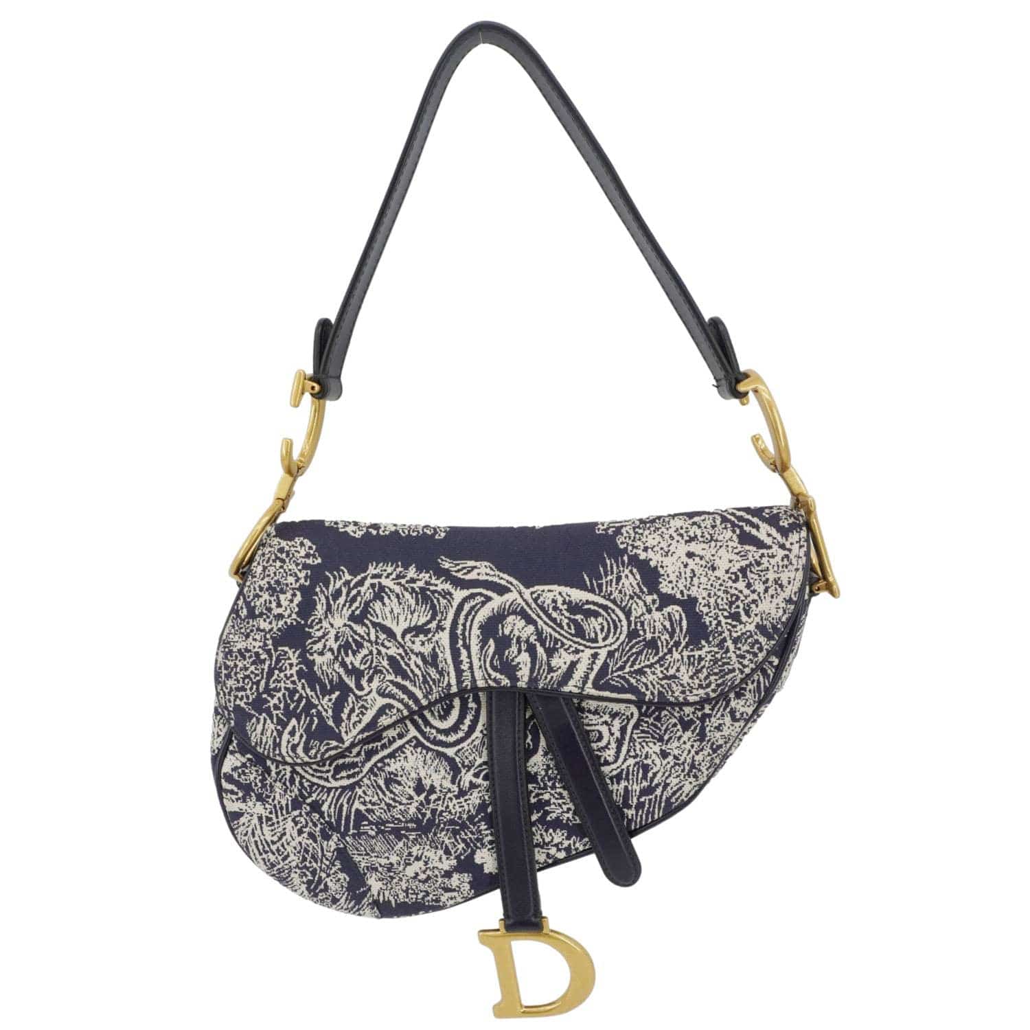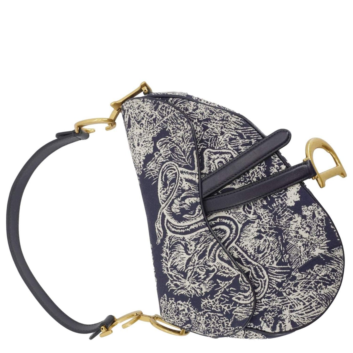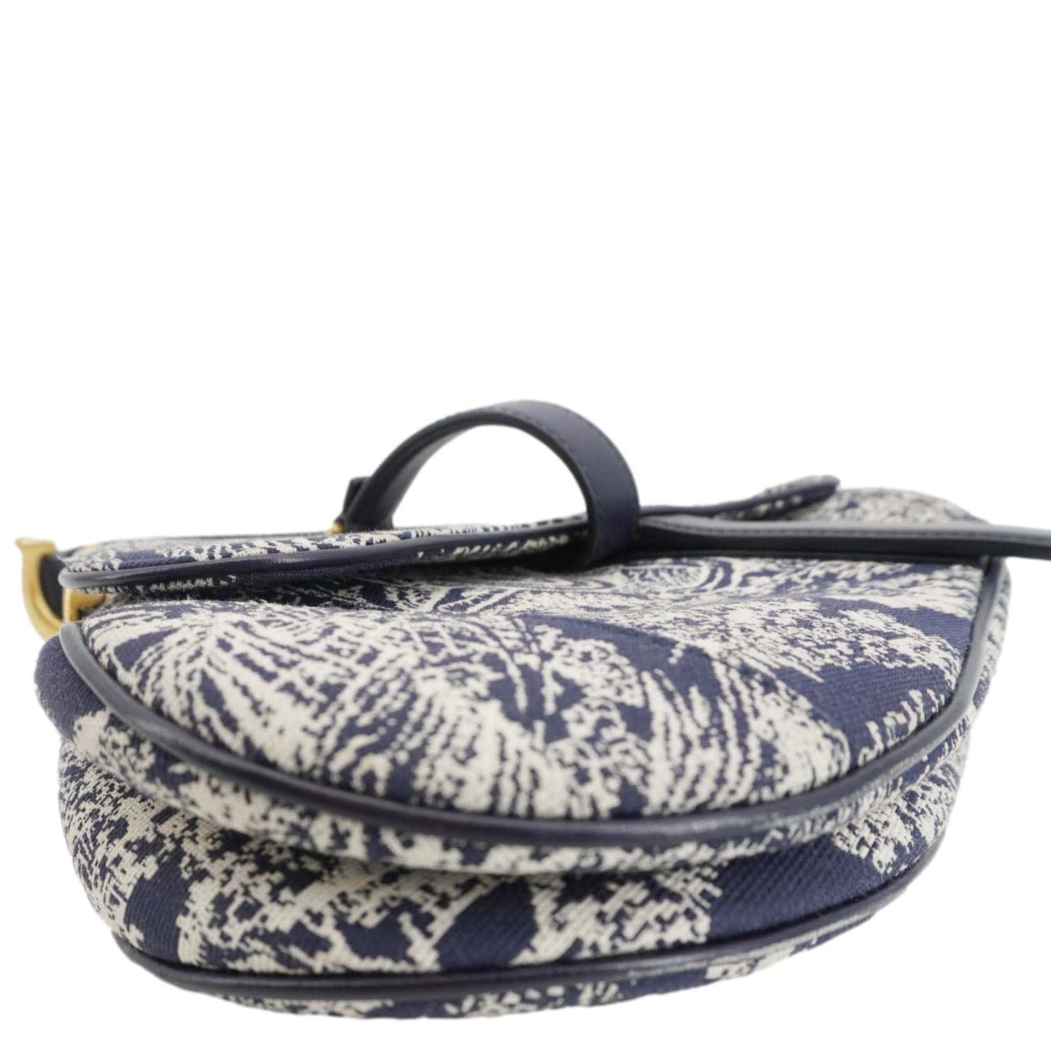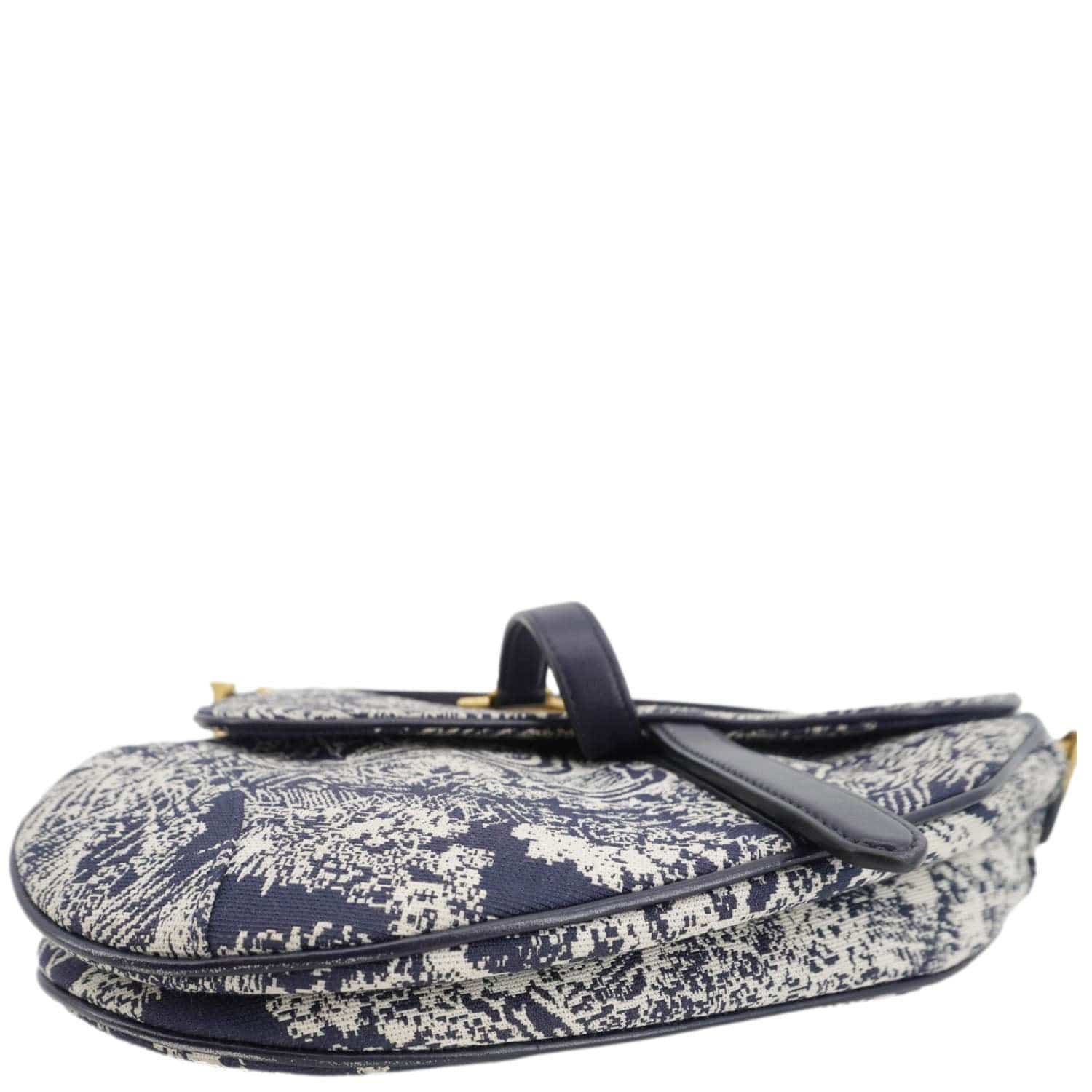 The Christian Dior Saddle Reverse Embroidered Toile Crossbody Bag in blue features the iconic saddle silhouette, intricate embroidery, and an adjustable strap for a bold yet elegant look.
