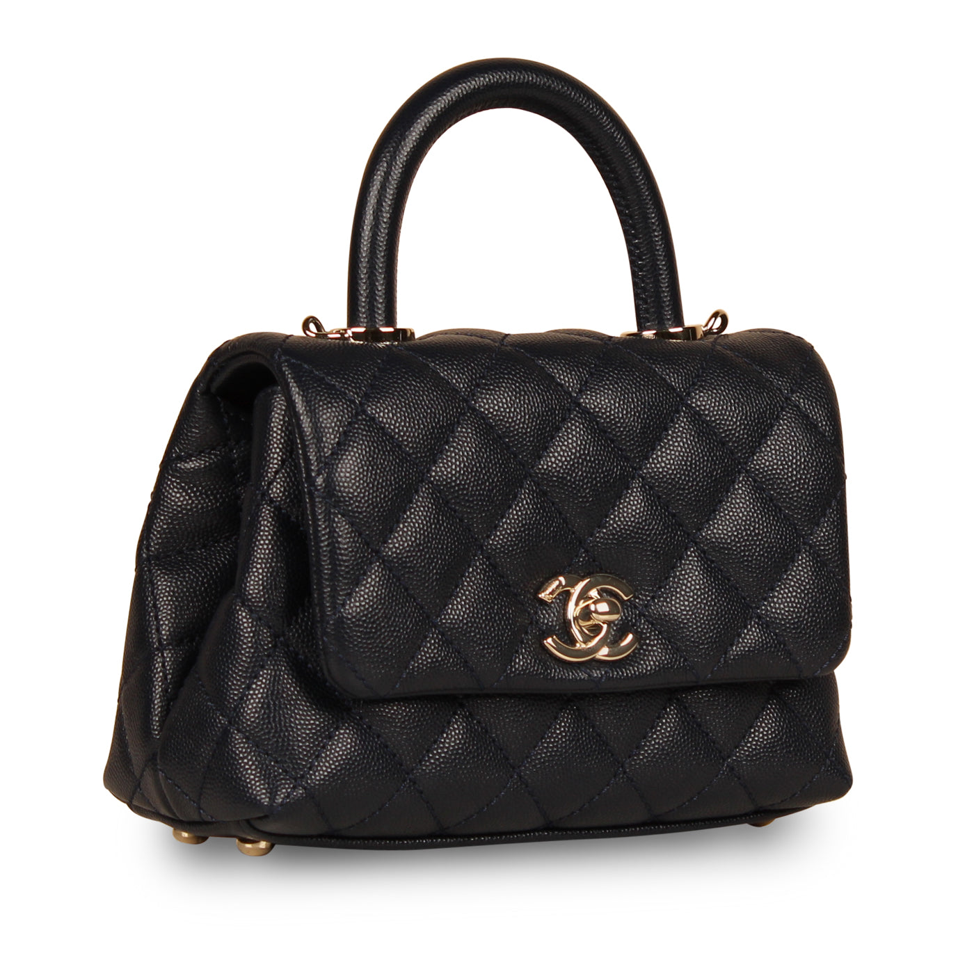 Crafted from caviar leather, Chanel presents the Extra Mini Coco Top Handle bag. Featuring champagne gold tone hardware, an interwoven chain / leather shoulder strap and a durable top handle, the Coco is the perfect balance between timeless elegance and modern edginess. Sophisticated and feminine yet perfectly in tune with modern fashion, this gorgeous bag is the ideal piece to compliment anything in your wardrobe. No matter the occasion, the Coco Top Handle can easily hold all your essentials from day to night while keeping you sleek and stylish. An investment piece you won't regret purchasing, this exquisite handbag is a true must-have for any woman with a love for luxury and a soft spot for Chanel.