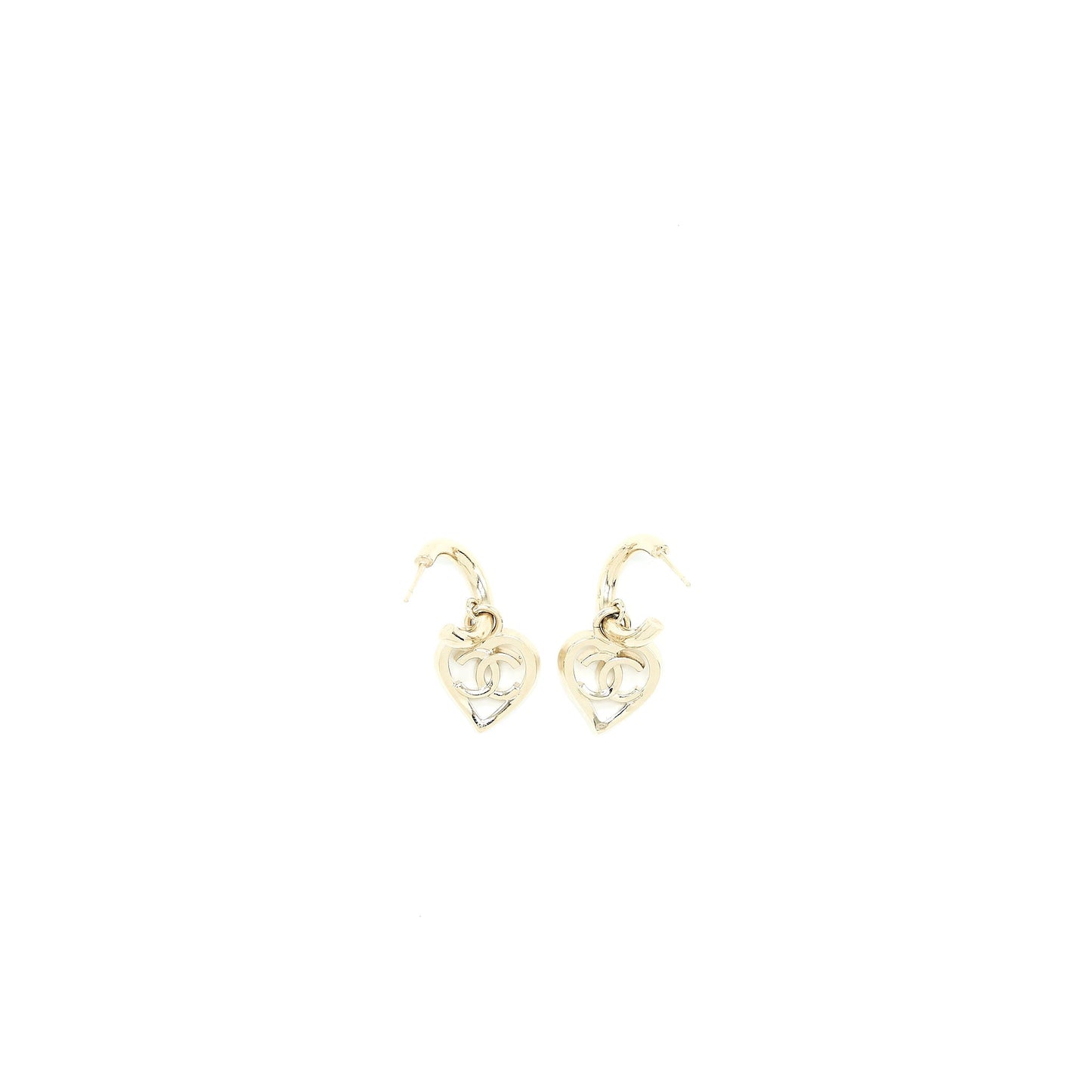 Chanel CC Logo Heart Drop Earrings Light Gold Tone